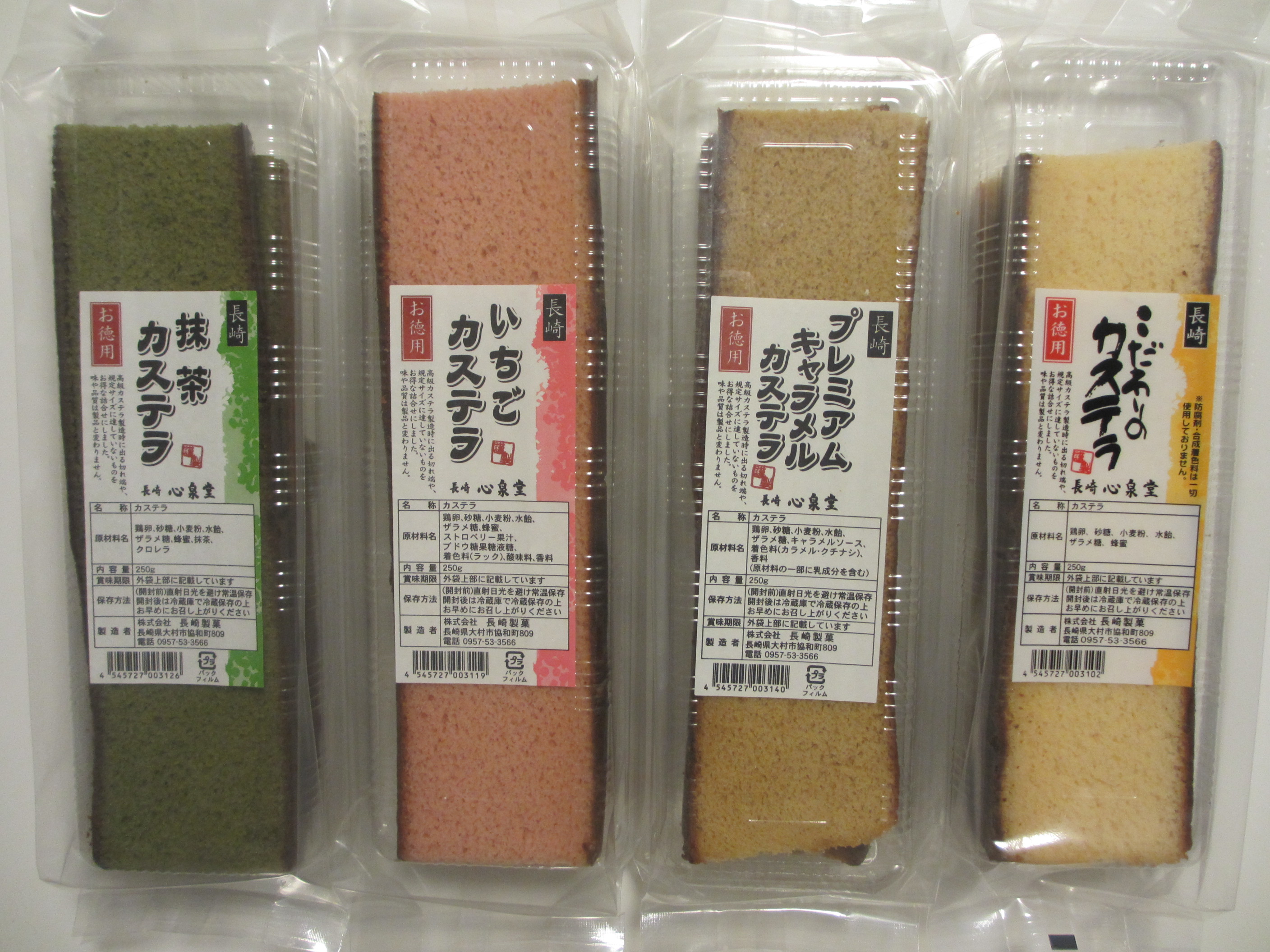 さらに、モンドセレクション金賞「幸せの黄色いカステラ(はちみつ)」をはじめ、いちご、抹茶、キャラメル、チーズの5種類(各250g、縦27.5cm×横8.5cm×高さ4.0cm)から4つの味が選べます。