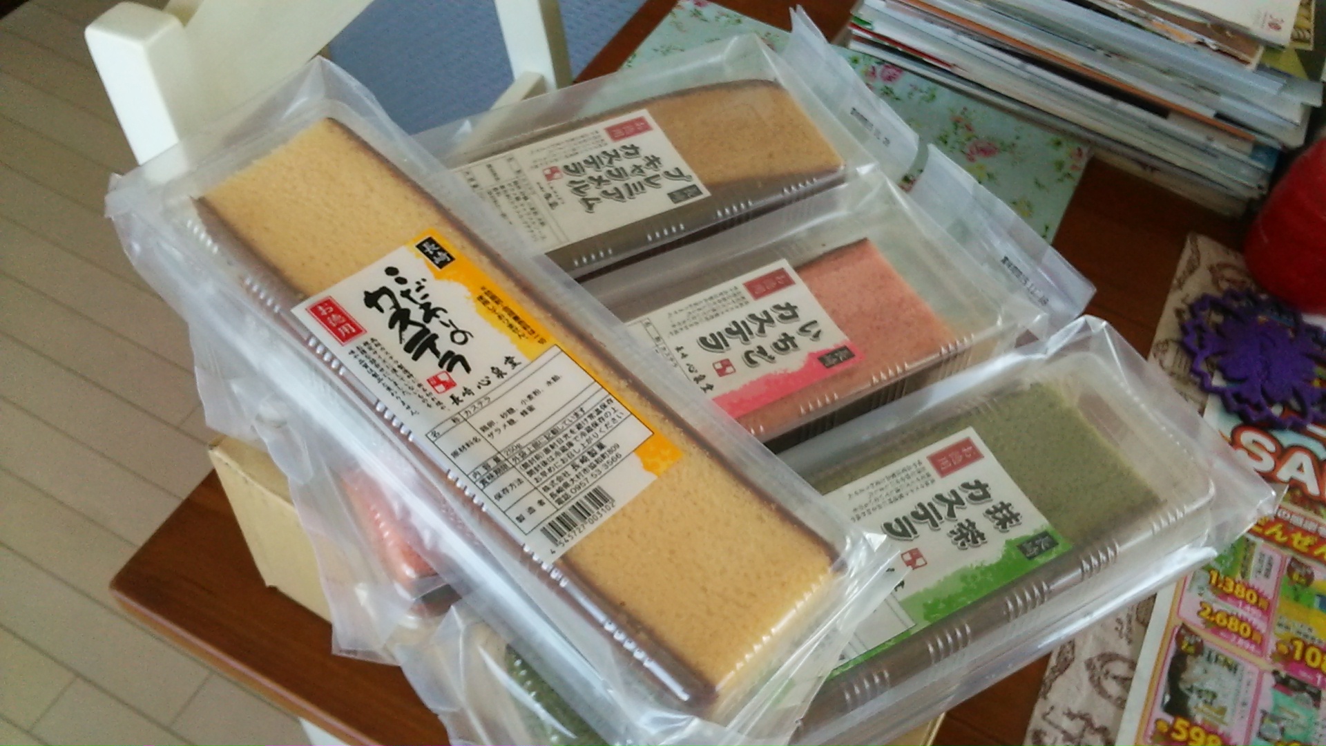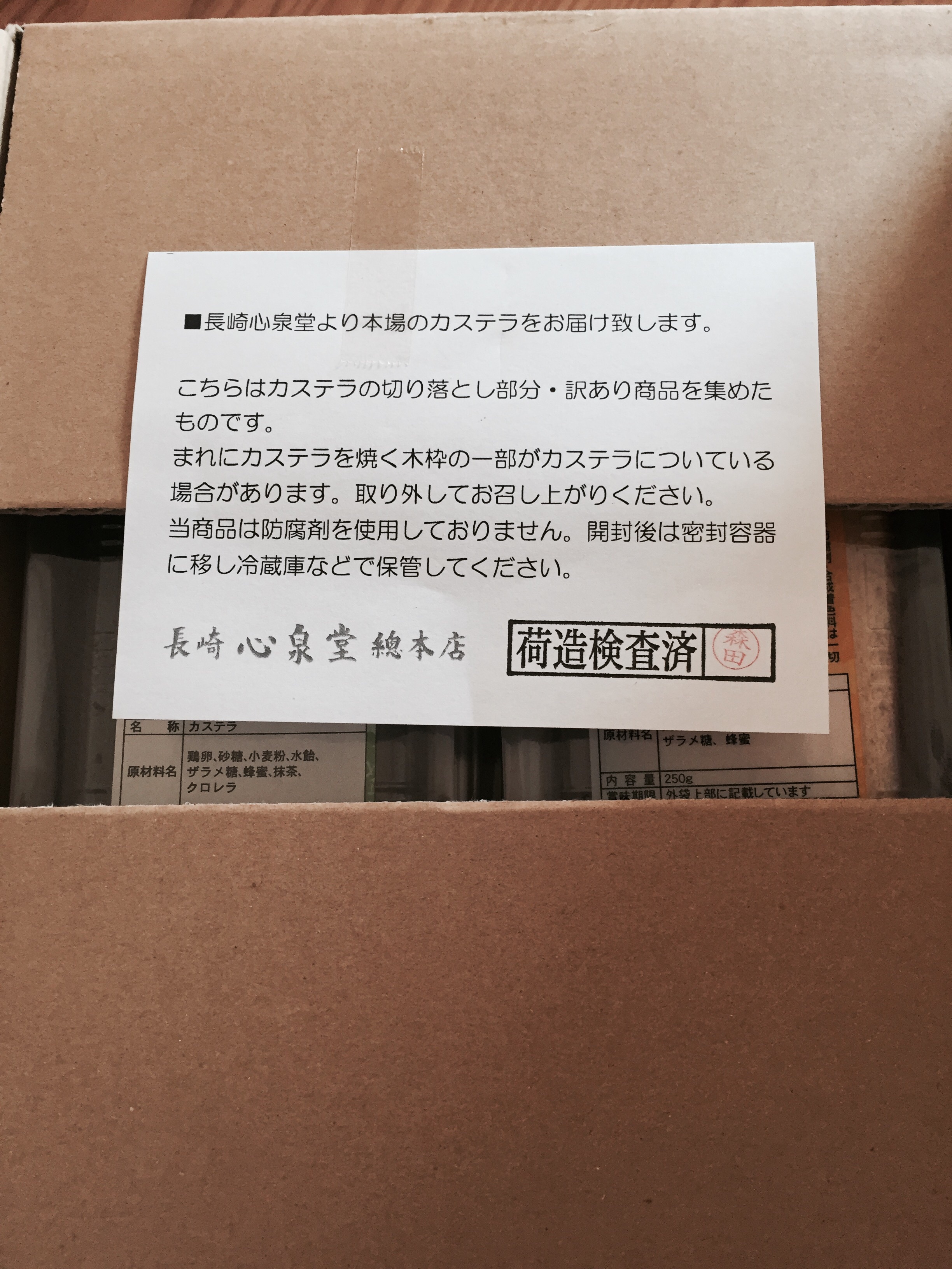 送られてきた状態は、簡易包装なので段ボール箱の中に250g×4本カステラ(写真)がどかんと入っていました。4種類の色がありきれいなカステラだと思いました。