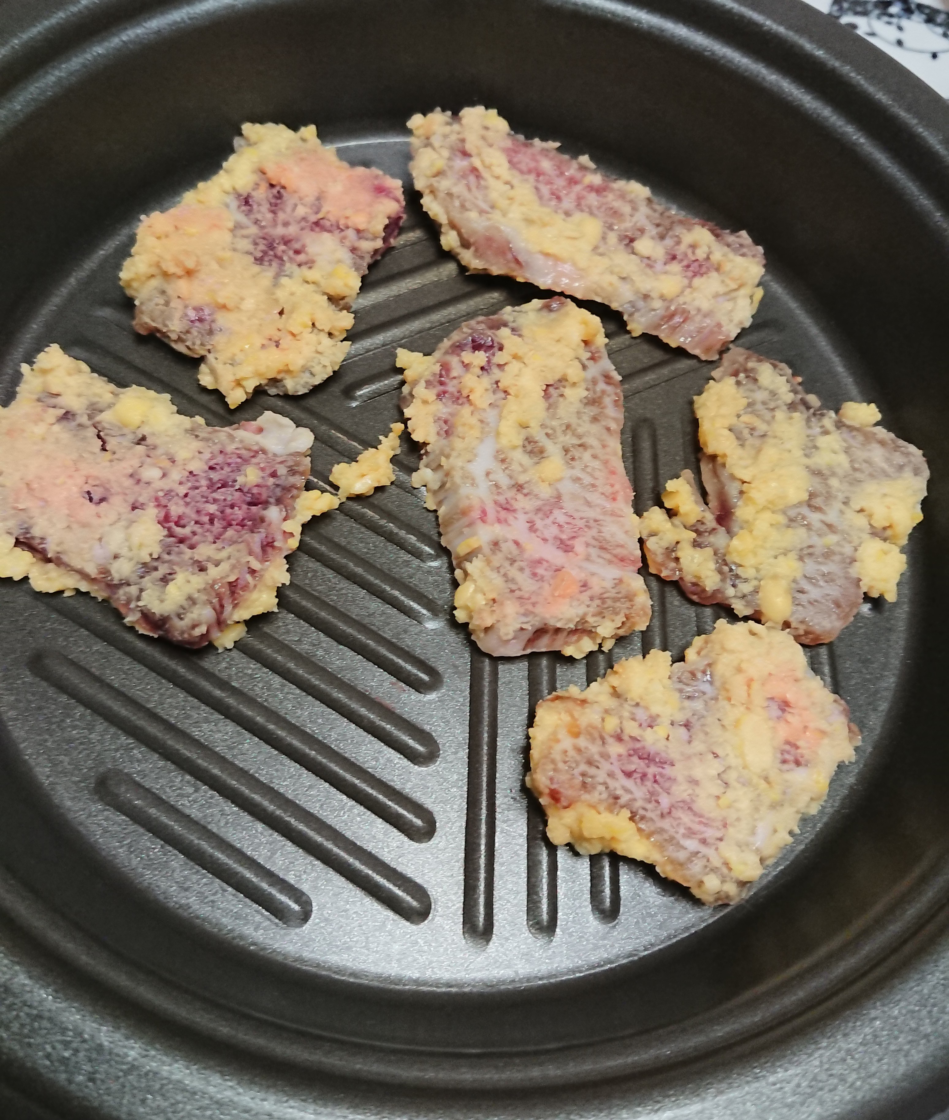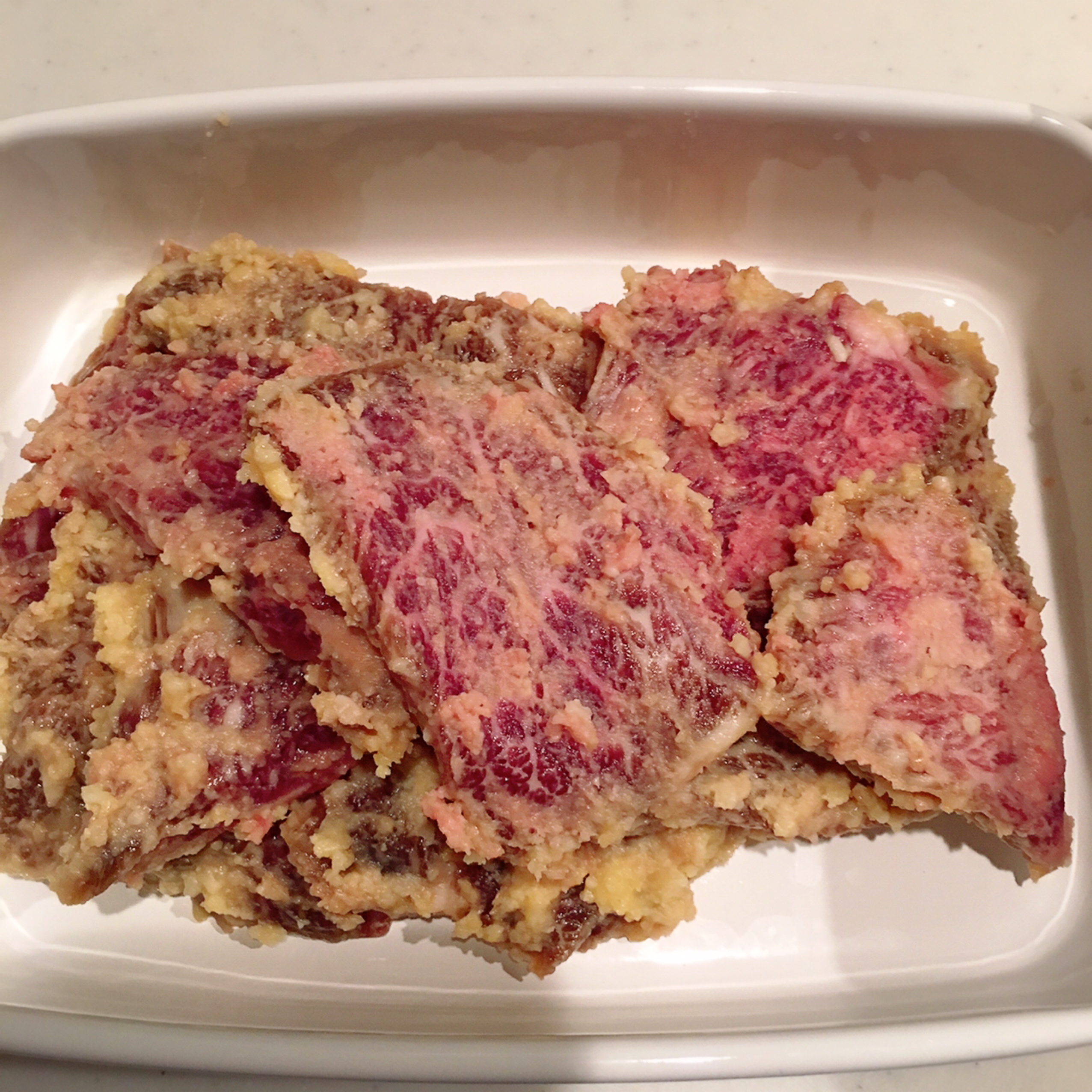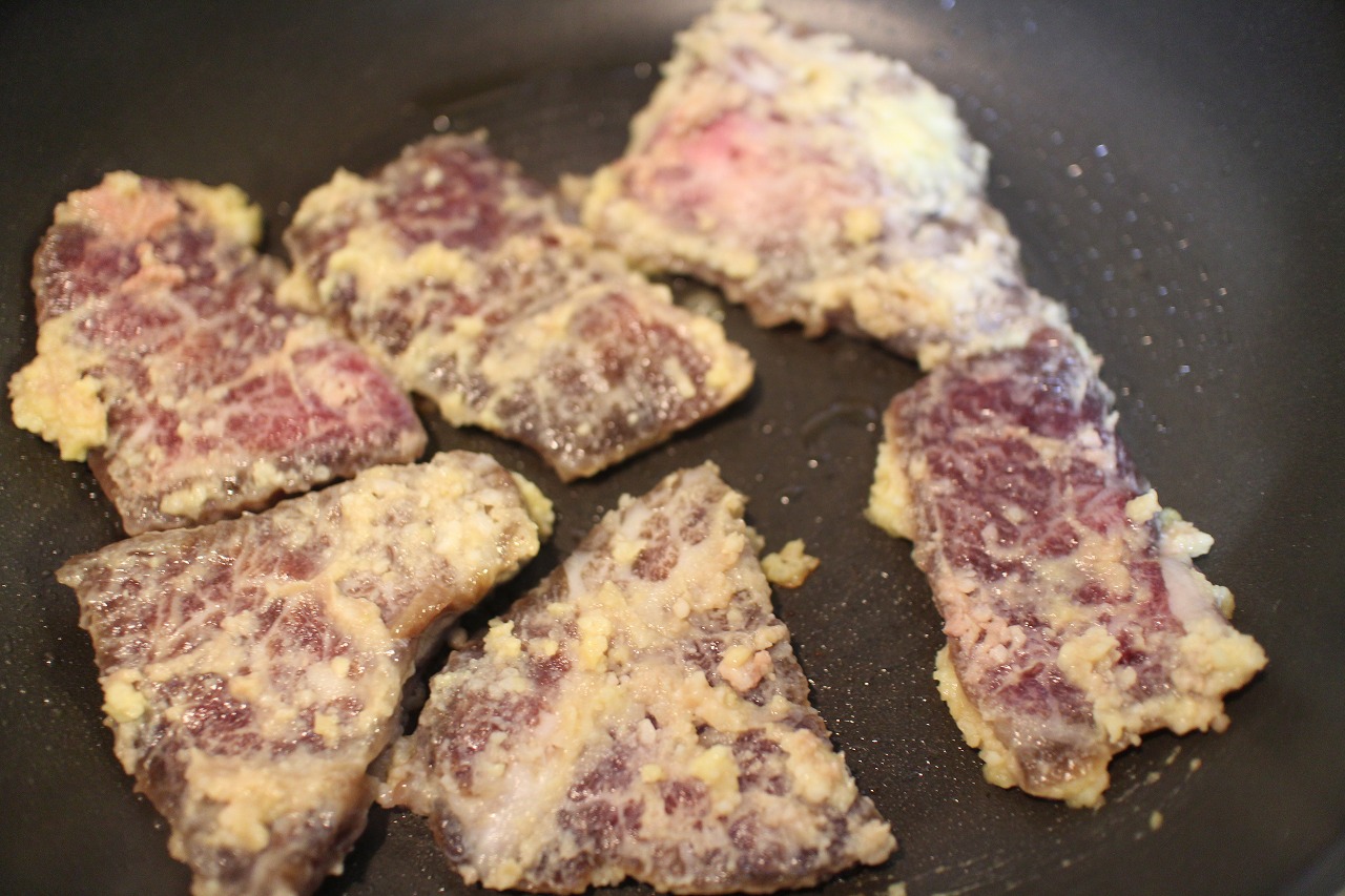 金に輝く白みその中から、じっくり漬け込まれたオリーブ牛を探して下さい。白みそを少し残したまま、熱したフライパンの上で中火でじっくり焼き上げてください。