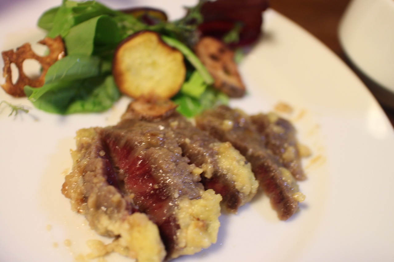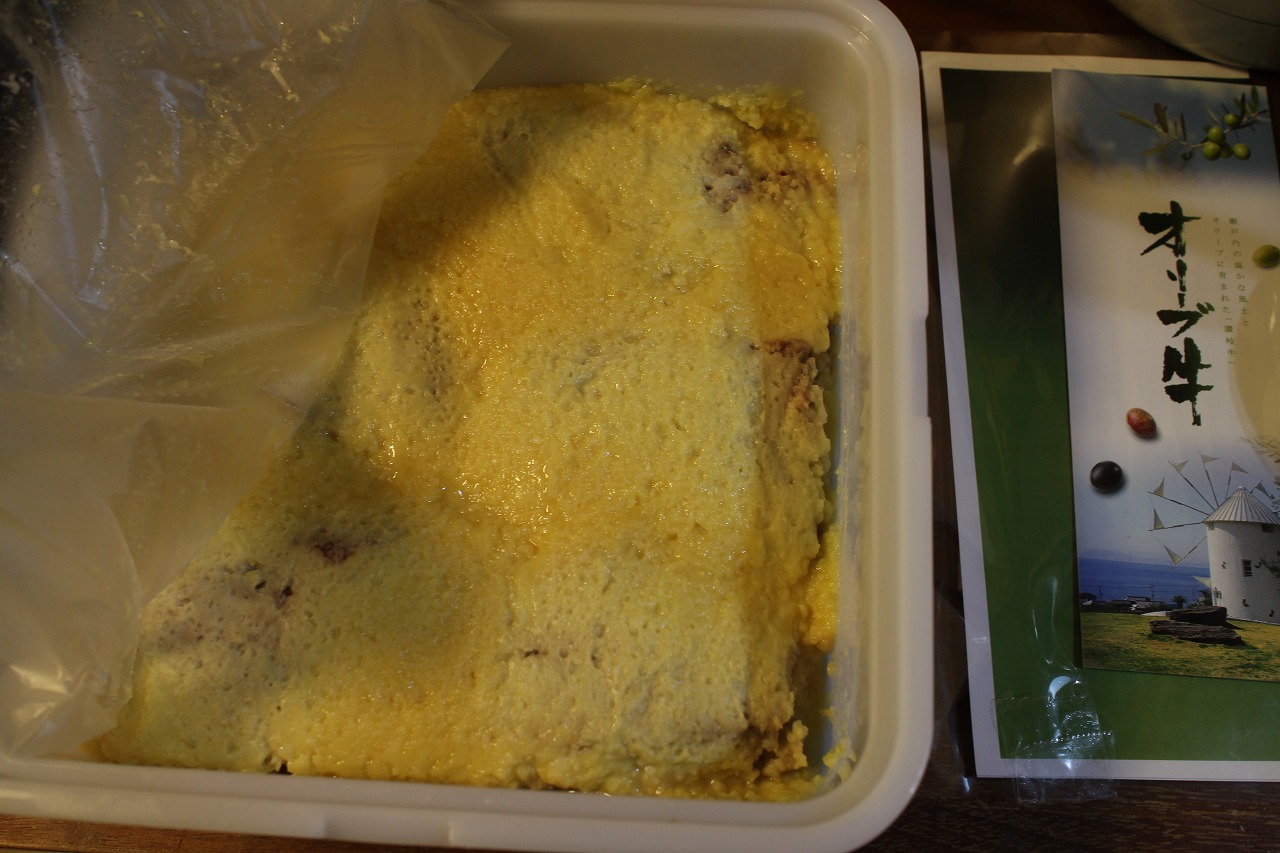 白みそを使っているということで、たっぷりの白みその中で綺麗なお肉がはいっています。オリーブ牛を初めていただきましたが、柔らかくて甘いお肉です。