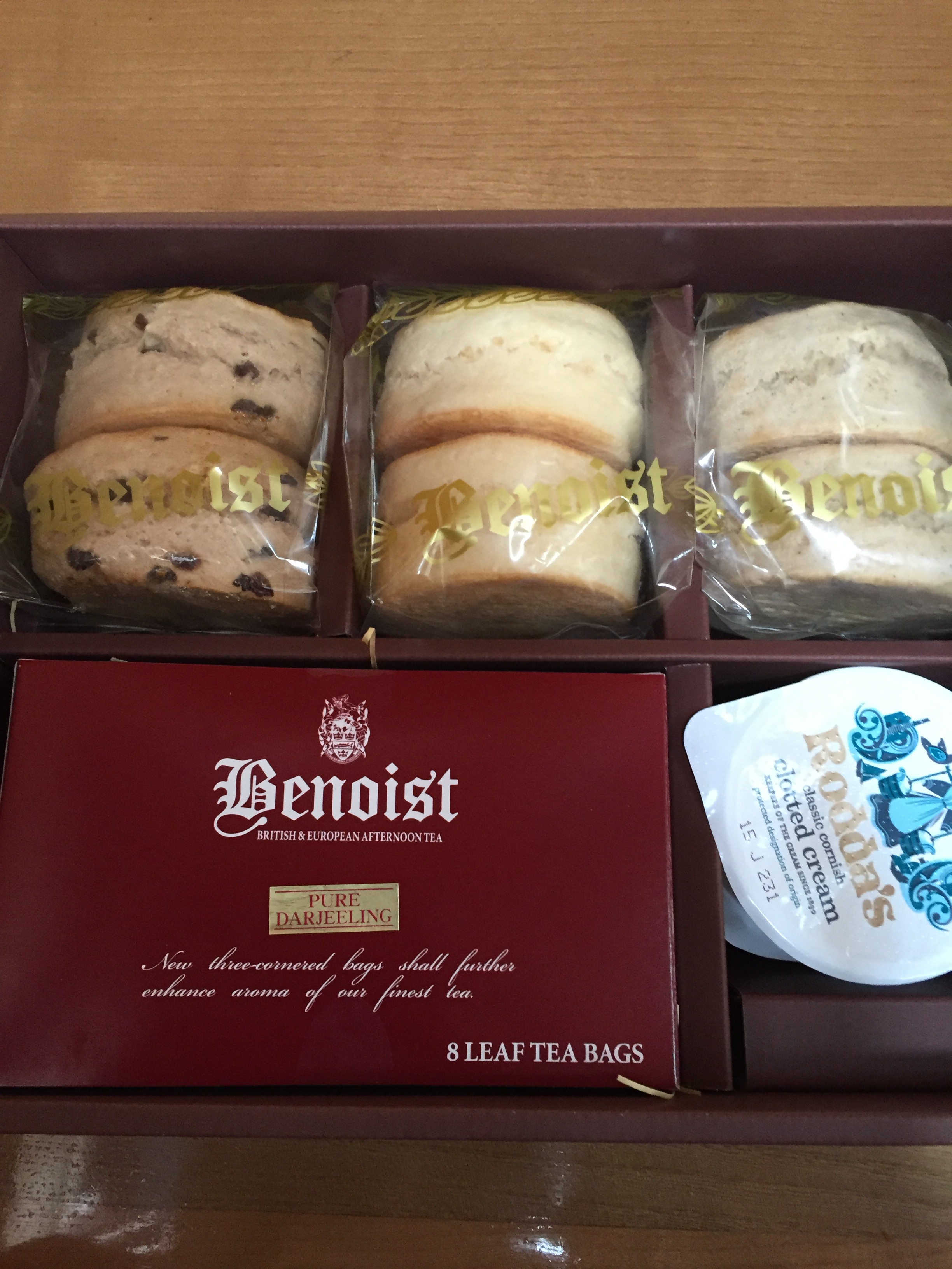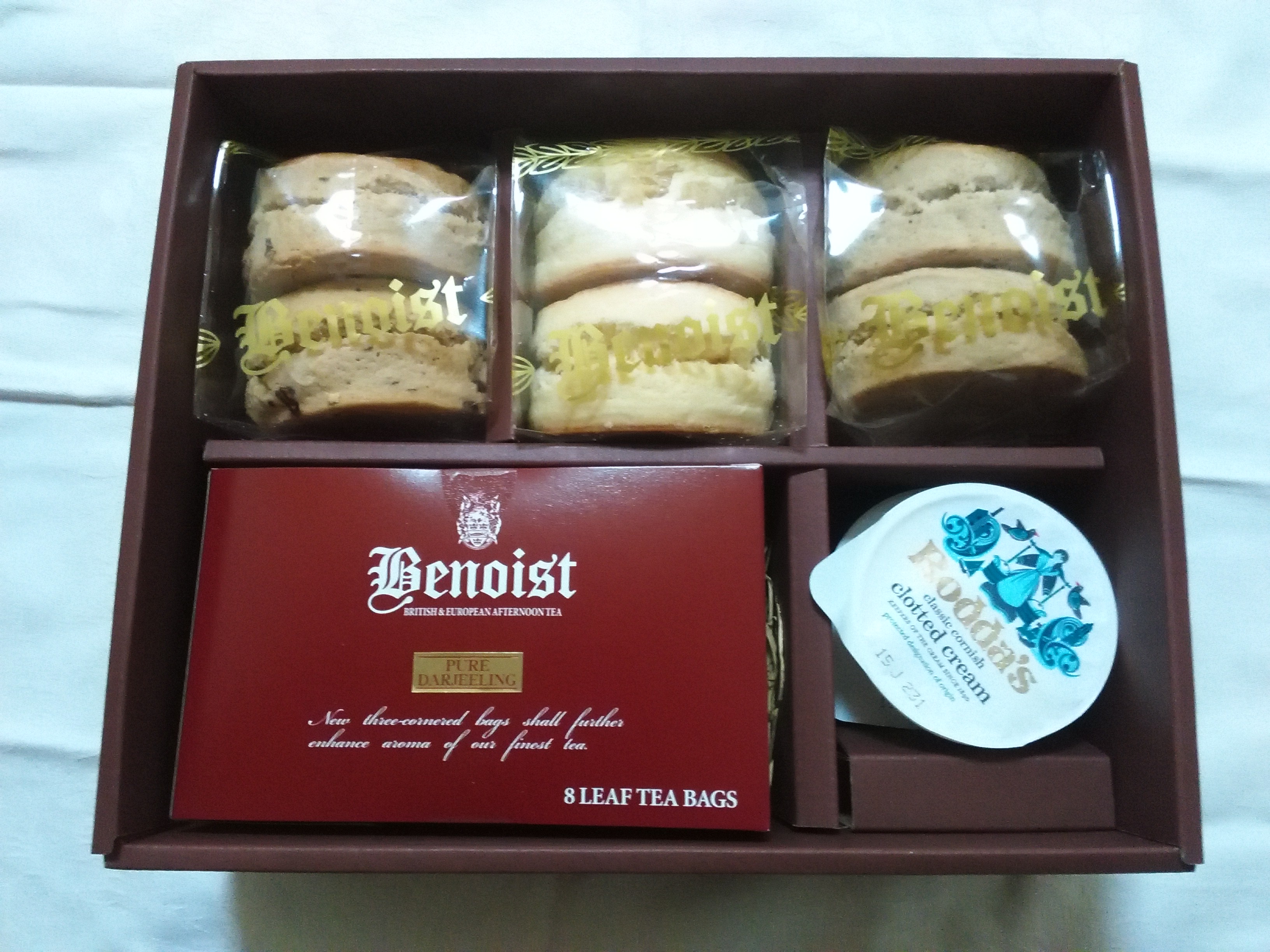 箱の中にはプレーン、カレンズ、紅茶の3種類*2個ずつのスコーンの他に、ダージリンの紅茶のティーバックが8P、そして憧れの英国直輸入のクロテッドクリーム40gが2個がセットになっていて、まさにスコーンをおいしく食べるセット内容ですね。