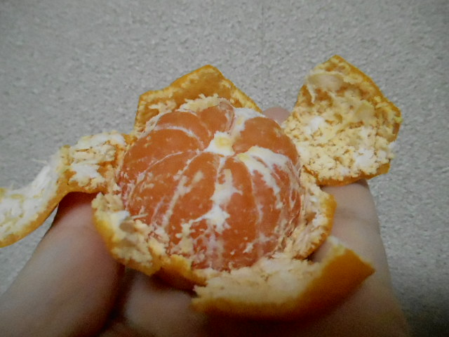 普段食べているみかんに比べると、外皮の柔らかさから違います。いつものように力を入れてむこうとしたら、実まで指が入ってしまいました。