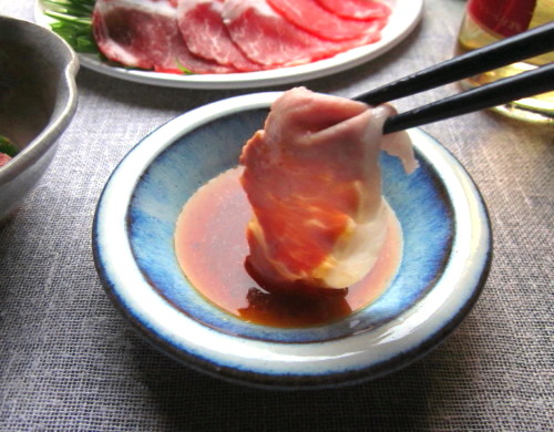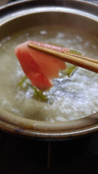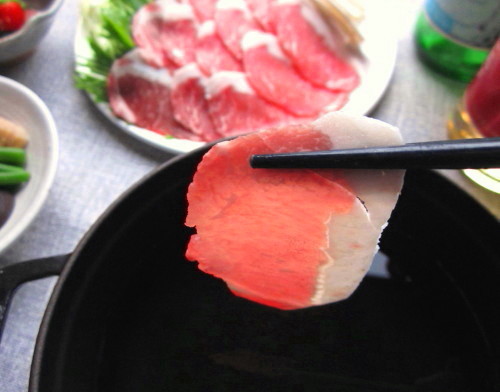 お肉はしゃぶしゃぶせずそのまま置いておき、赤い部分が消えた瞬間が食べ頃とのこと。