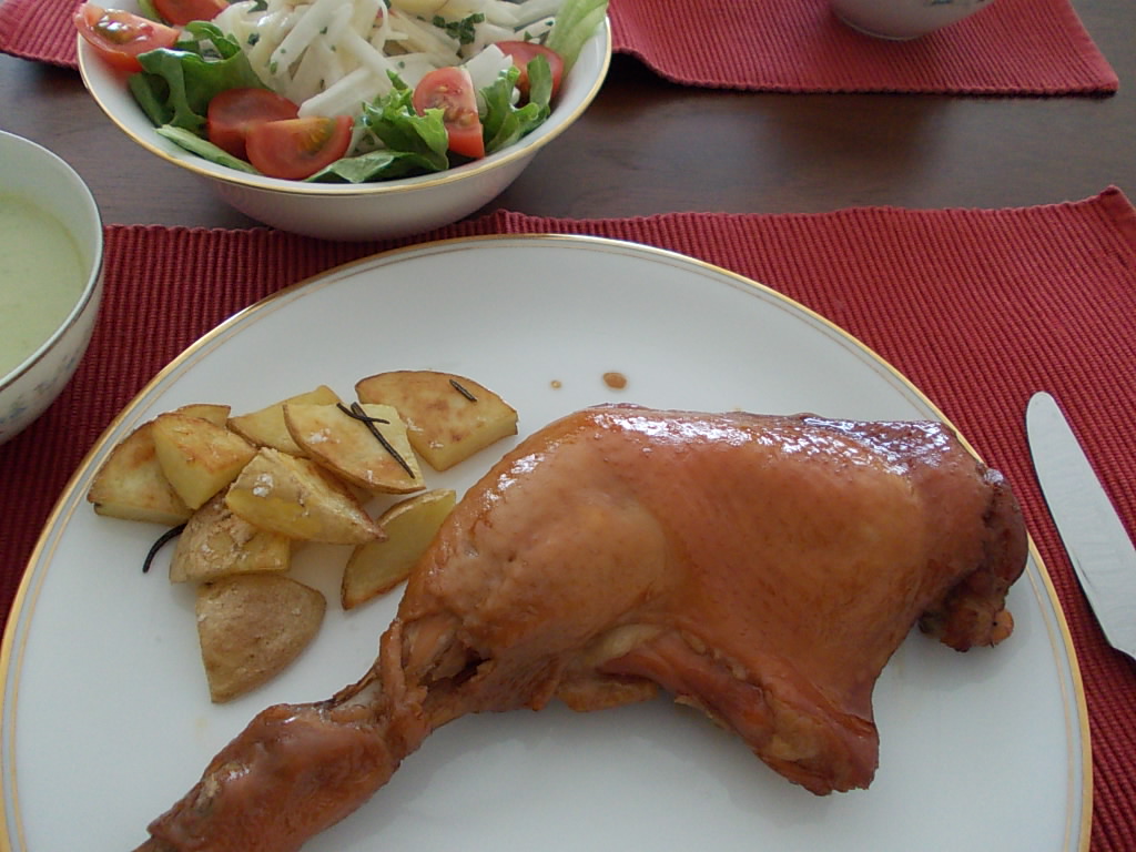 ローストチキンは湯せんで温めた後、オーブントースターで軽く焼くと香ばしさが増します!豪快にかぶり付く食べた方が、オススメです。