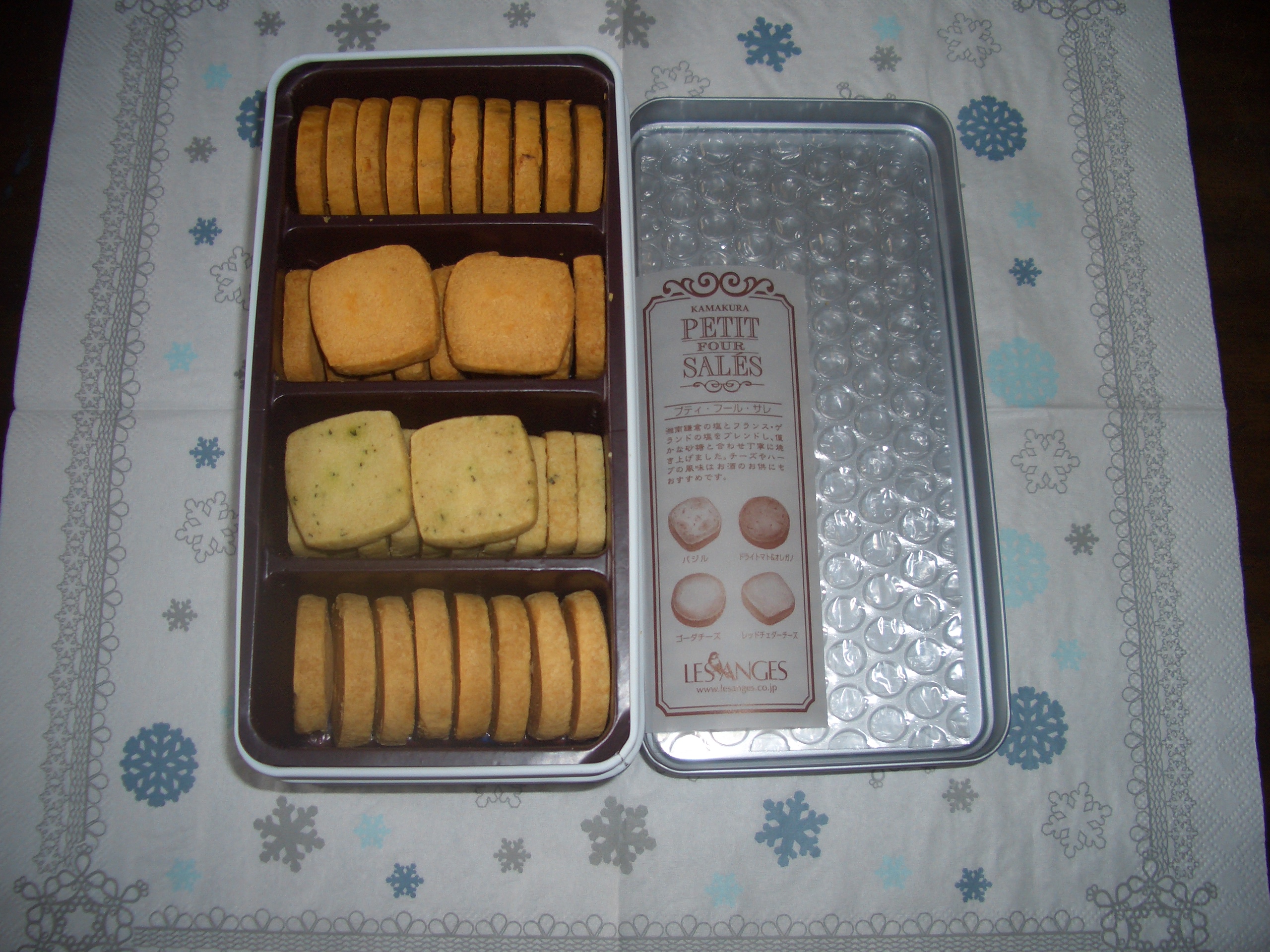 湘南鎌倉でわずかに作られる釜炊きの塩と、9世紀頃から永きに渡りパリュディエ(製塩職人)の手で頑なに守られた製法で作られるフランス・ゲランド塩をブレンドしたオリジナルの塩味クッキー。バジル、トマト&オレガノ、レッドチェダーチーズ、ゴーダチーズの4種類が詰合せになっています。