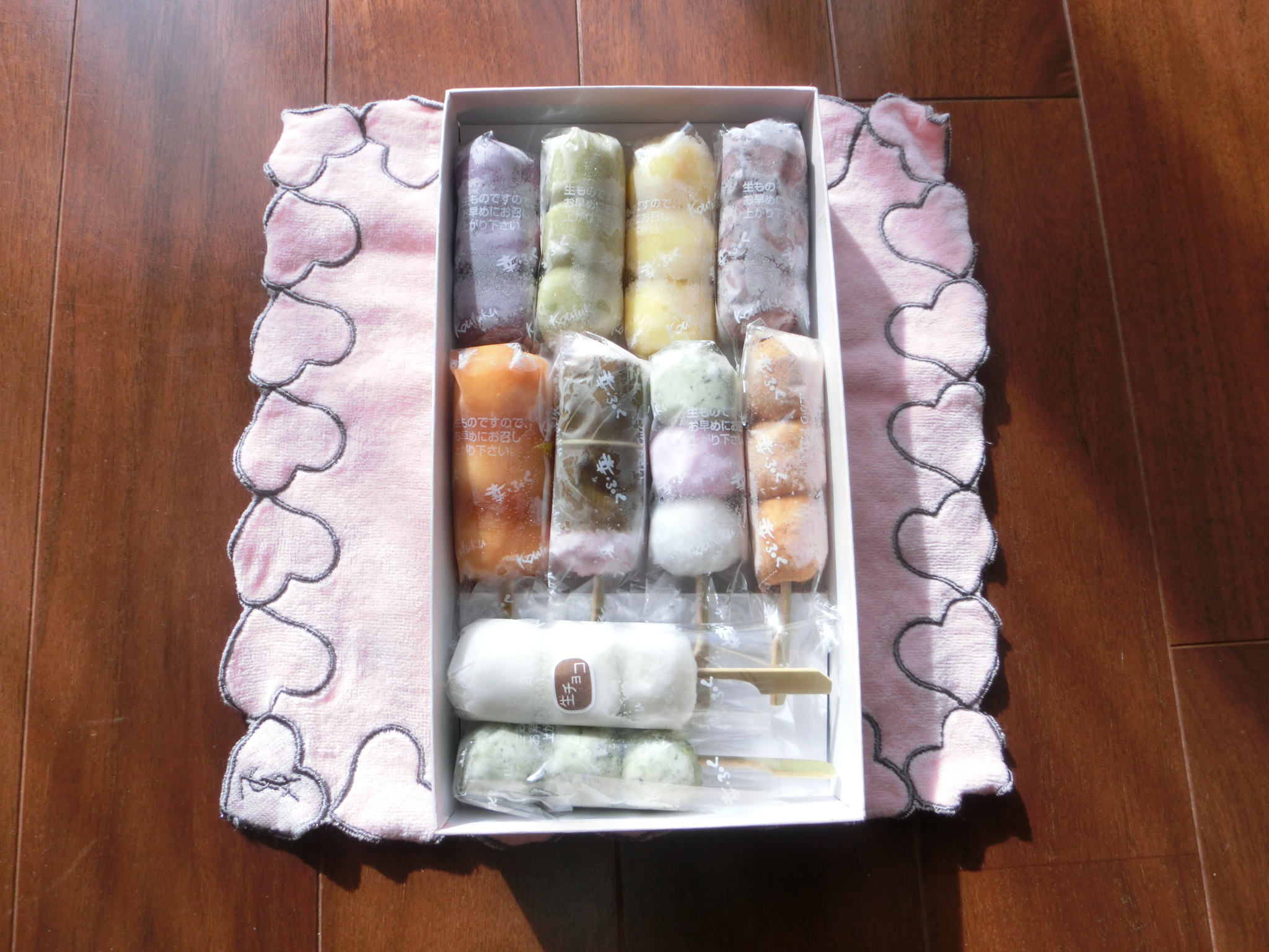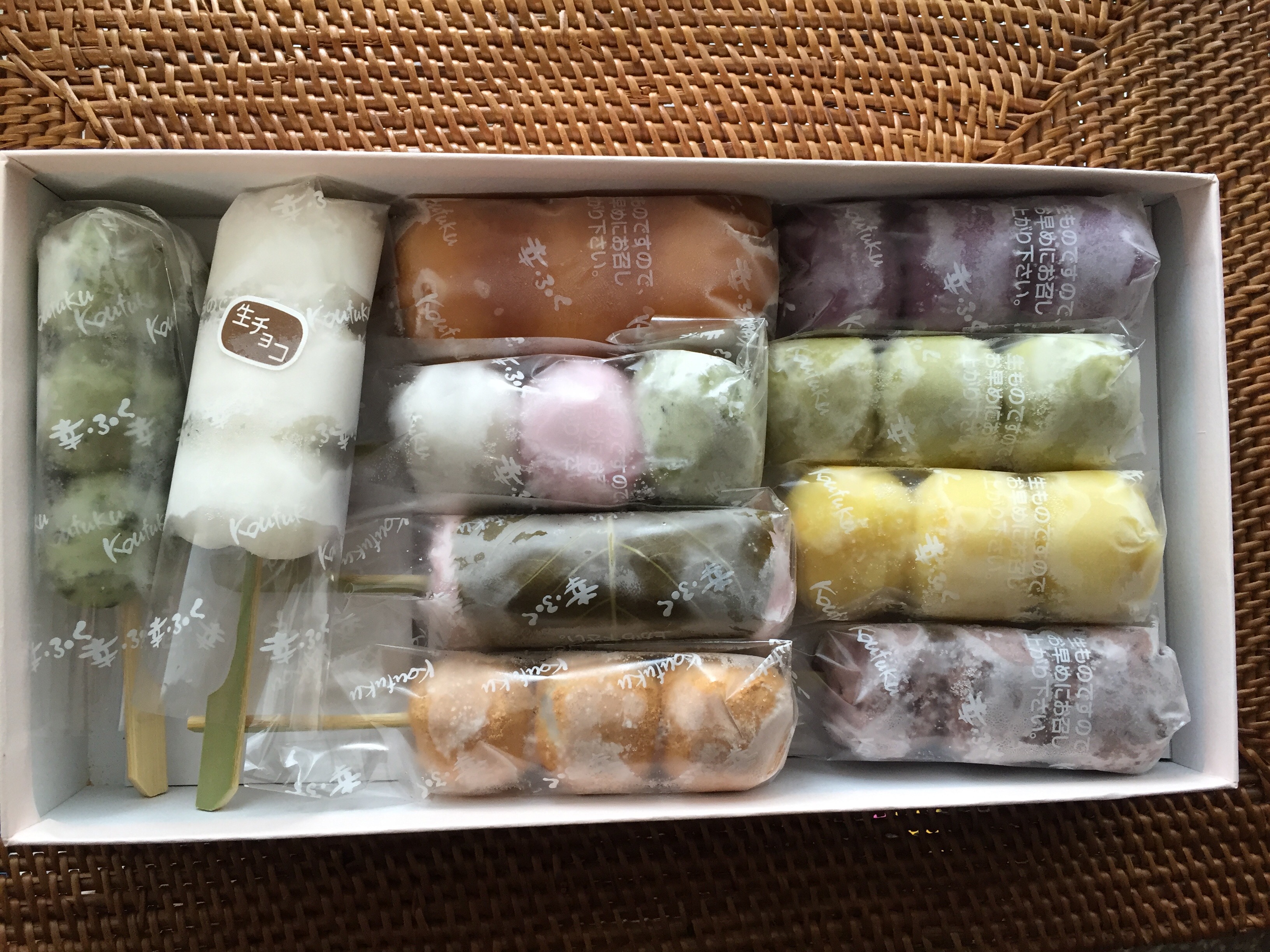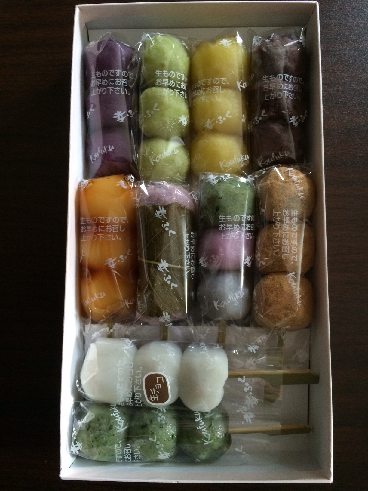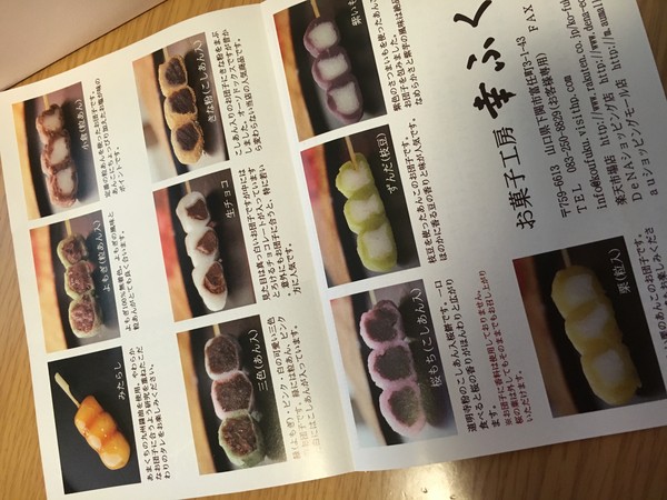 みたらし・小倉・3色・生チョコ・きなこ・よもぎ・桜もち・ずんだ・紫いも・栗あんの10種類。