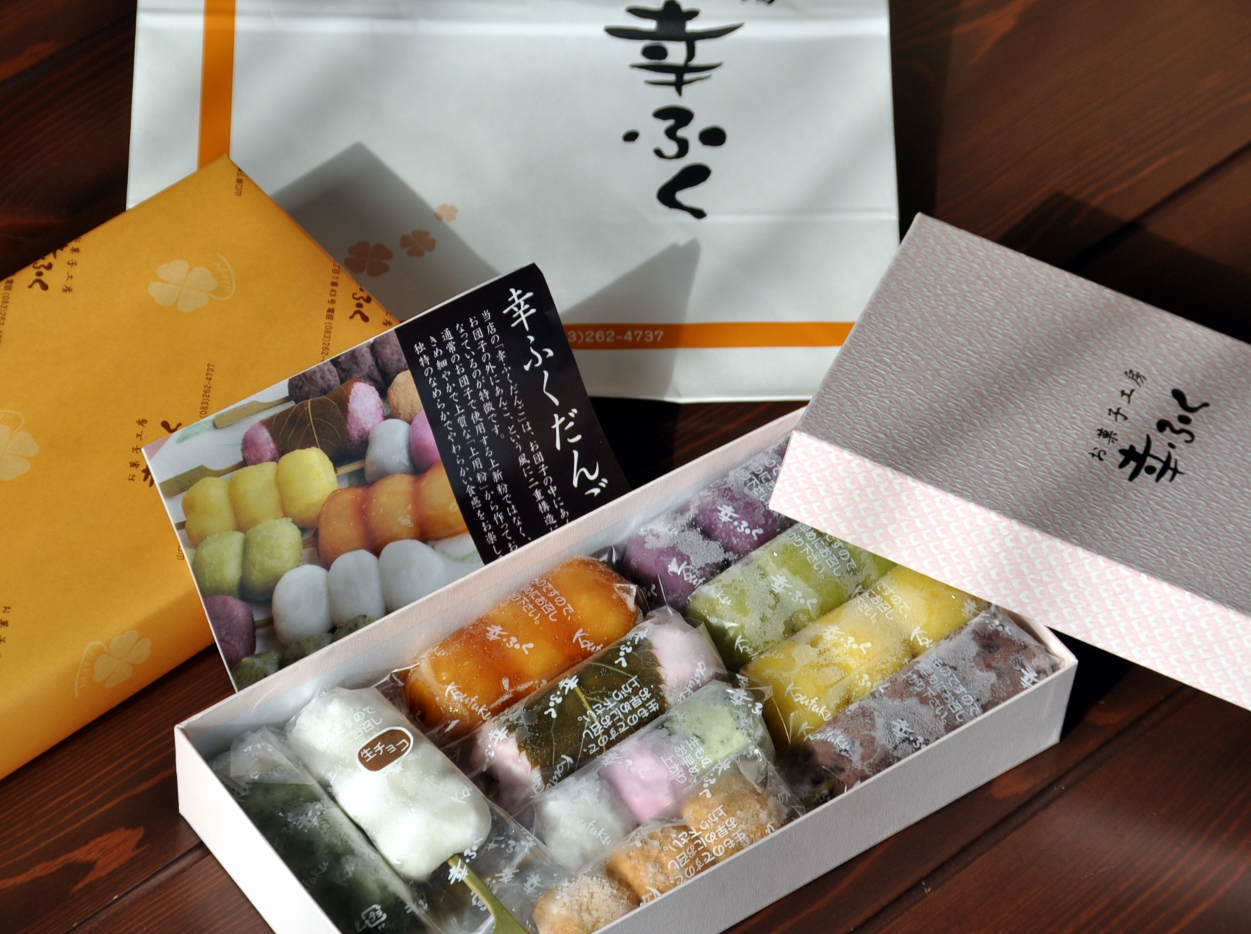 みたらし・小倉・三色・生チョコ・きな粉・よもぎ・桜もち・ずんだ・紫いも・栗の10種類の色とりどりの団子を、専用の化粧箱に詰め合わせたギフトセット。