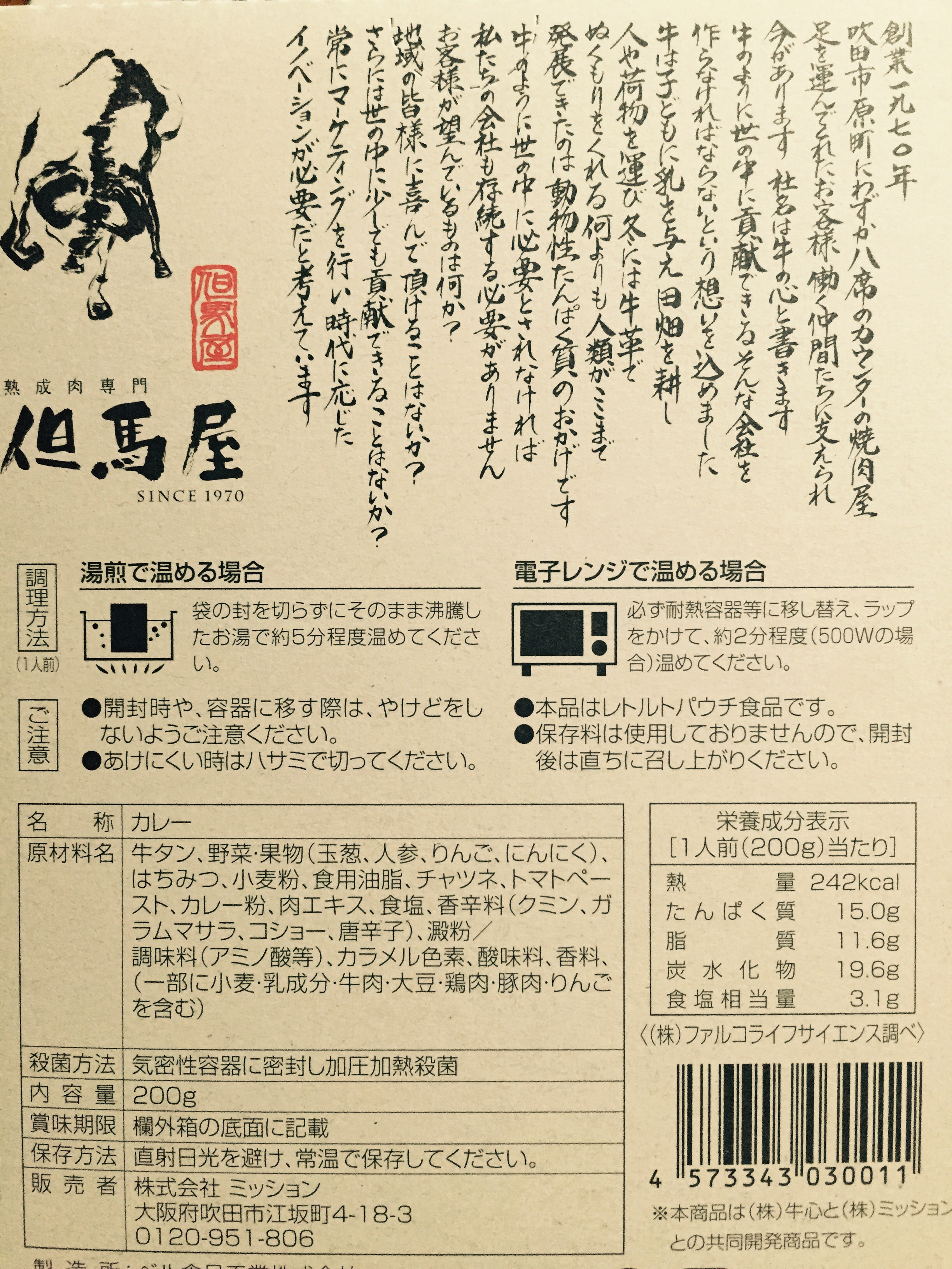 大阪で9店舗、東京で1店舗を展開し、45日以上かける“超熟成肉”が人気を集める但馬屋の特製レトルトカレー。一頭買いという概念を打ち出した但馬屋ならではの強みを活かし、神戸牛の牛たんが贅沢に75gも入っています。神戸牛の牛脂とカレールーが絶妙に絡みあう深いコクが特徴。中辛で高級感がある大人なカレーをご賞味ください。
