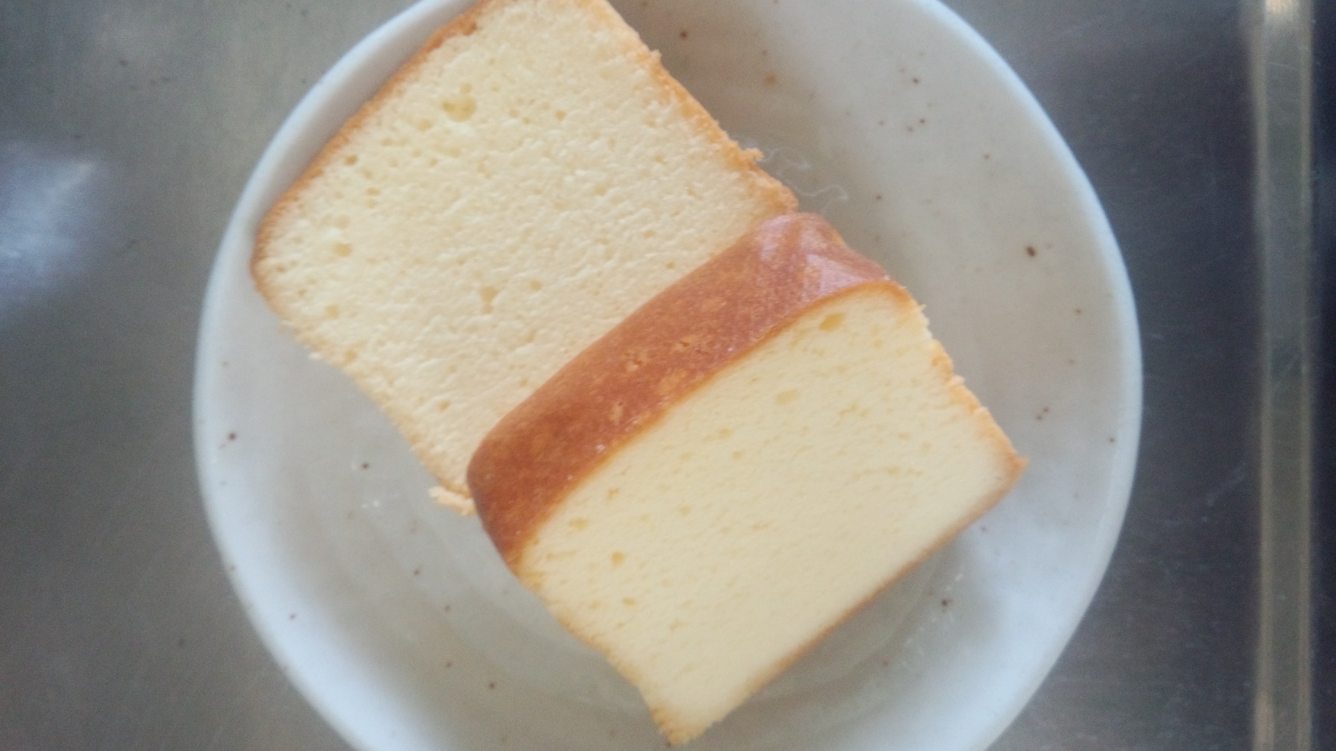 早速中袋を開け、リッチな食感が楽しめるよう3センチくらいの厚さに切り分けると、包丁を入れているときからしっとり滑らかな生地の感じが伝わってきて期待が膨らみます(^_^)