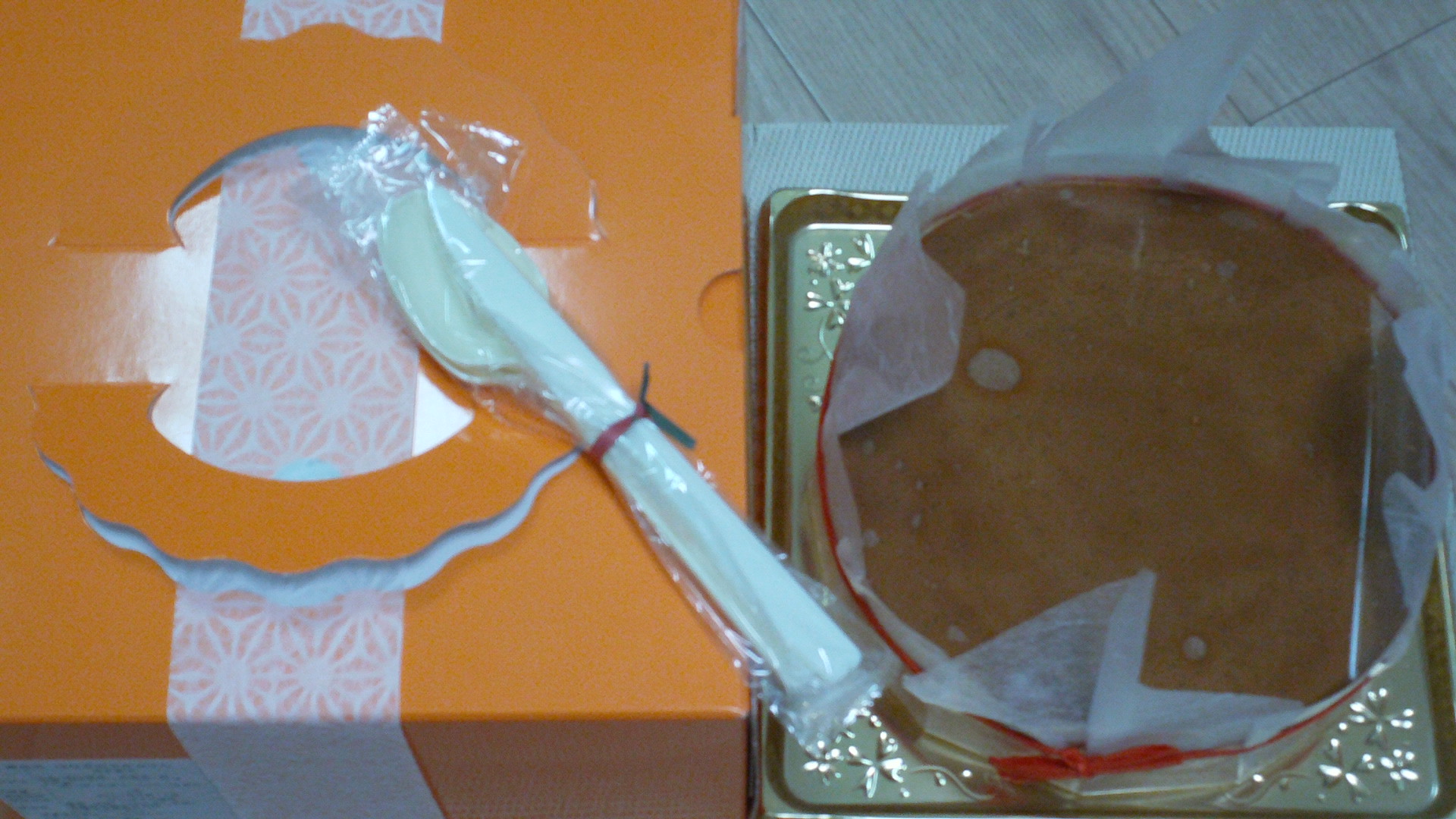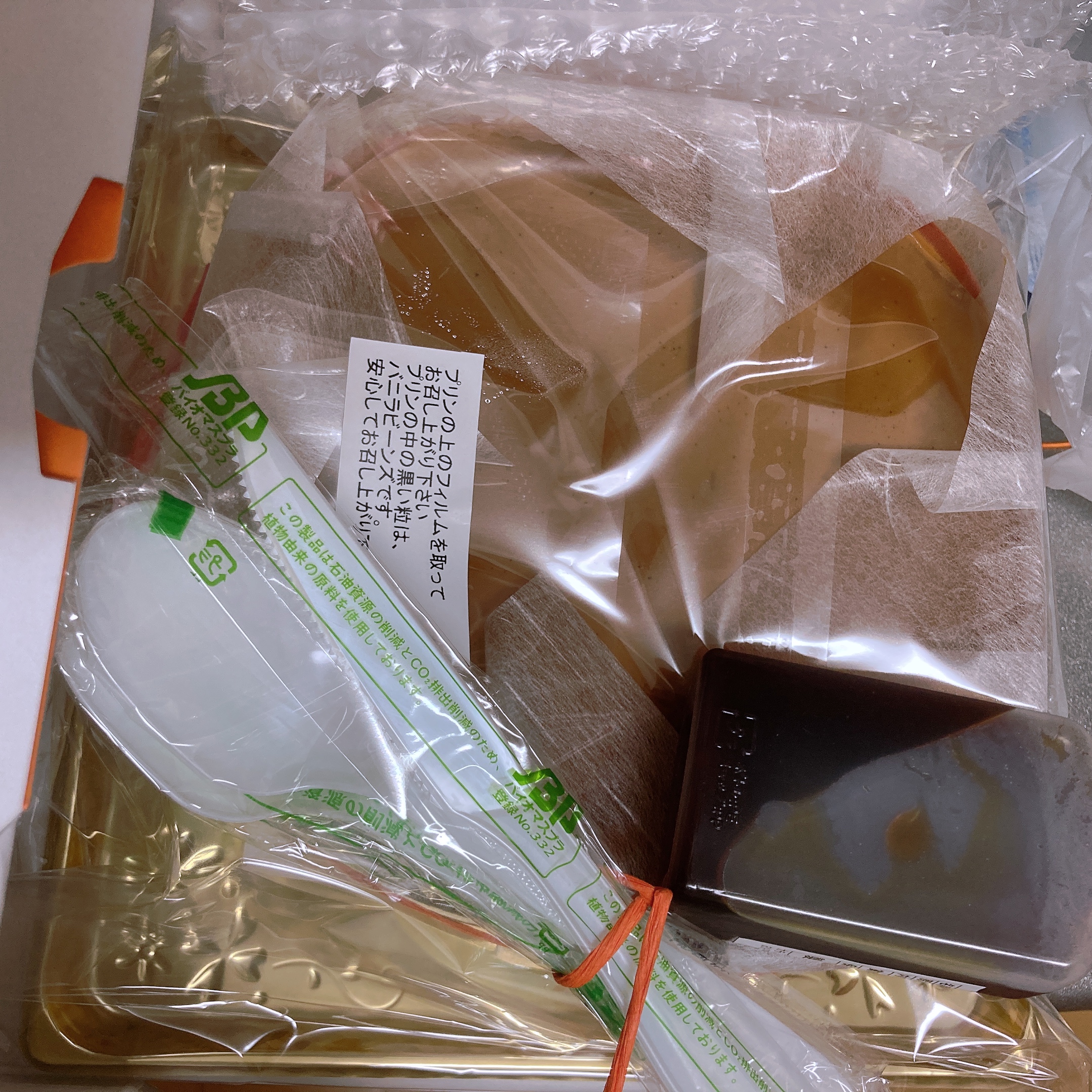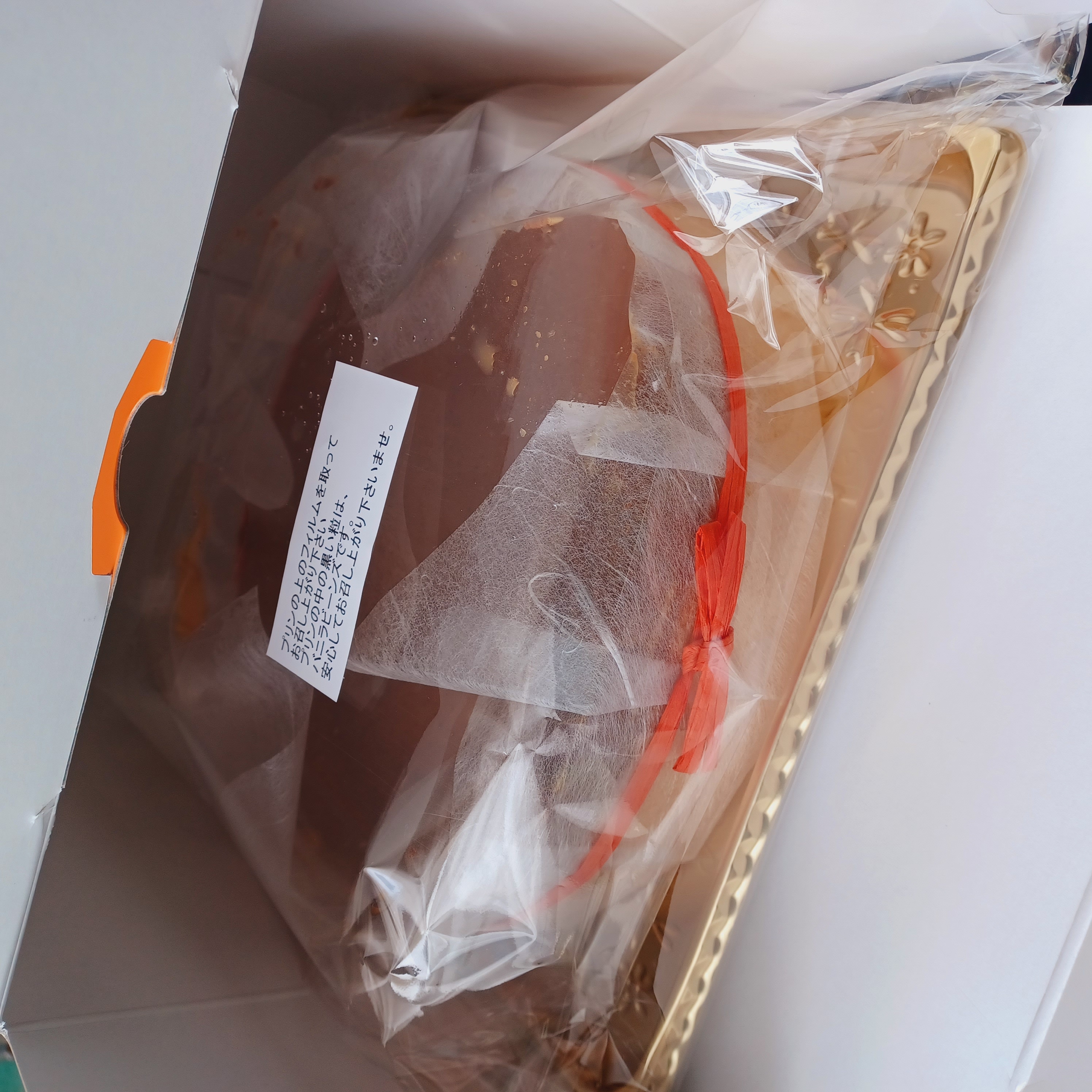 オレンジの大きなケーキ箱に大きなプリンとカラメル、フォークナイフまで入ってました。
