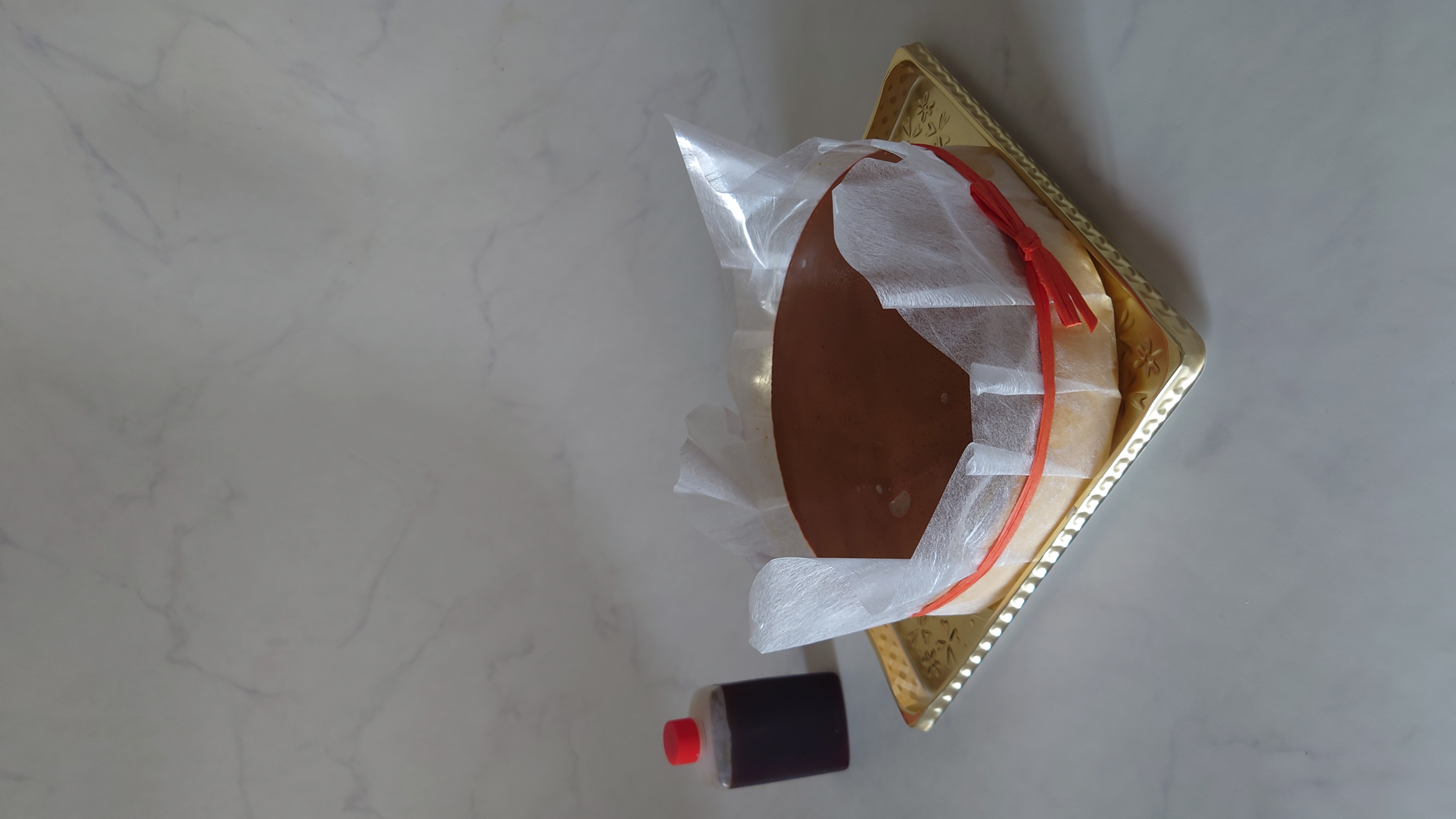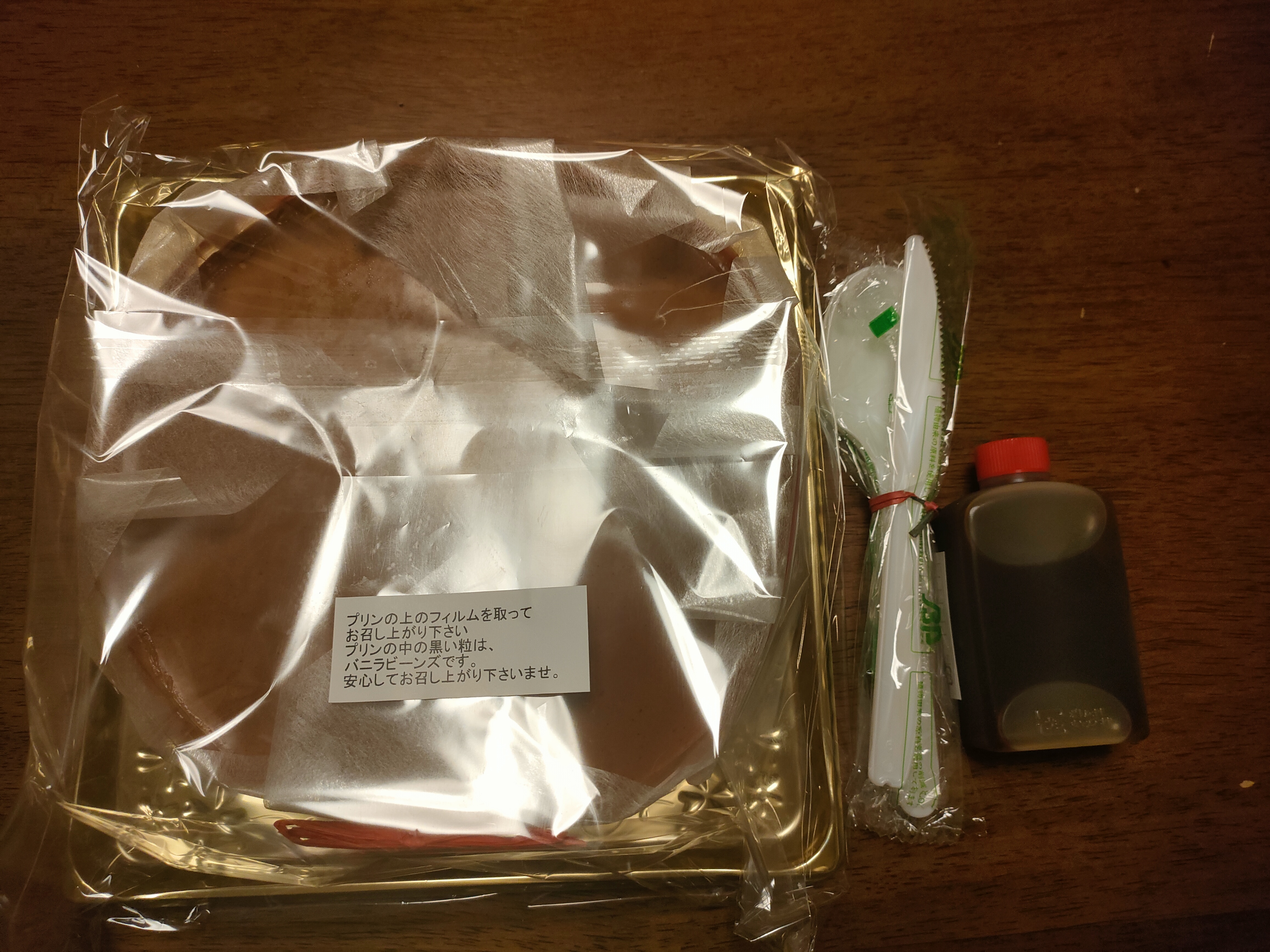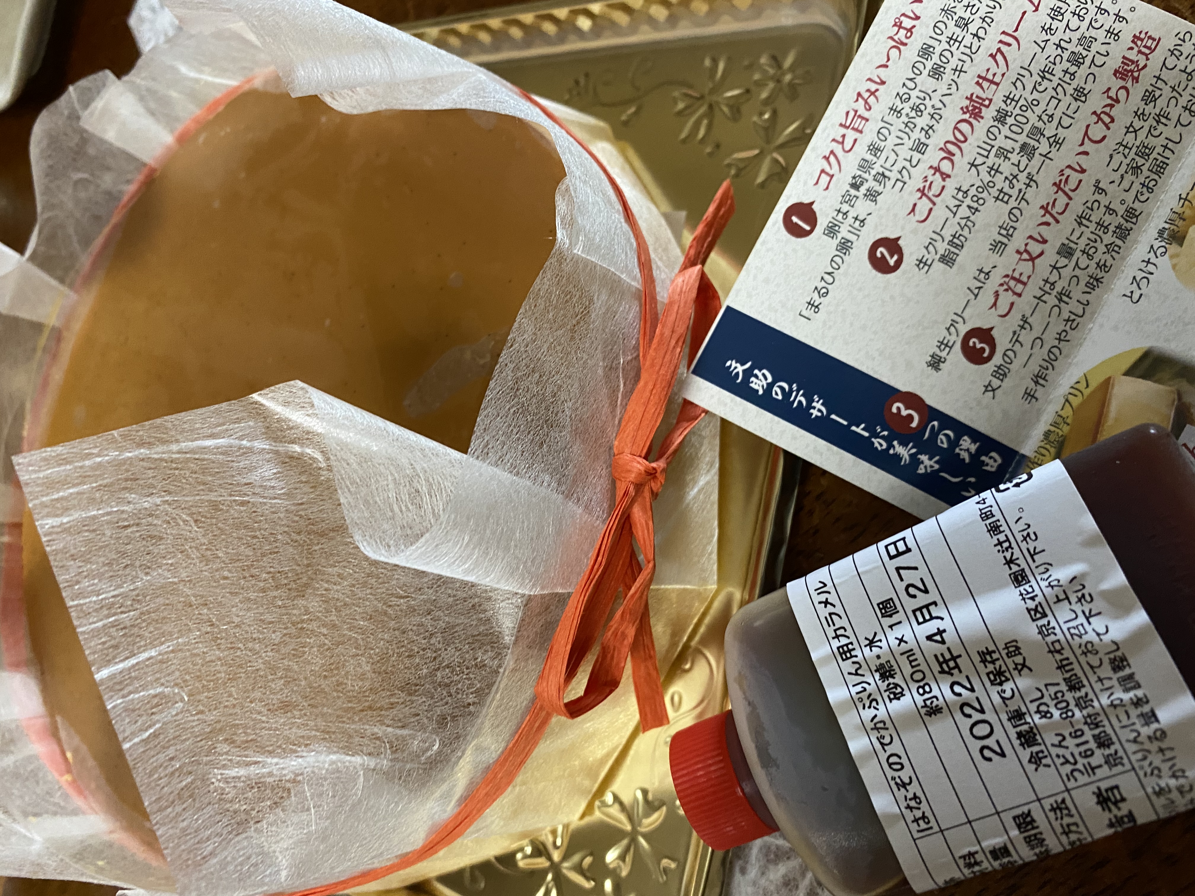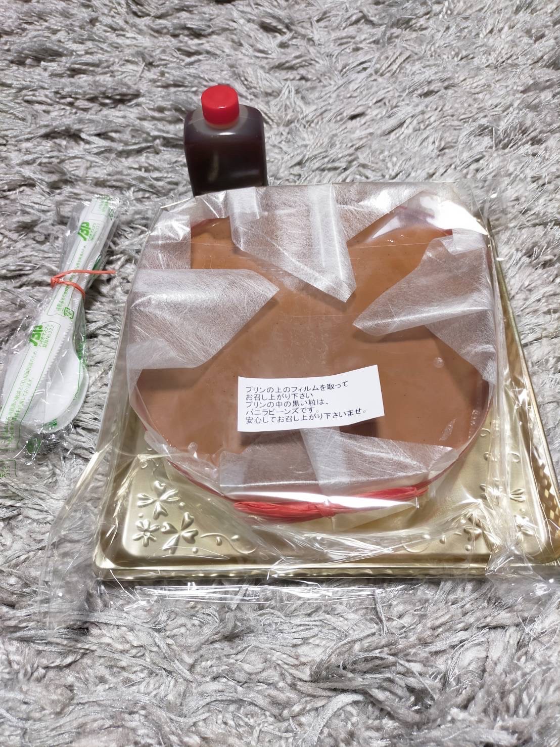 オレンジの大きなケーキ箱に大きなプリンとカラメル、フォークナイフまで入ってました。