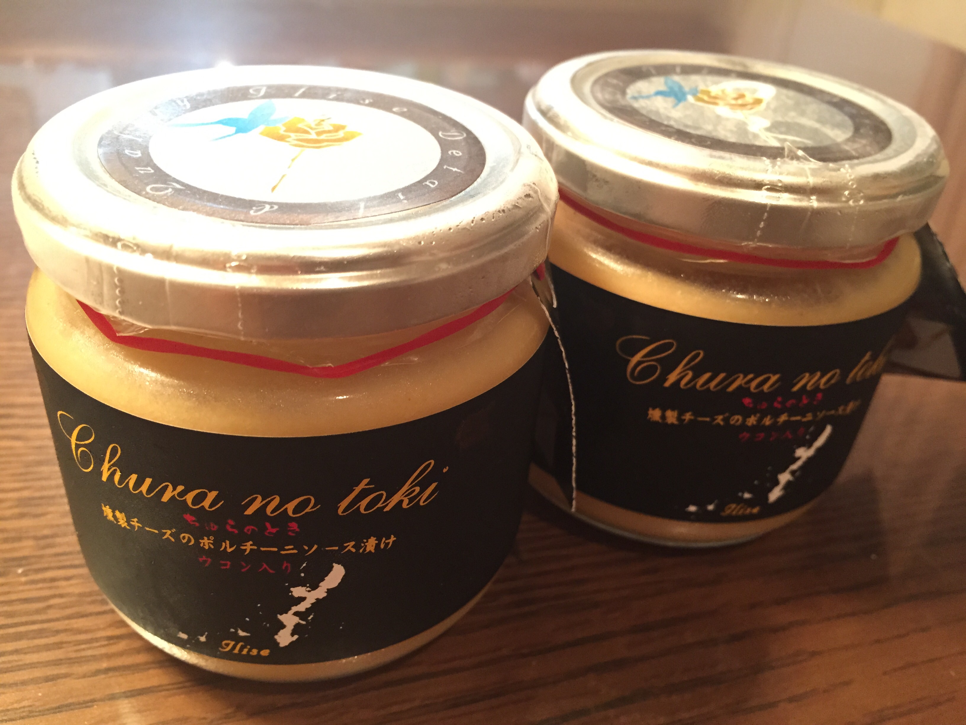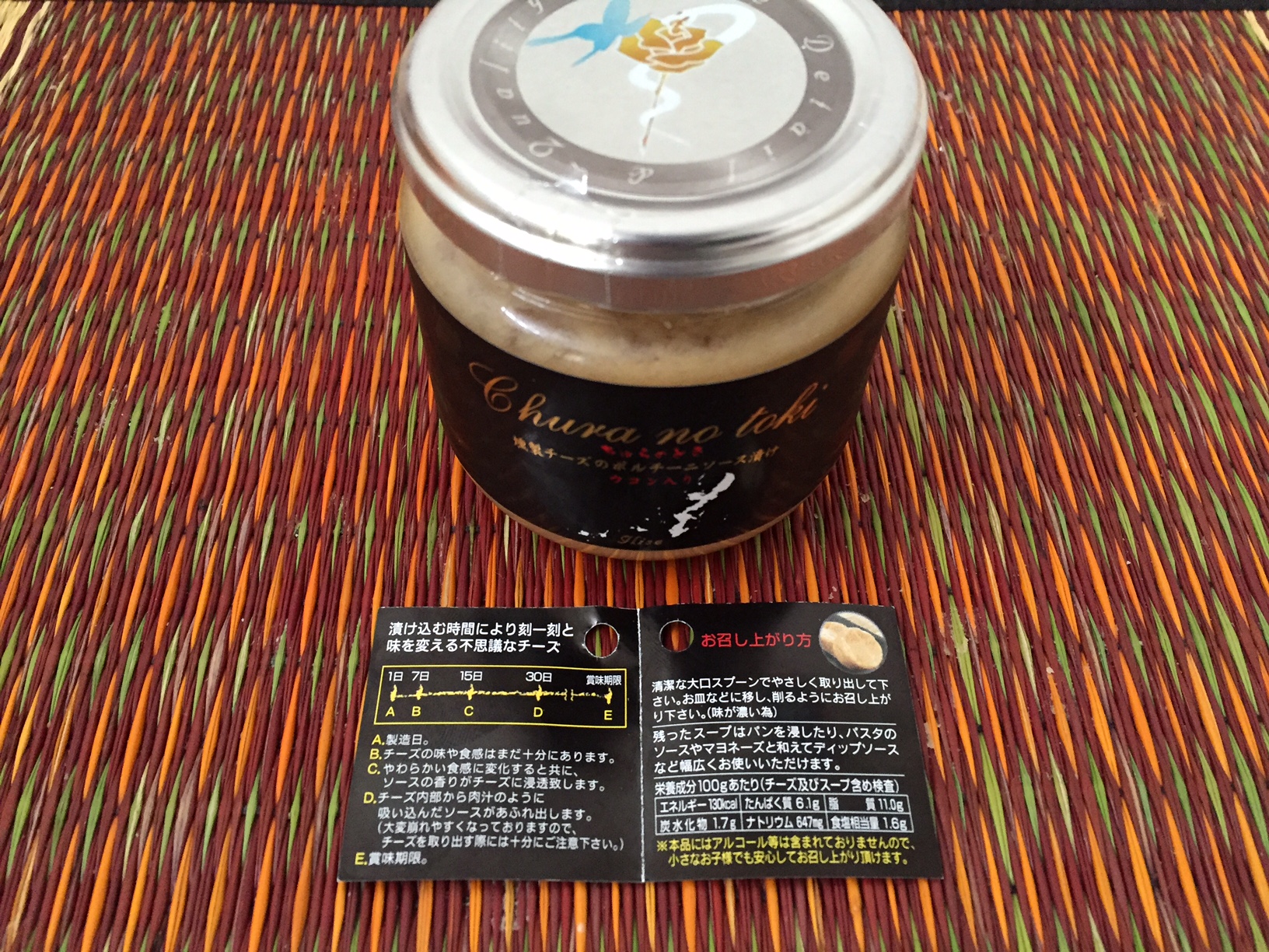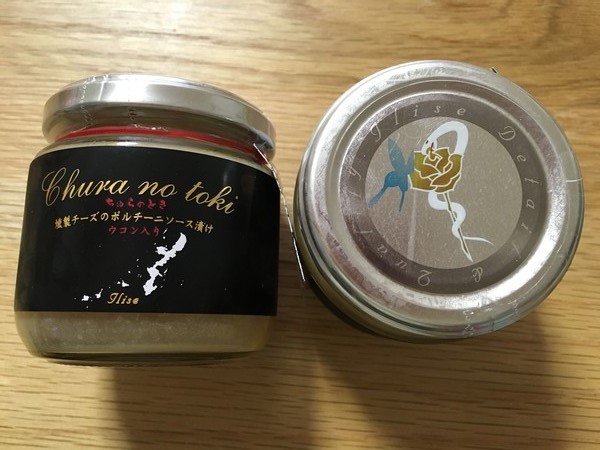 燻製チーズをポルチーニ茸と秋ウコンのスープに漬け込んだ、今までに無い味と食感のチーズです。究極の酒の肴を目指して開発され、繊細で滑らかな舌触り、スモークとウコンの後味は、お酒をさらに美味しくさせます。燻製チーズをさらにスープなどに漬込み、熟成させる商品は世界で唯一「美らノ時」のみ。瓶の中で熟成させることでしか完成しないその味は、食通をもうならせます。少量づつスプーンなどで削り取ってお召し上がりください。
