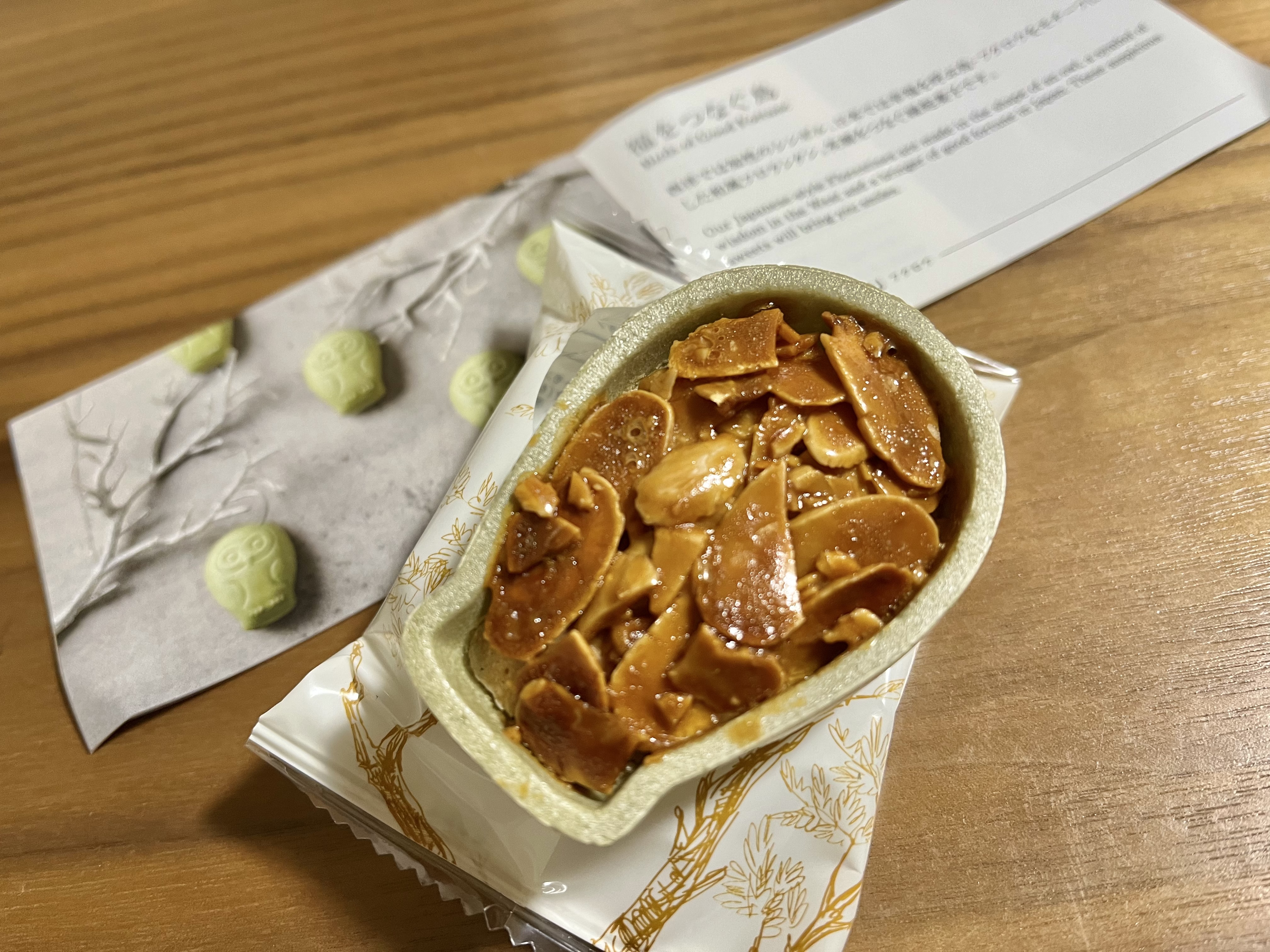 よもぎ風味の最中皮にサブレ生地とアーモンドのキャラメリゼを詰合せた和風のフロランタン。サクサク、軽い口当たりの食感は、お茶やティータイムのおやつにぴったりです。縁起のいい鳥「フクロウ」がモチーフになっており、子どもから年配の人まで幅広い世代に愛されます。手のひらサイズなので、結婚式やお世話になった方へのプチギフトにおすすめです。