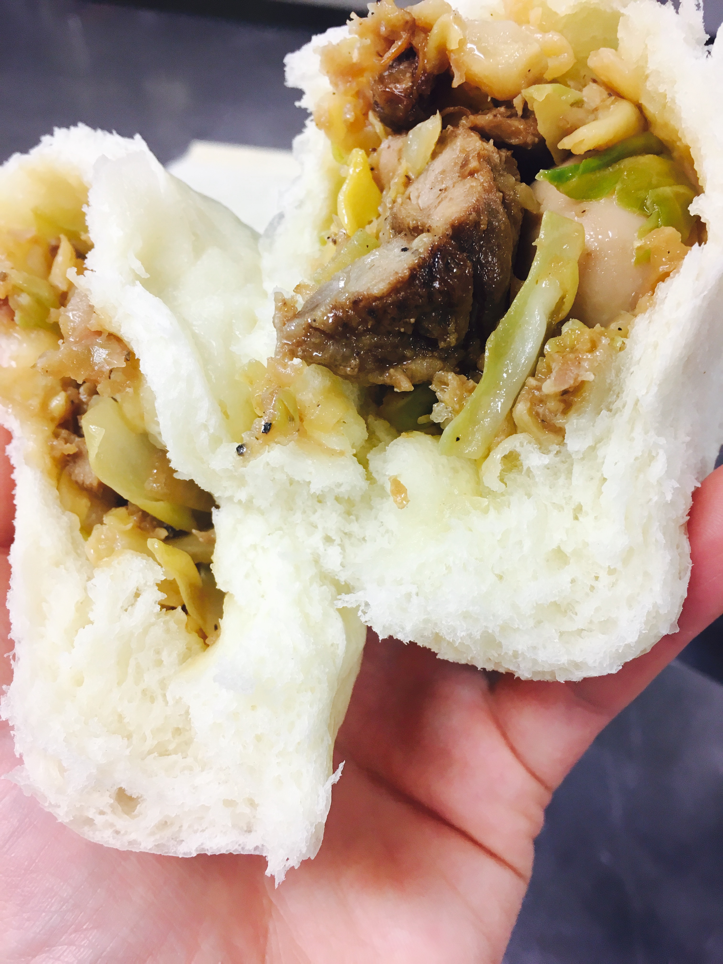 甘い豚まんが多い中、あっさりな味付けにシャキシャキの野菜、うずらのたまご、味のしっかりついた角煮がゴロゴロ。