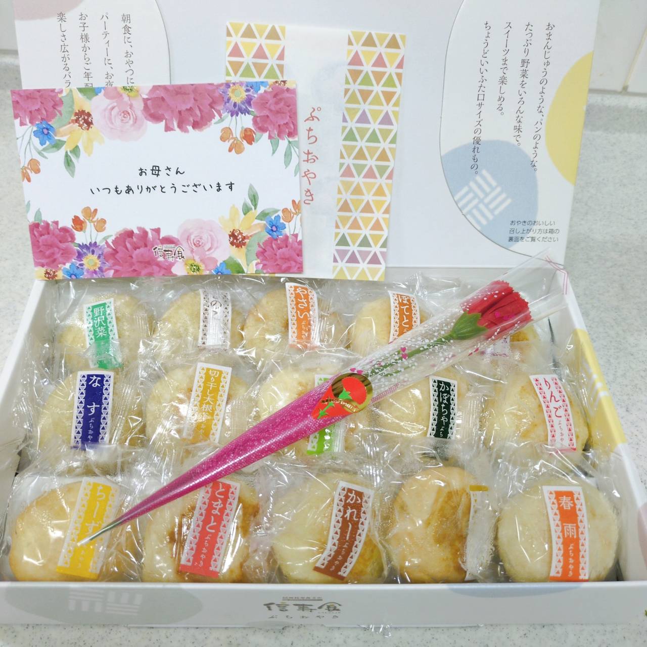 通常の半分のサイズの、信州・長野の郷土食「おやき」です。定番の9種のおやきの具材に、6種類を加えた15種類の味が楽しめます。皮は「焼き」タイプなので、柔らかいだけでなく、焼いた食感も感じられます。定番の「野沢菜、なす」等だけでなく、おやきとしては珍しい限定6種類「トマト、チーズ、カレー、春雨、ホワイトチョコ、りんご」など、甘いものから辛い物までバリエーション豊富なセットです。箱入りなので贈り物にもおすすめです。