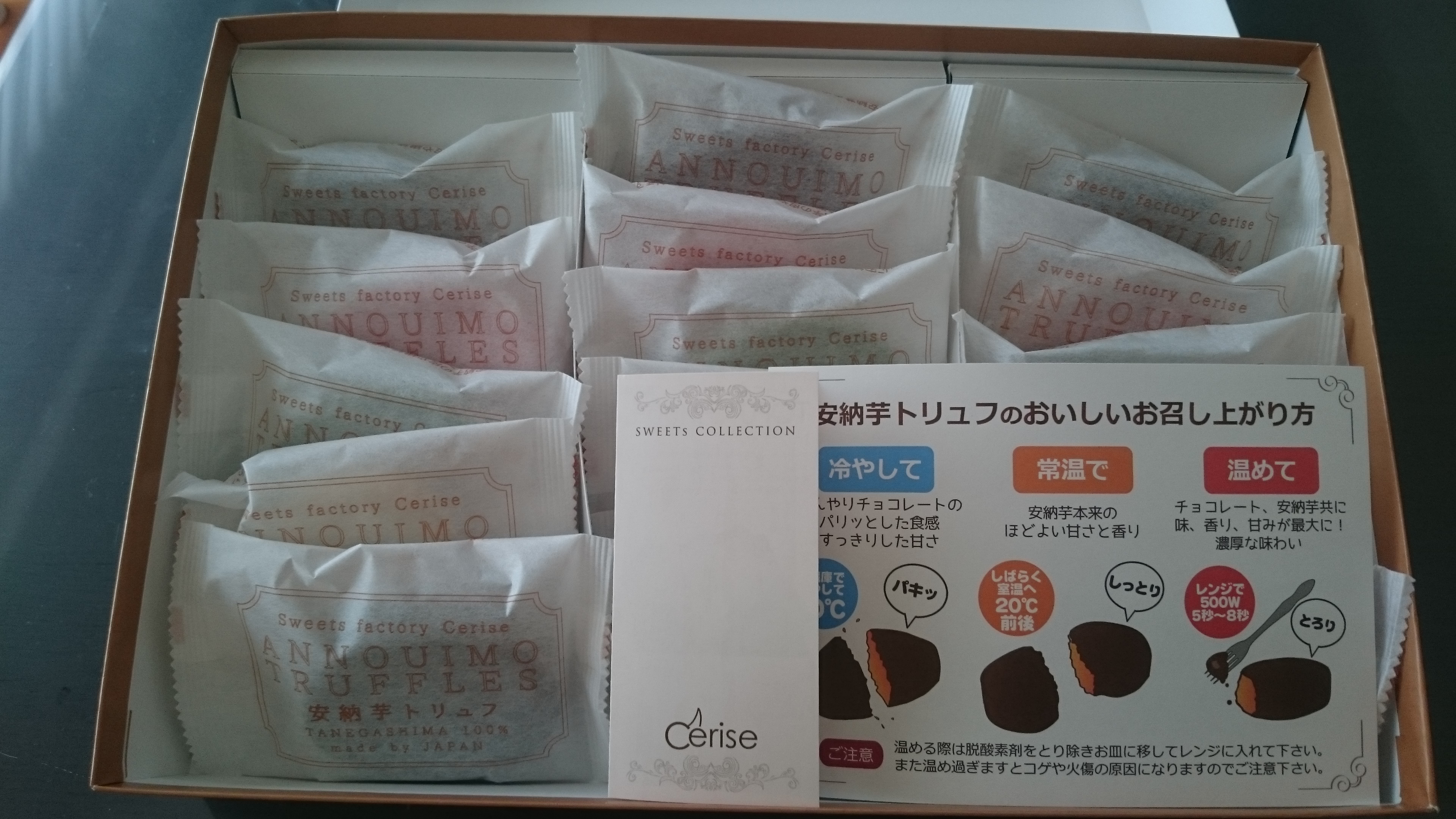 種子島純産の安納芋を使ったスイートポテトを、ベルギー産チョコレートで贅沢に包んだ新感覚スイーツ。安納芋のクリーミーな甘さとチョコレートのハーモニーが絶妙です。味はチョコレート、ホワイトチョコレート、抹茶、苺、キャラメルの5種類。「冷やして」「常温で」「温めて」と3通りの食べ方があり、それぞれ違った味わいが楽しめます。