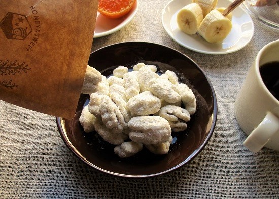 カリッと噛んだ軽快な音と共に、はちみつのまろやかな甘さとホワイトチョコのミルキー感が口いっぱいに広がります。