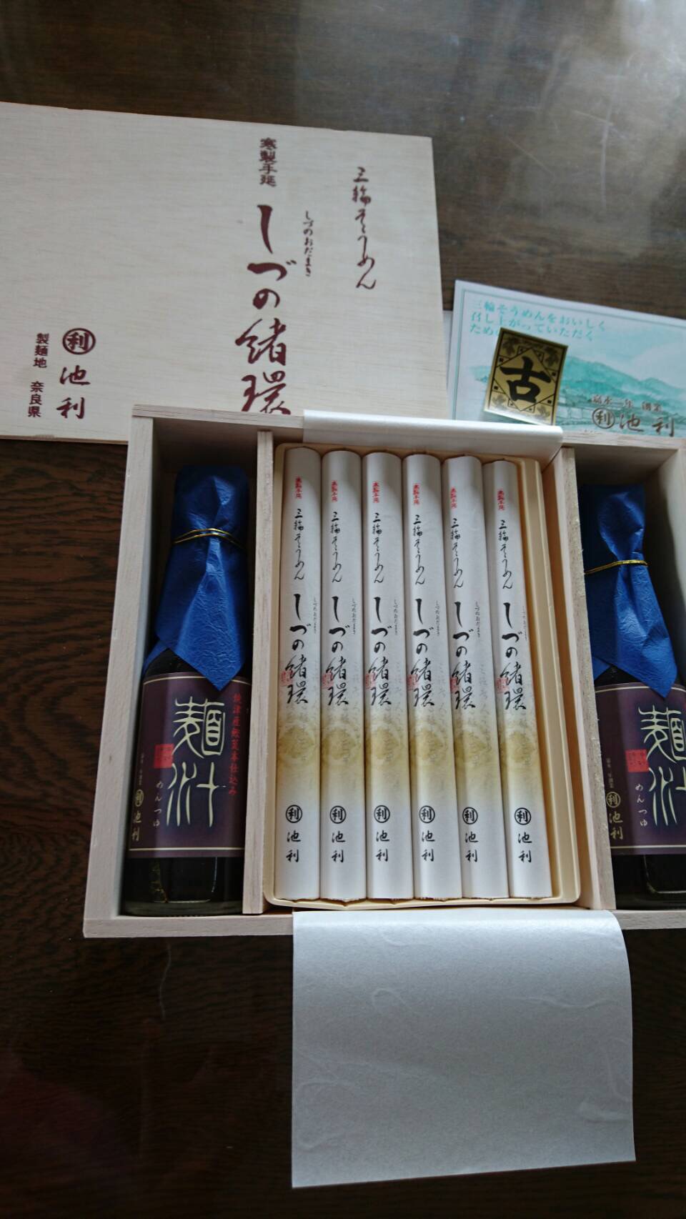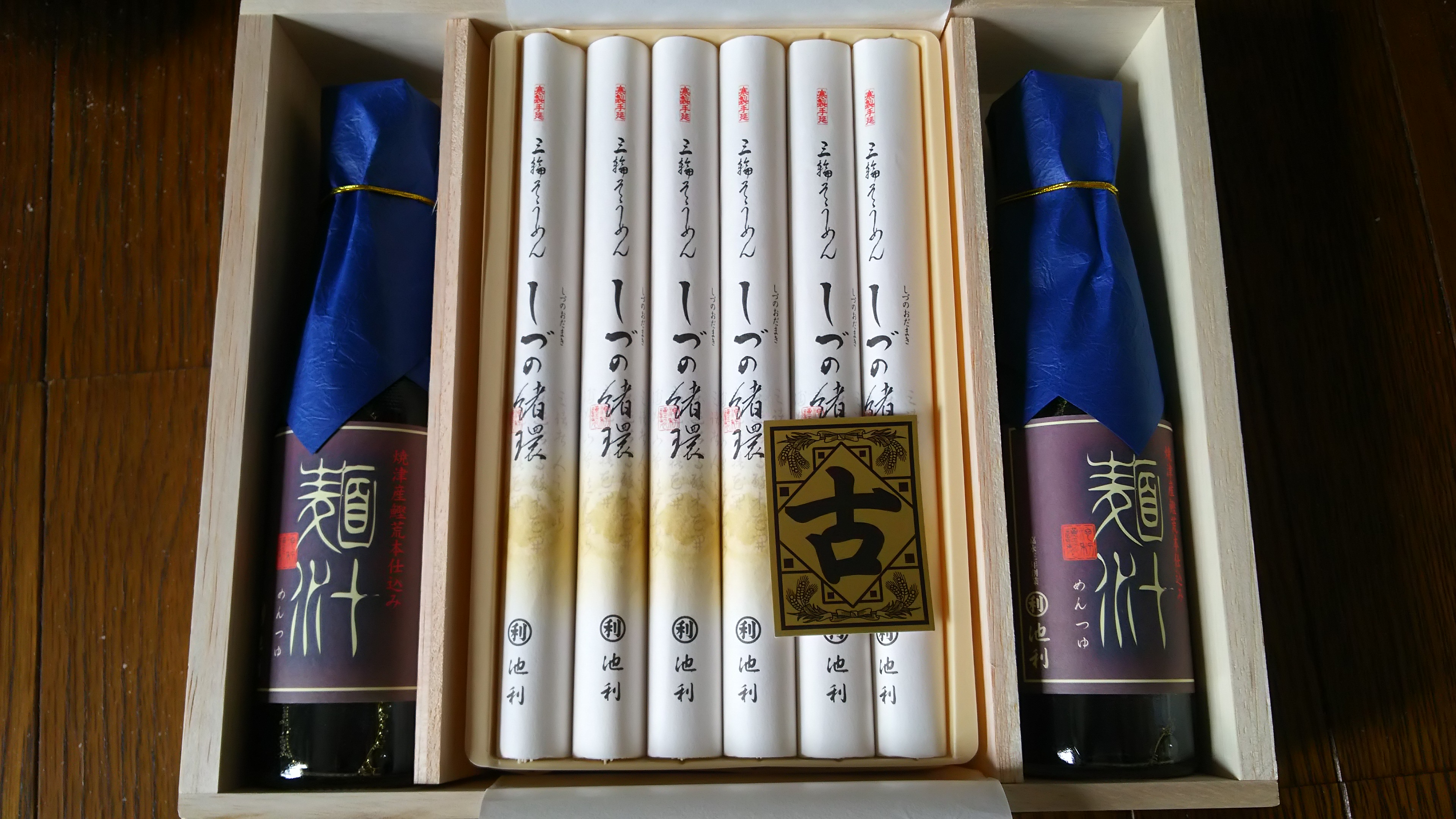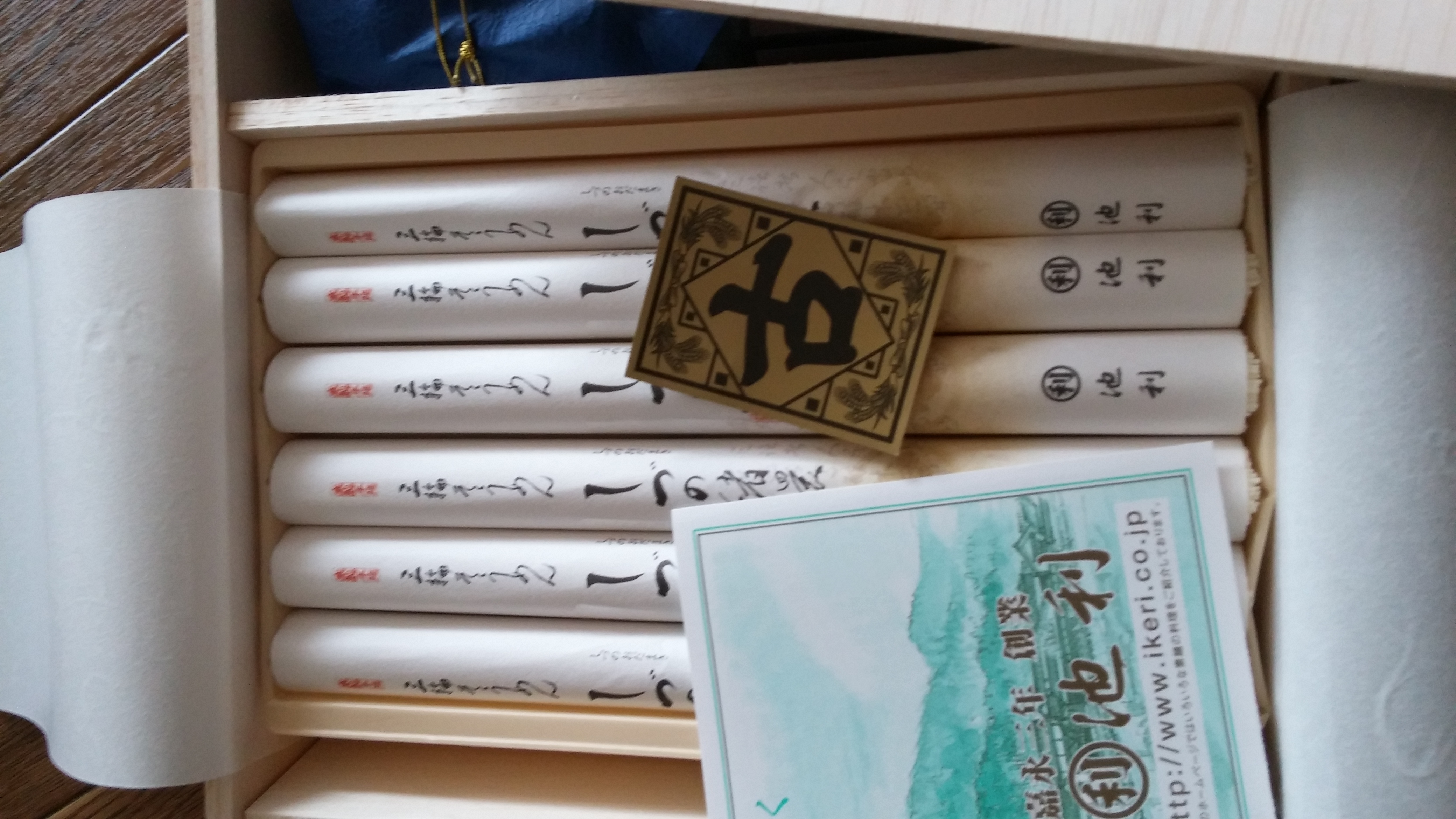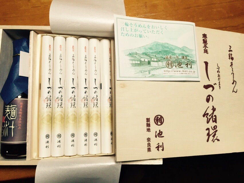 予定通りに配達された包みを開けると(というか、この時点でずしりとした重みに圧倒されました。)立派な木箱に上品に包まれたそうめんの束(50gが12束)と150mlが2本の2倍希釈のつゆが入っていました。