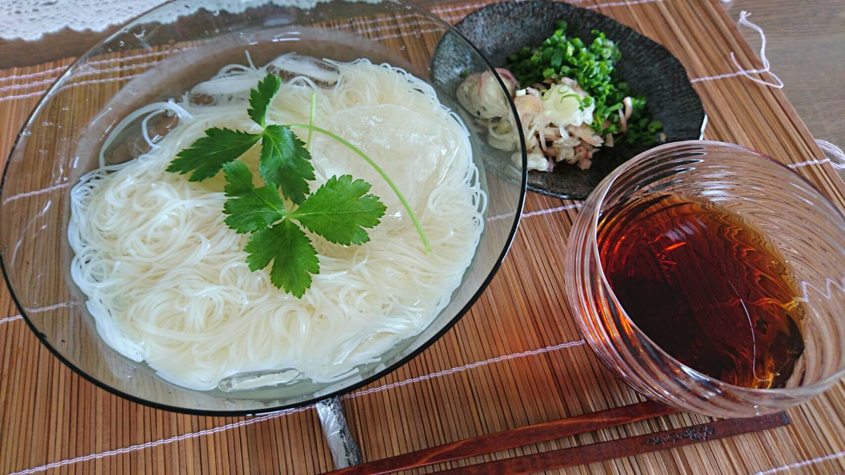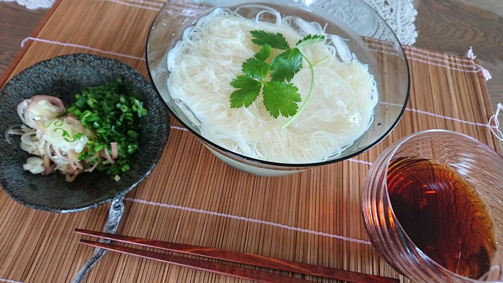 薬味はミョウガとネギをたっぷり添えてミツバも一緒にいただきました。さっぱりとした味わいで、家族みんなで、はしが止まりませんでした。