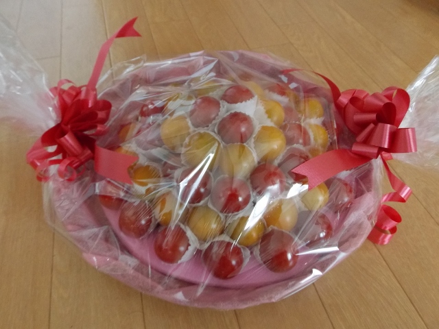 直径30センチのカゴにみっちりとすき間なく詰めてくれているので、さながらカラフルな大仏さんの頭のよう。