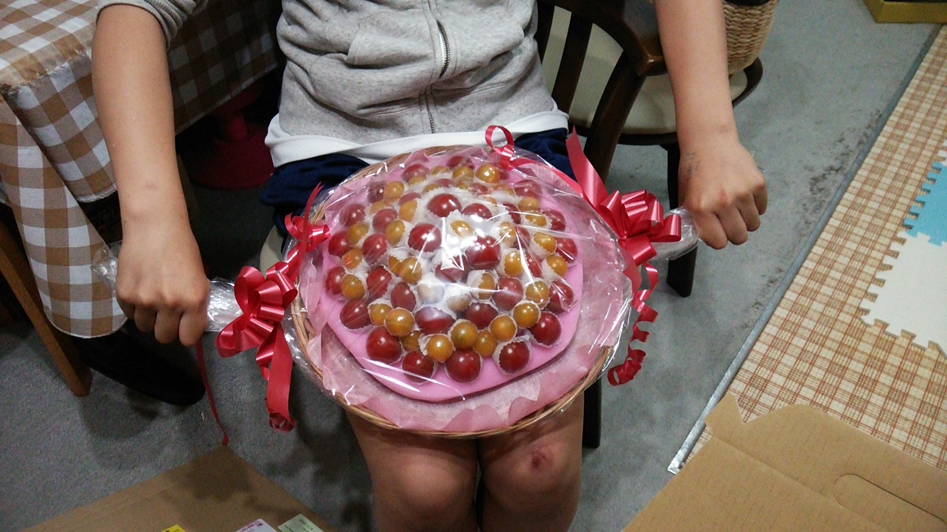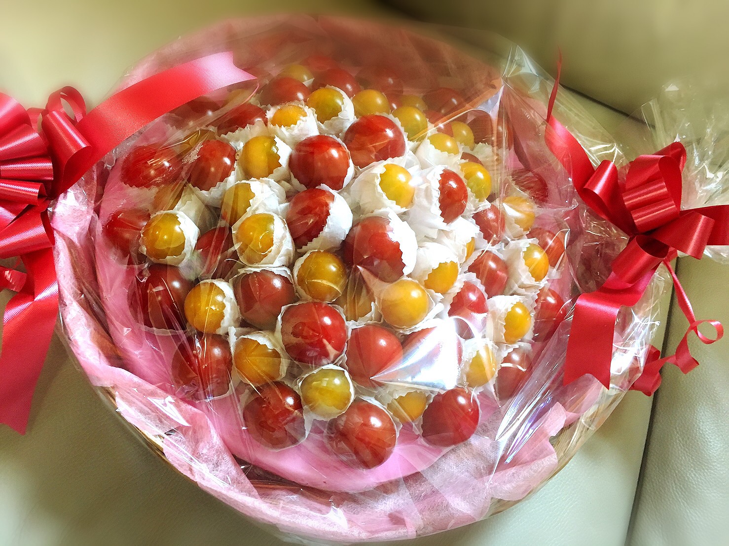 プチトマト約50個をまるい籠に盛り付けたのが“ハッピートマトバスケット”です。食べ応えのある大きめの国産プチトマトを一粒ずつ飾り紙で包んで盛りつけ。真上から見ると、まるで花火のような華やかさです。リボンで可愛くラッピングされているので、プレゼントとしてもオススメです。