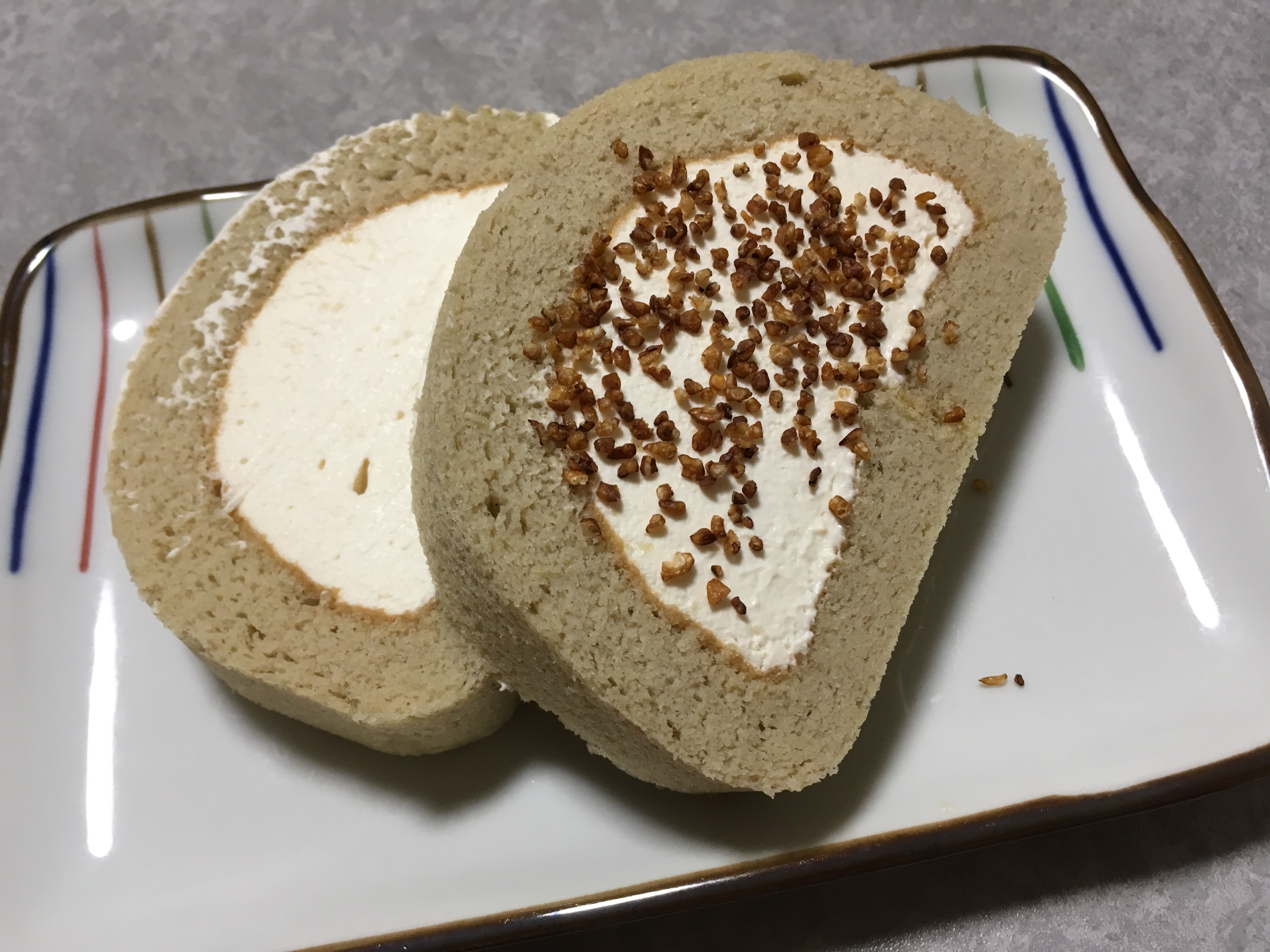 添付のそばの実をふりかけることによって、サクサク食感が美味しいロールケーキになります。一度に二度おいしいロールケーキをお楽しみください。