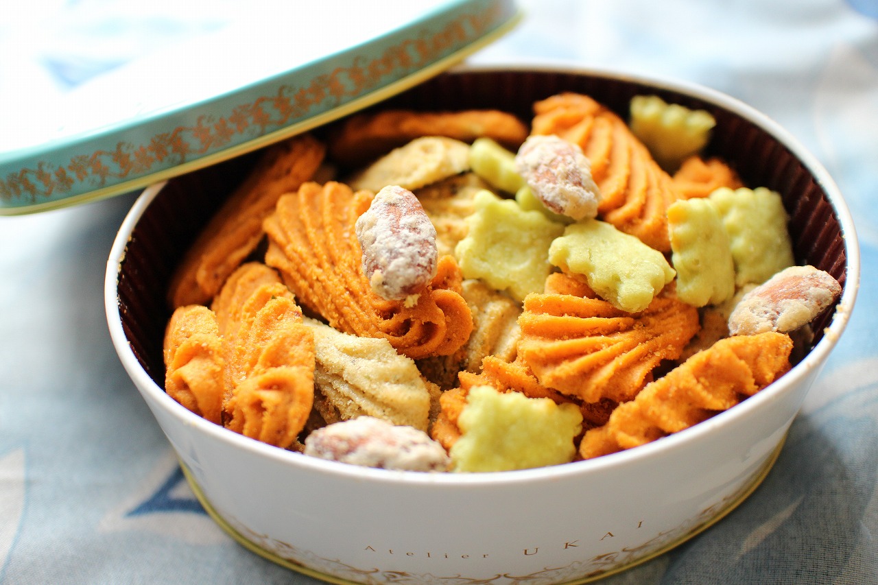 「スパイスは厳選されたものを独自にブレンドし、煎って香りを出してから加える」、「野菜のピュレは一手間加えてコクを出してから用いる」など、うかいグループのレストランで培った発想を生かした料理のような味わいが魅力のクッキーです。