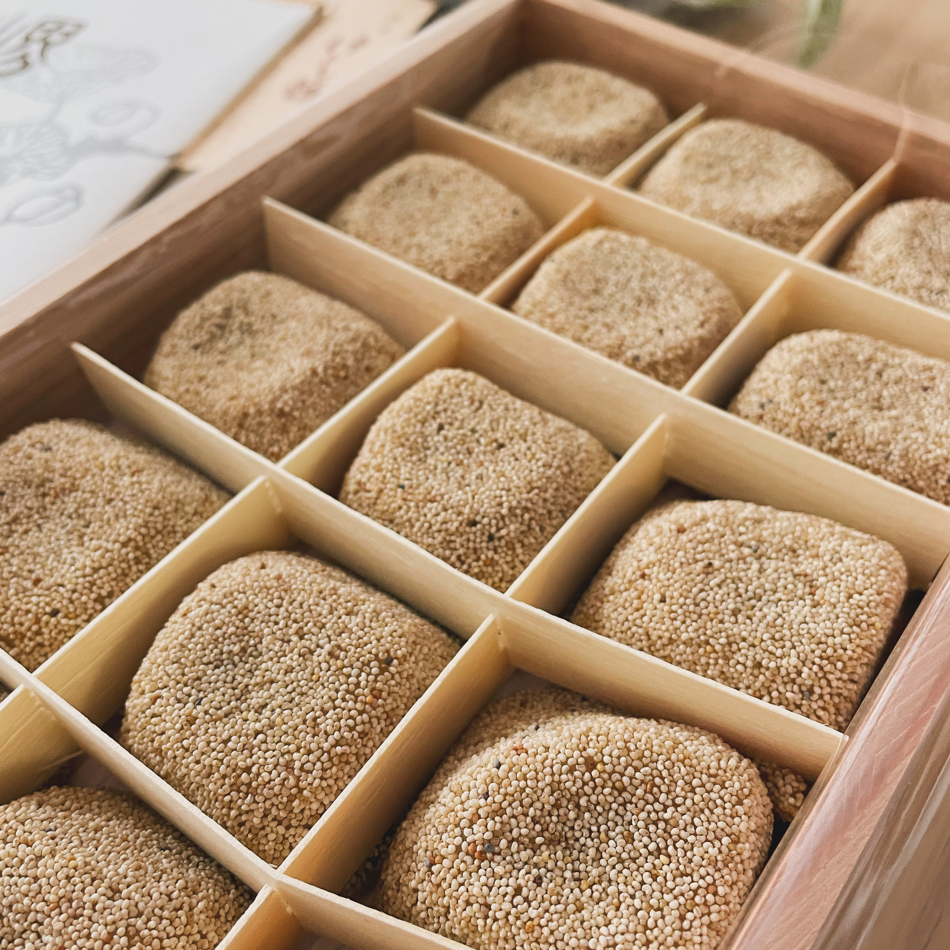 創業300年以上、老舗和菓子店の「けし餅」です。室町時代にインドよりもたらされたと言われるけしの実は、江戸時代初期から大阪や和歌山などで栽培されてきました。小豆のこしあんを、餅皮で包んだものに、まぶし仕上げています。 餡、餅皮、けしの実、三位一体となるよう、昔ながらの製法にこだわり、職人が一つ一つ丁寧に仕上げています。木箱に入って届くので、手土産スイーツとしてもおすすめです。