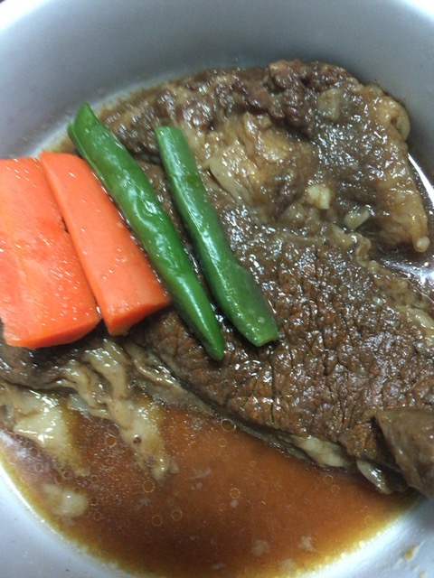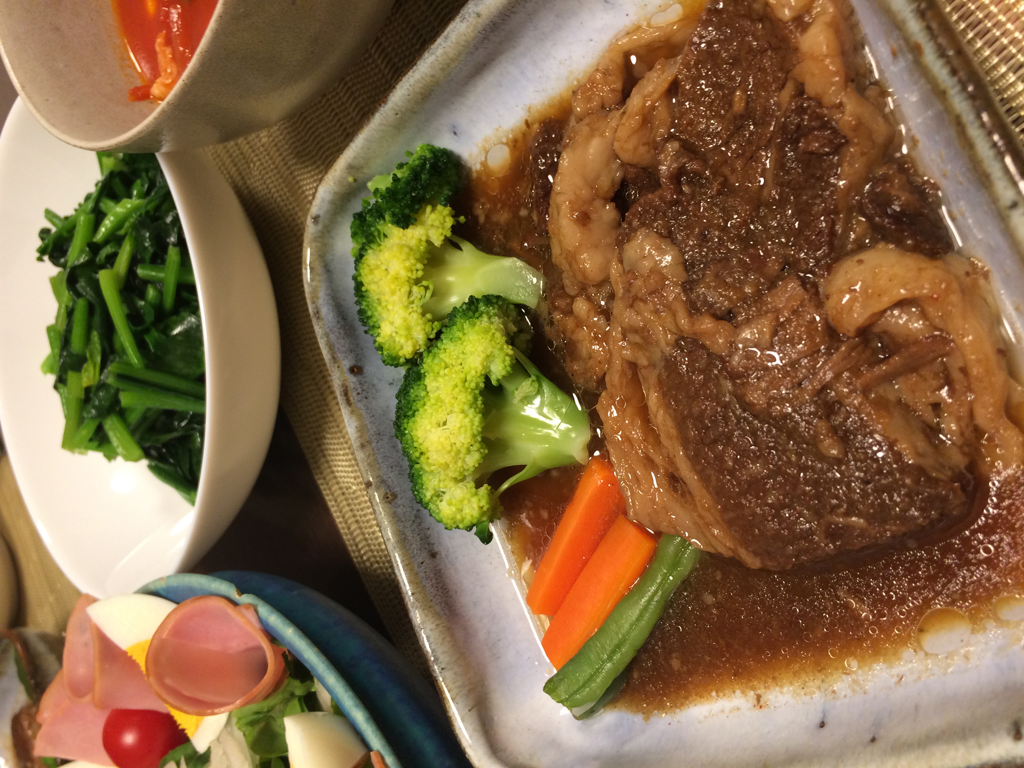 味付けも濃いというわけではなく、しっかり染みているという感じです。赤ワインと調味料の他に野菜と果物を使用しているので、奥深い味わいでとても美味しかったです。煮込み汁だけでも旨みがあり、付いていた付け合わせの野菜と準備した温野菜もつけて食べることができ、神戸牛も煮込み汁も堪能しました。
