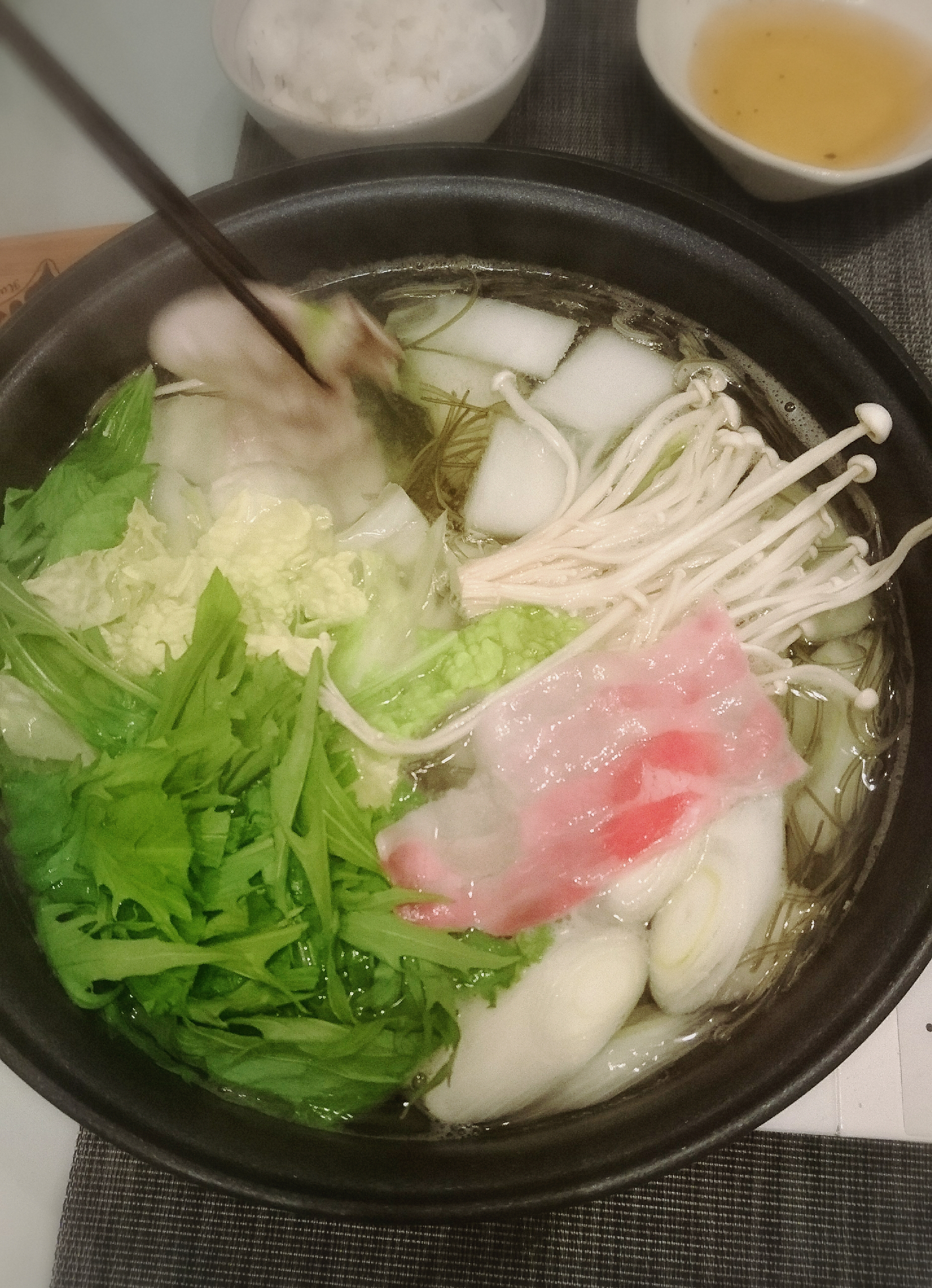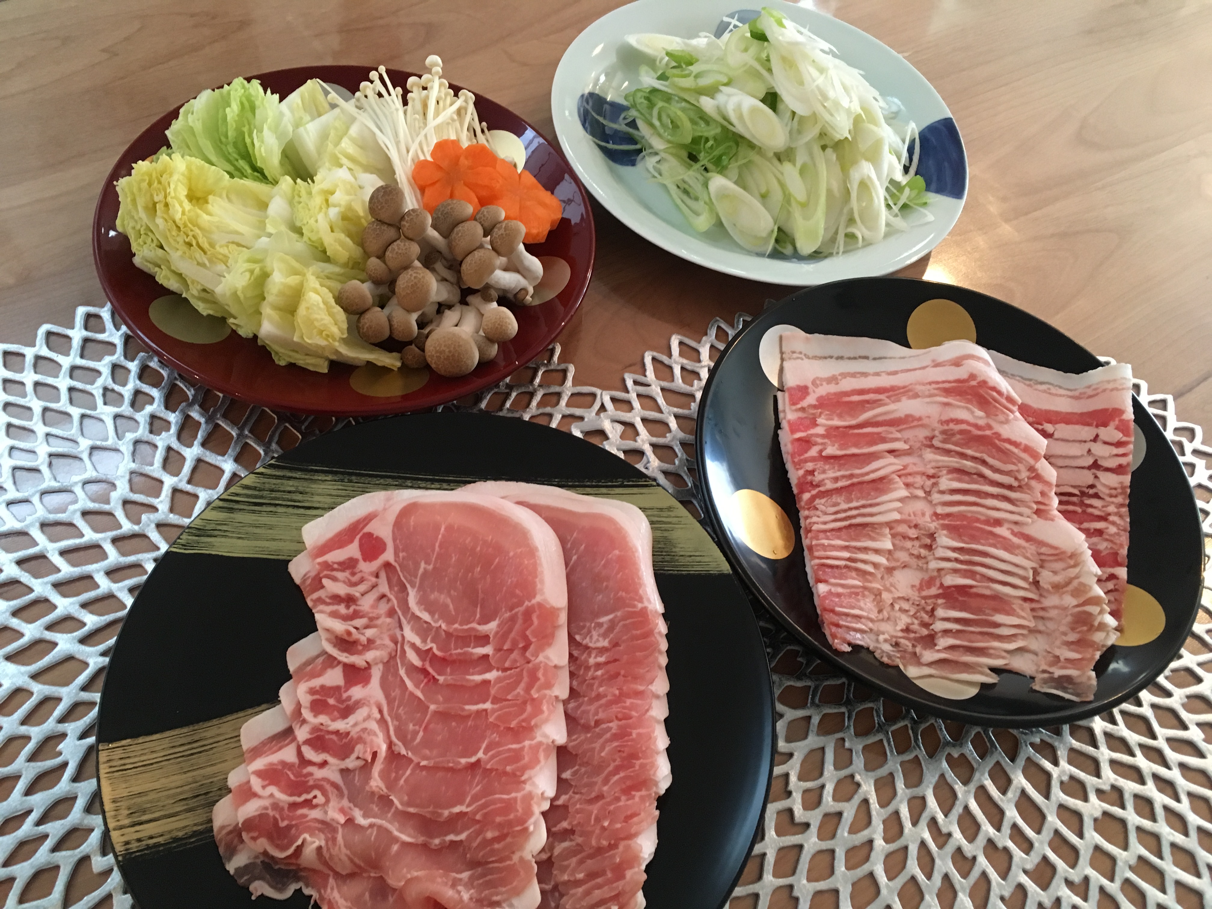 早速、我が家で収穫した白菜、春菊、他にくずきりと正月を待てずに先日ついたお餅を用意して2種類のお肉を食べ比べながら頂きました。