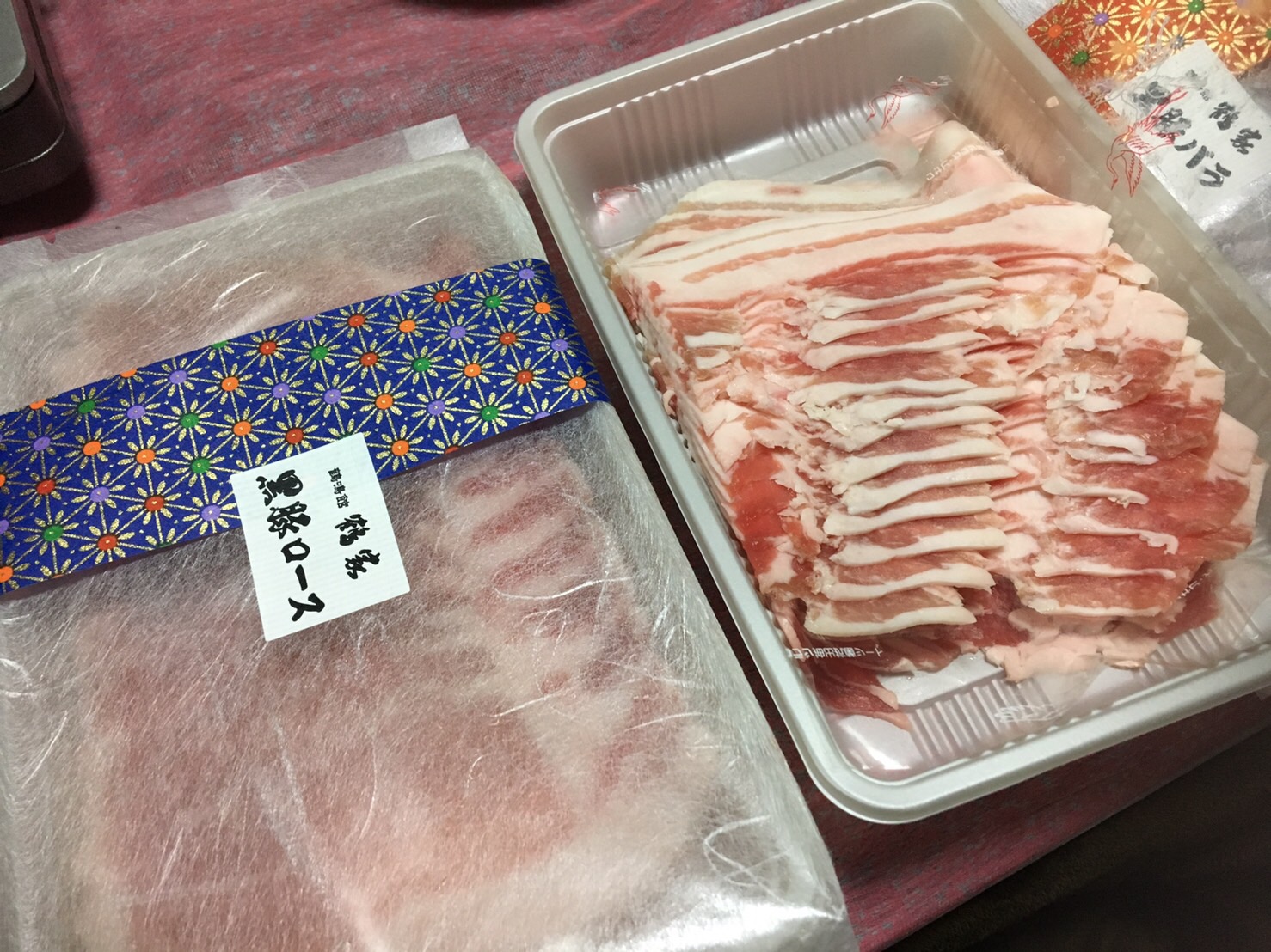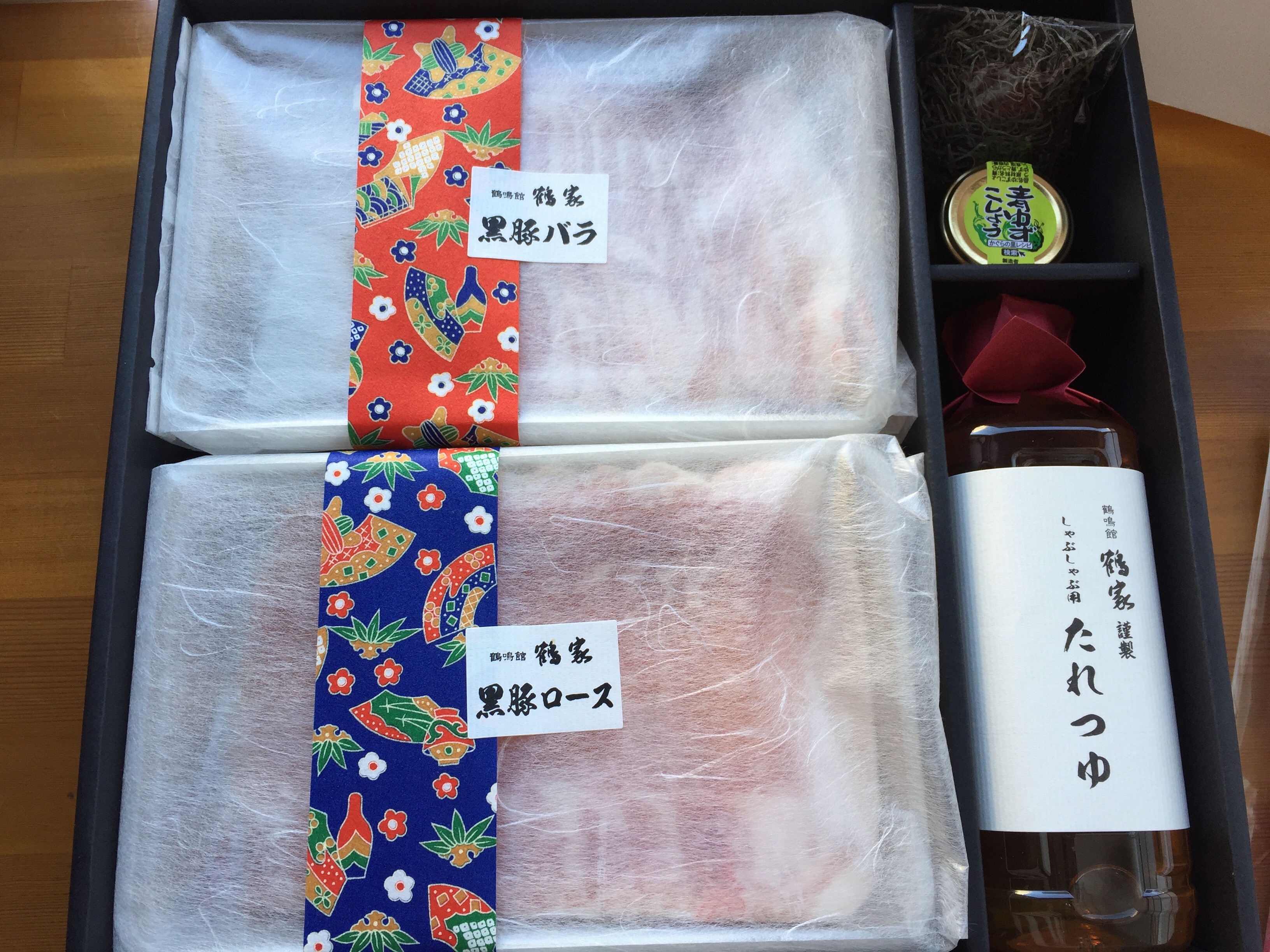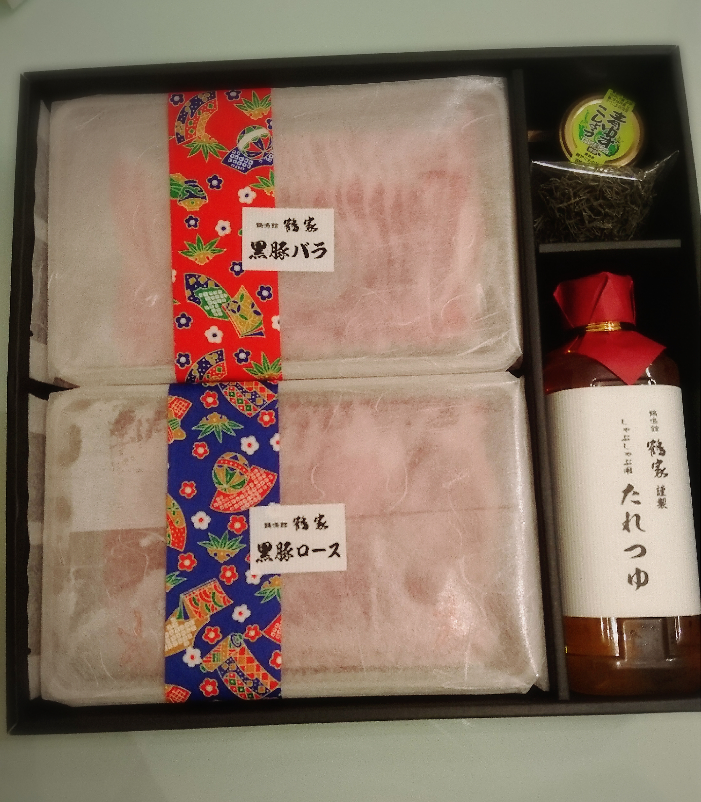 お肉は黒豚ロース300gと黒豚バラ300gが別々にしっかりと保水と抗菌の配慮がされています。ほかにタップリ500mlのプラスチックボトルに入ったたれつゆ、小振の瓶に入った柚子胡椒20g、プラスチックの袋に入った刻み昆布10gのセットです。