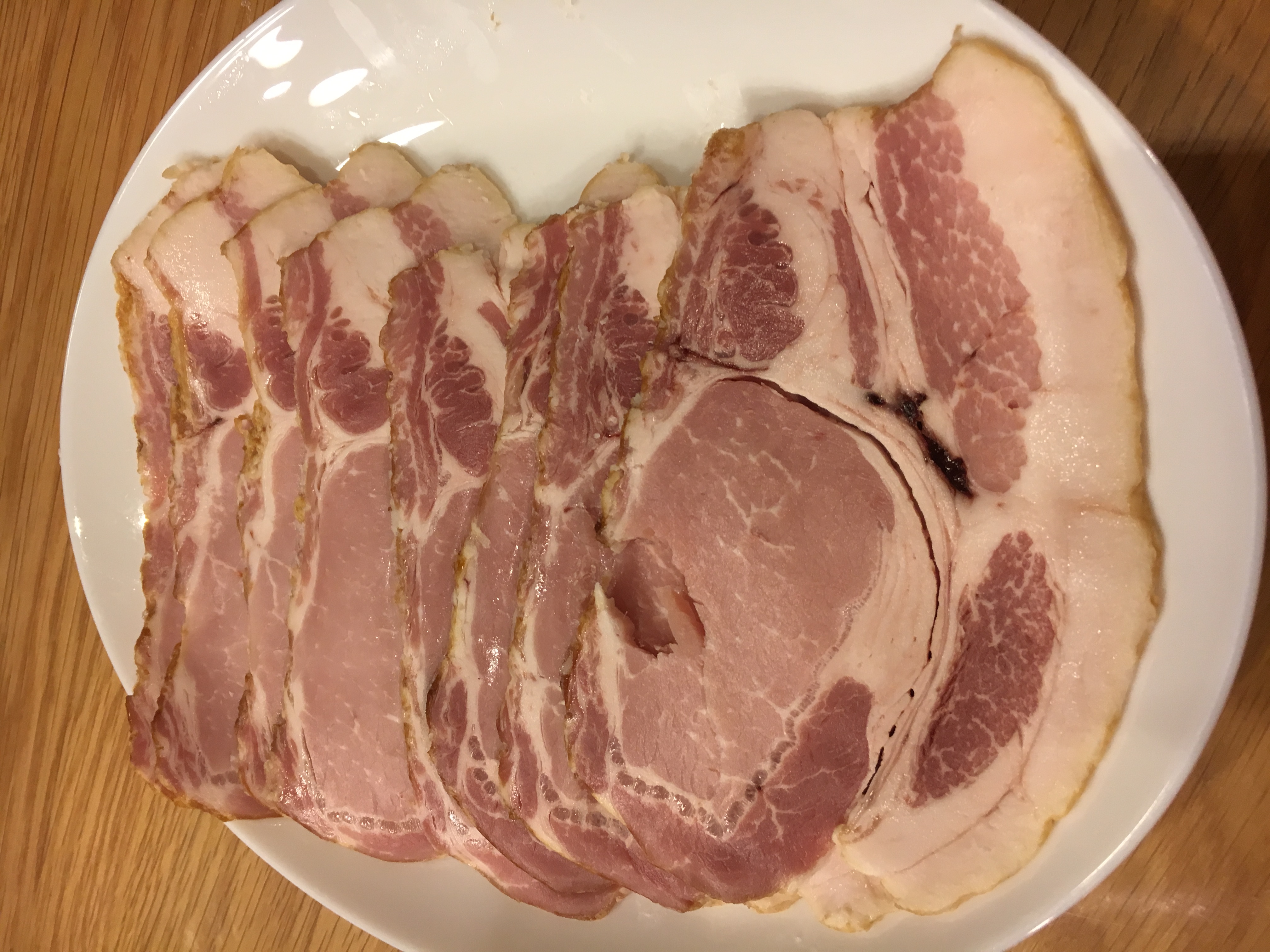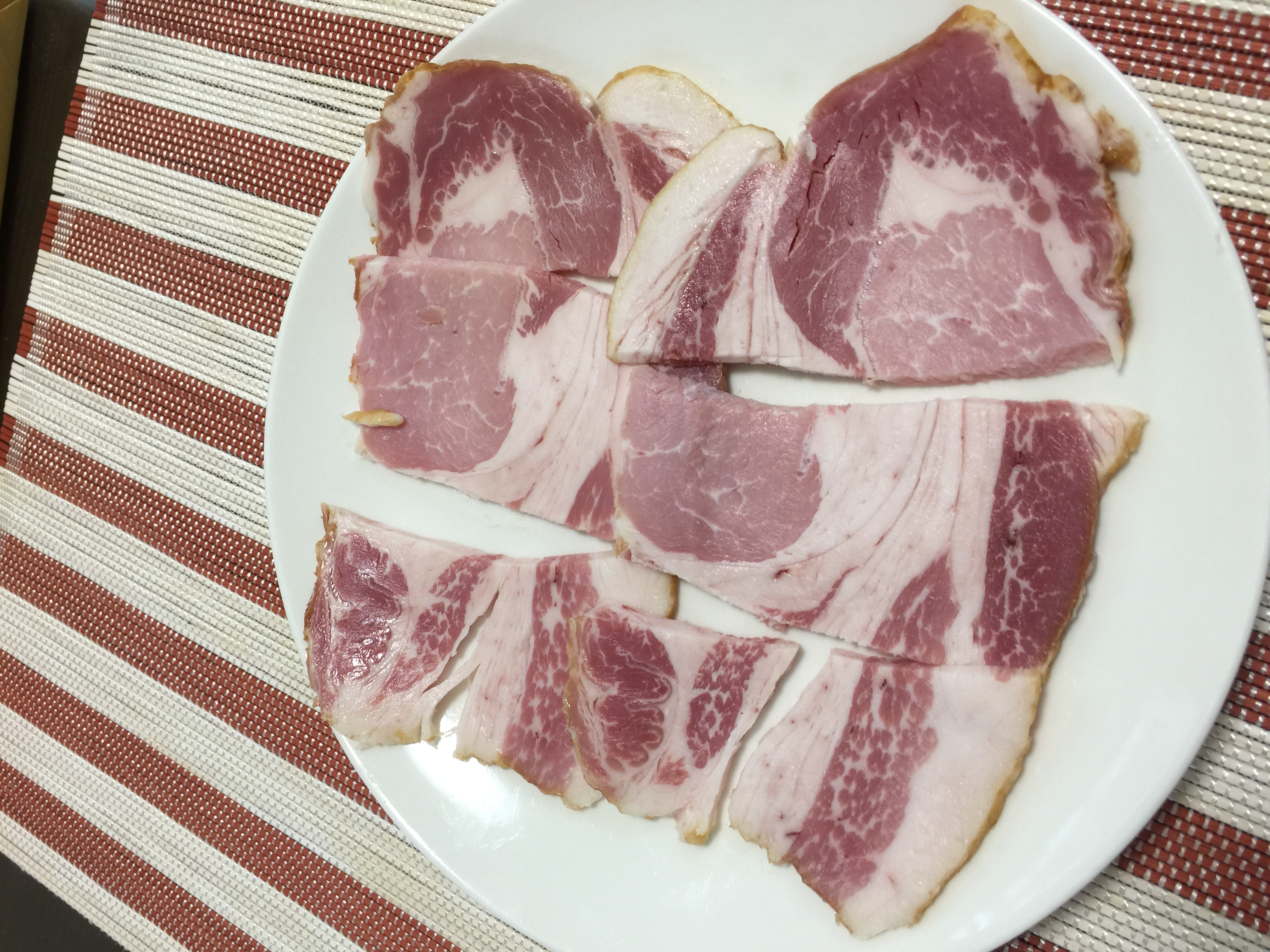 まずは、2枚をそのまま生で。ハムと言うよりは、ステーキを食べているような、分厚さ、塩味がしっかりとしていてパサつき感は全くなく脂身は口の中の温度でトロけてしまいます。次に、網でかる~く炙りを2枚。私は炙りが好きでしたね。余計な脂身が落ちて、生より逆にあっさりした感じがしました。(焼きすぎると脂身がなくなります。)