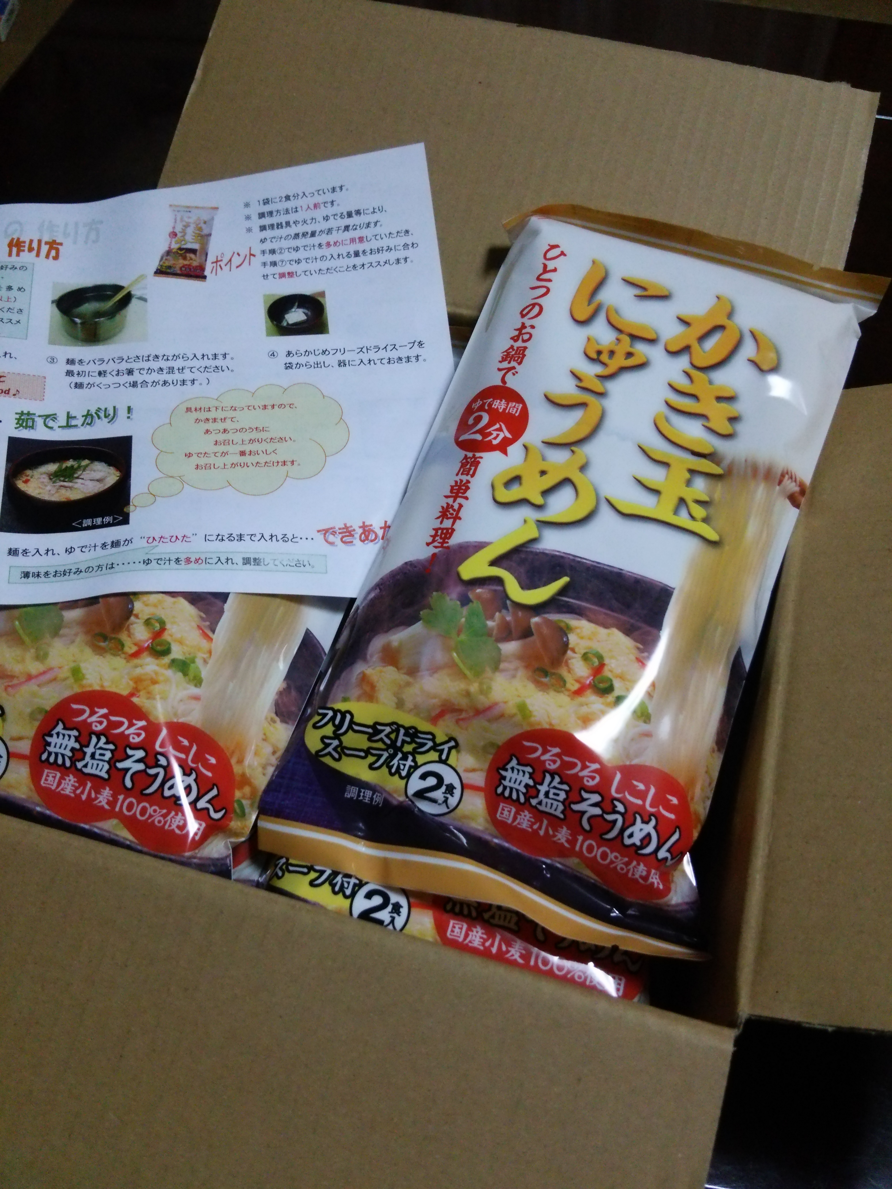 かき玉はフリーズドライになっているので、器に用意して、素麺をお鍋でゆで、そのまま器にゆで汁とにゅうめんをいれて完成です♪