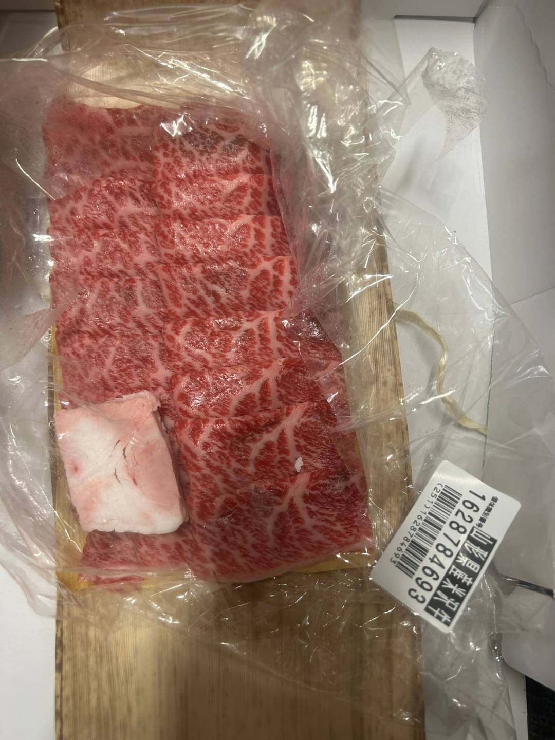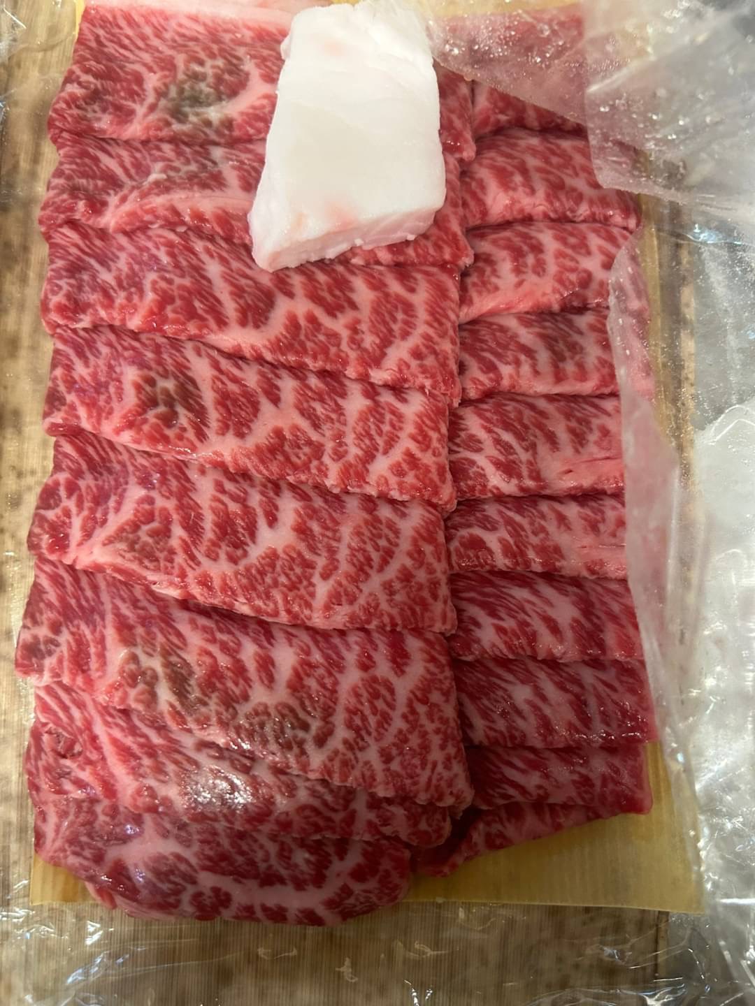そして、その包みを開くと、鮮やかな赤い色にほどよくサシが入った美しいお肉が登場。牛脂もついてます。