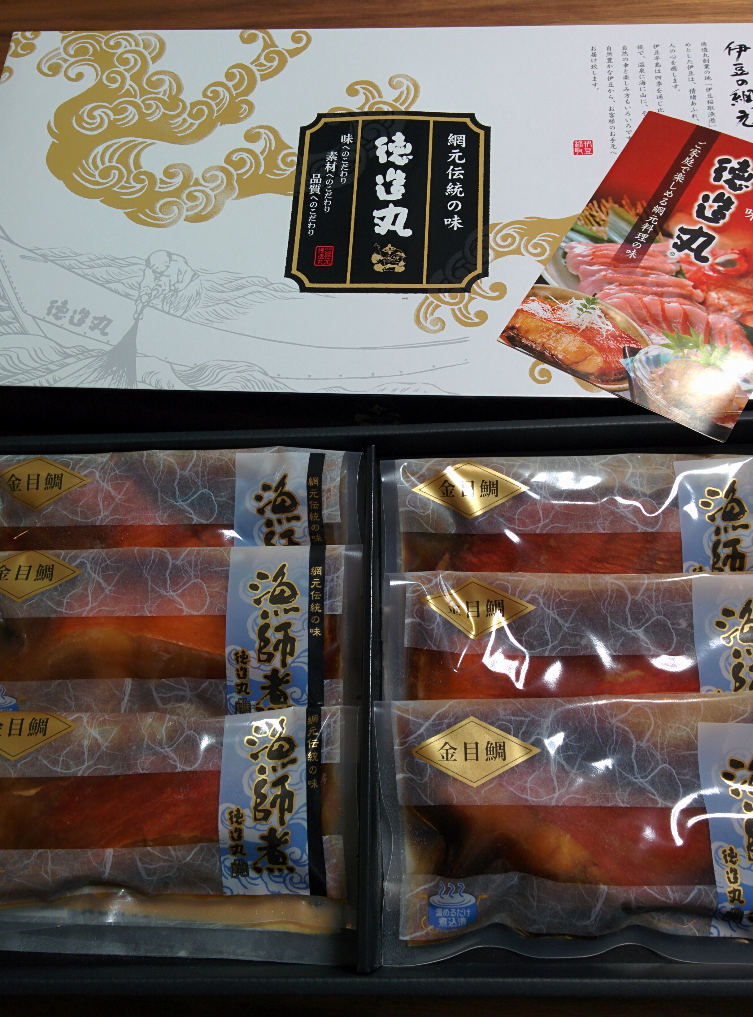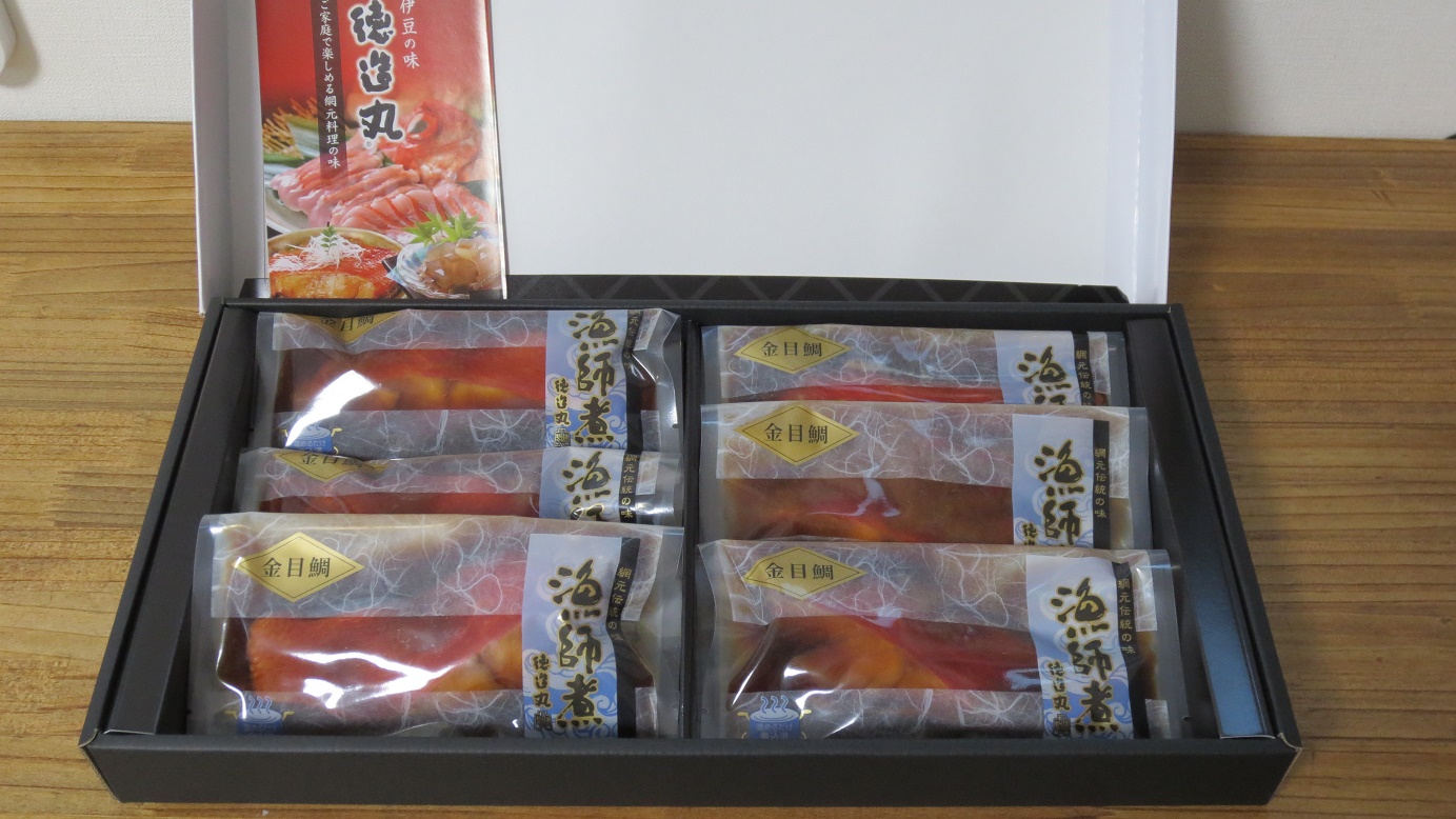 脂のりのよい肉厚な金目鯛を厳選し、当社鮮魚工場で板前が手作りした徳造丸自慢の一品。「金目鯛漁師煮」は、創業から伝わる秘伝の煮汁で、金目鯛を甘くこってり煮付けてあります。白いご飯にぴったりのおかずです。また、1切ずつ真空個包装しているから保存にも便利。調理済みなので温めるだけですぐに召し上がれます。化粧箱入りなので、贈答用にもおすすめです。