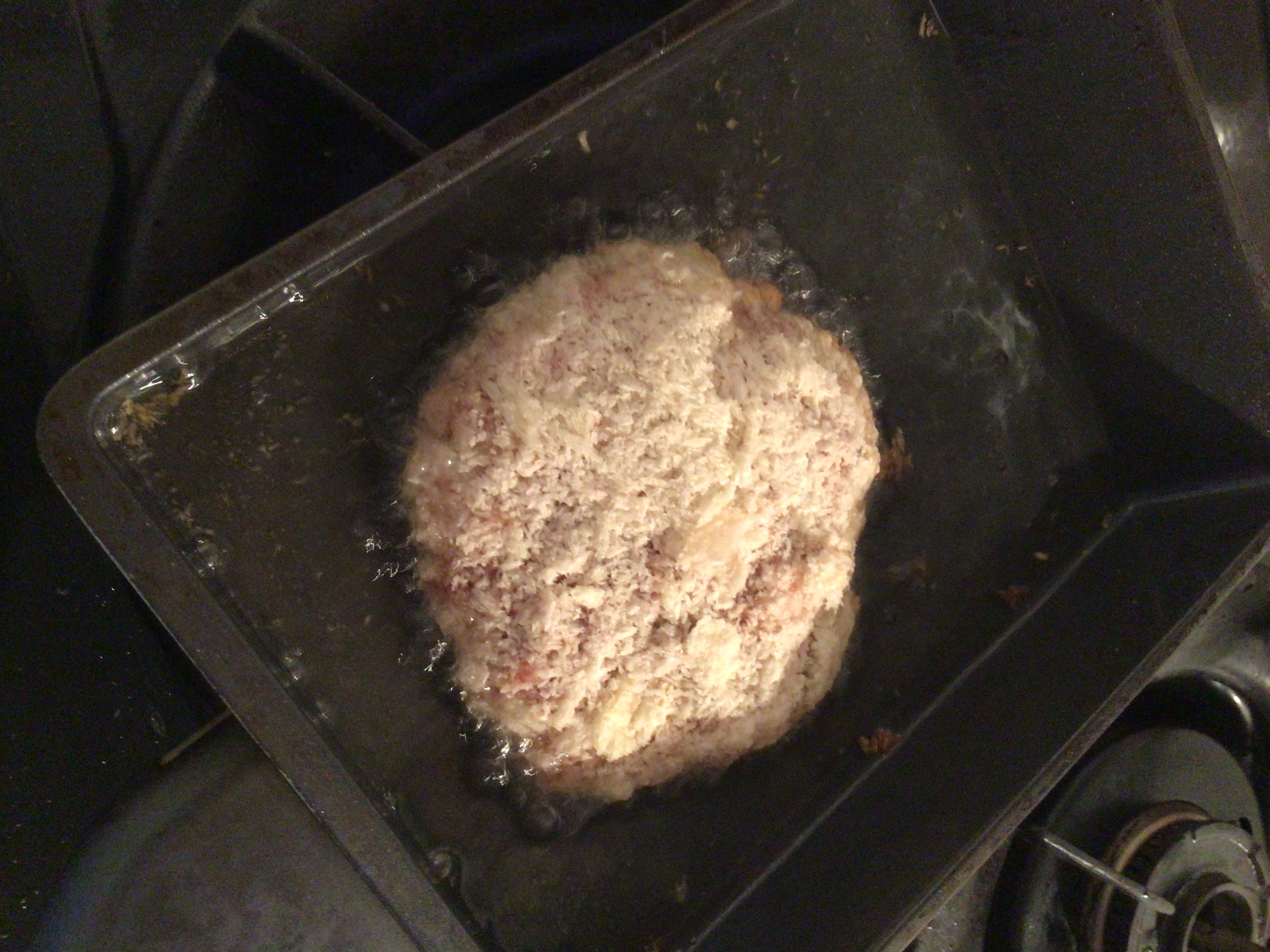 開封してみると、ただ者では無い風貌のメンチカツ登場。生メンチカツらしく真っ白い衣がスケルトン部分から見えます。