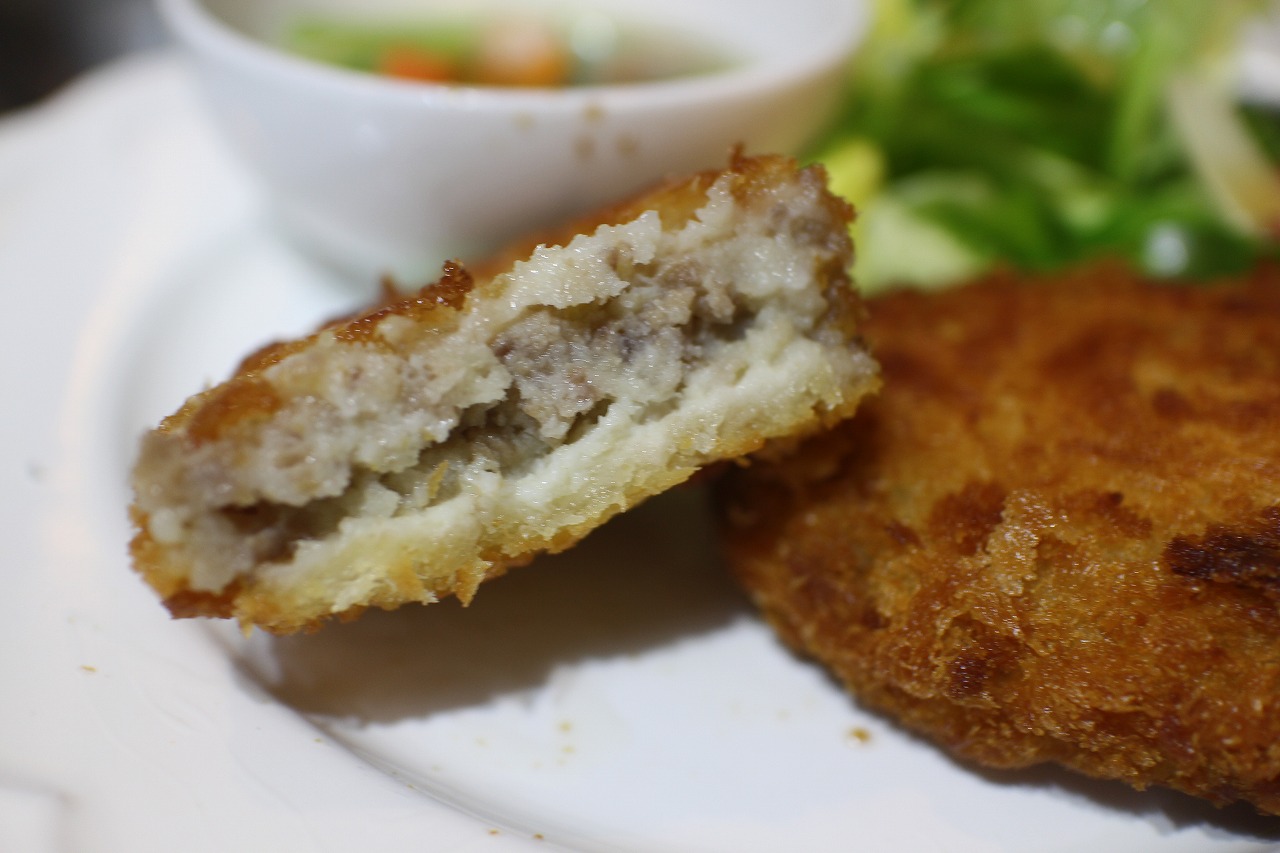 お店のお薦め通り、揚げたてアツアツのコロッケには何も付けずにそのままパクリ!「・・・えっ?何コレ?超甘~い!美味し~い!」と家族全員がその美味しさにびっくり!間違いなく、今まで食べたコッロケの中でずば抜けて一番美味しいと思いました。外はサクサク、中はしっとりジューシー。なんでこんなに甘いの?と不思議に思う程の旨みがぎゅっと詰まっている感じです。これは確かにソース要らずですね。ソースをかけるのはもったいないです。イベリコ豚の実力をまざまざと見せつけられた感じのコロッケ。正直、食べる前は1個250円を上回るコロッケはお高いなぁ・・・と思ってました。でも食べた瞬間にそんなケチな思いは消えちゃいます。それ程の、それ以上の価値を感じるコロッケです!
