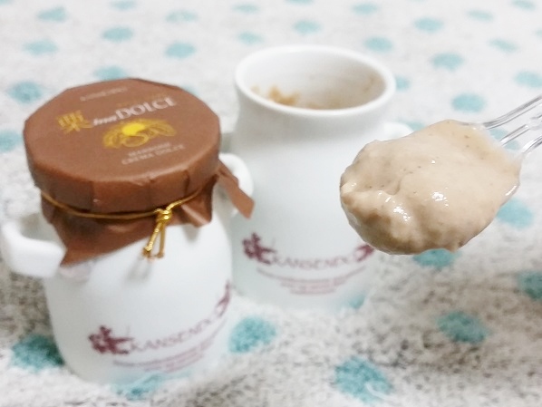 このまま食べると、モンブランのクリーム部分を食べているような濃厚さと重さが有り、口ざわりもちょっとざらっとしていて栗の濃厚さが口に広がります♪