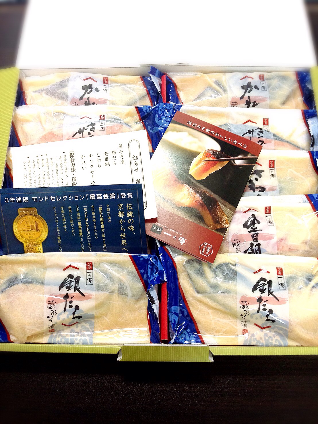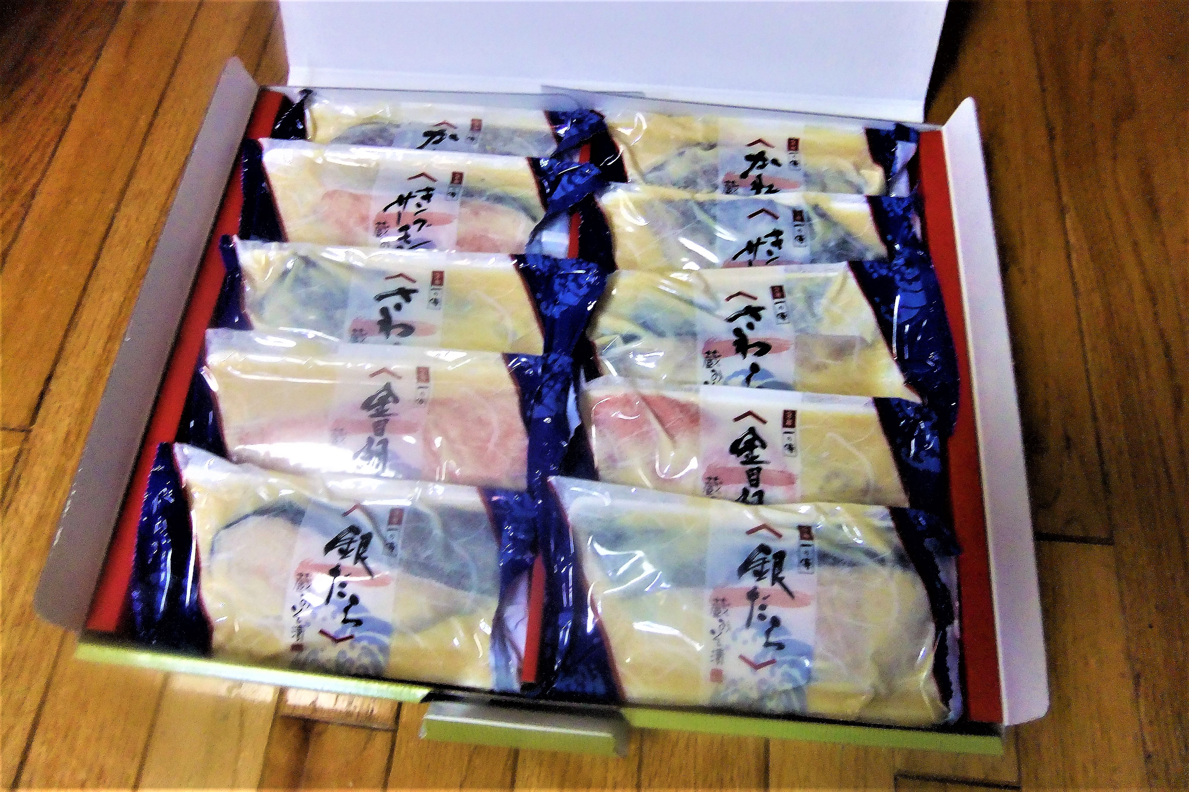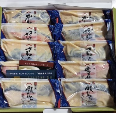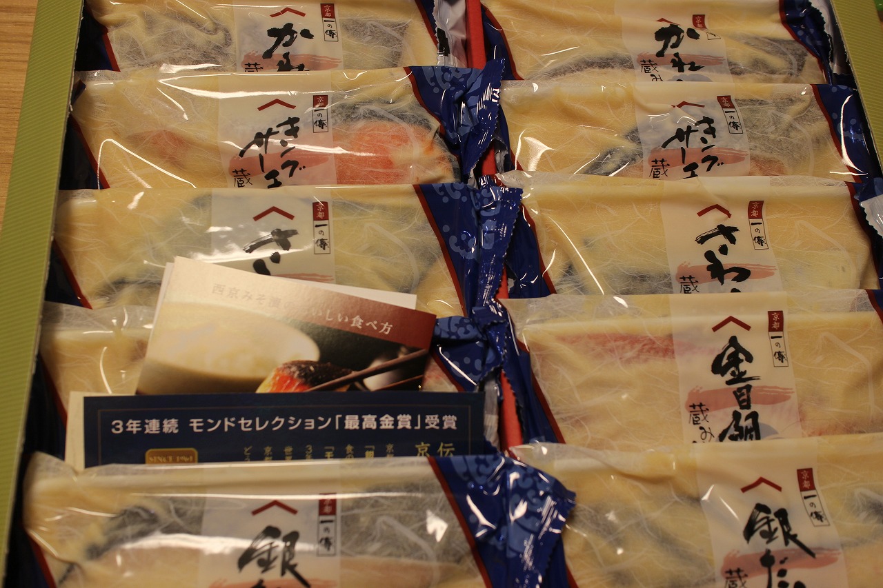 銀だら、金目鯛、さわら、キングサーモン、かれいが二切れずつ入っていて、一度にいろんな西京漬けが食べ