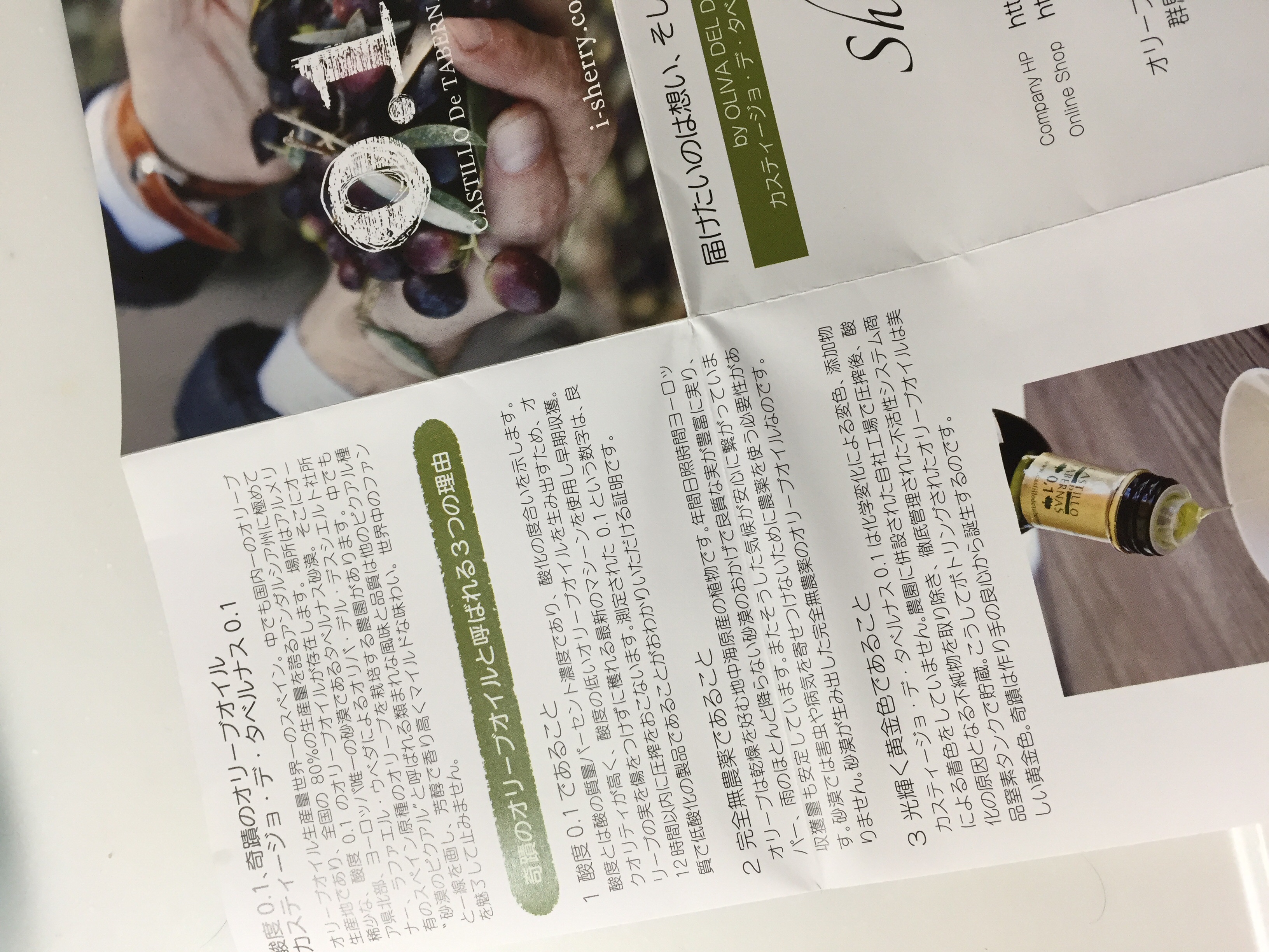 酸度0.1、農薬(栽培前、栽培期間中共に不使用)、無着色、無添加の奇蹟のオリーブオイルです。カスティージョ・デ・タベルナス0.1の最大の特徴ともいえるのは他社と比べてオレイン酸やビタミンAやE、さらに天然の抗酸化物質・ポリフェノールの含有量が高い上、熱にも強く、丁寧に不純物除去を行っているため酸化しにくいのが特徴です。