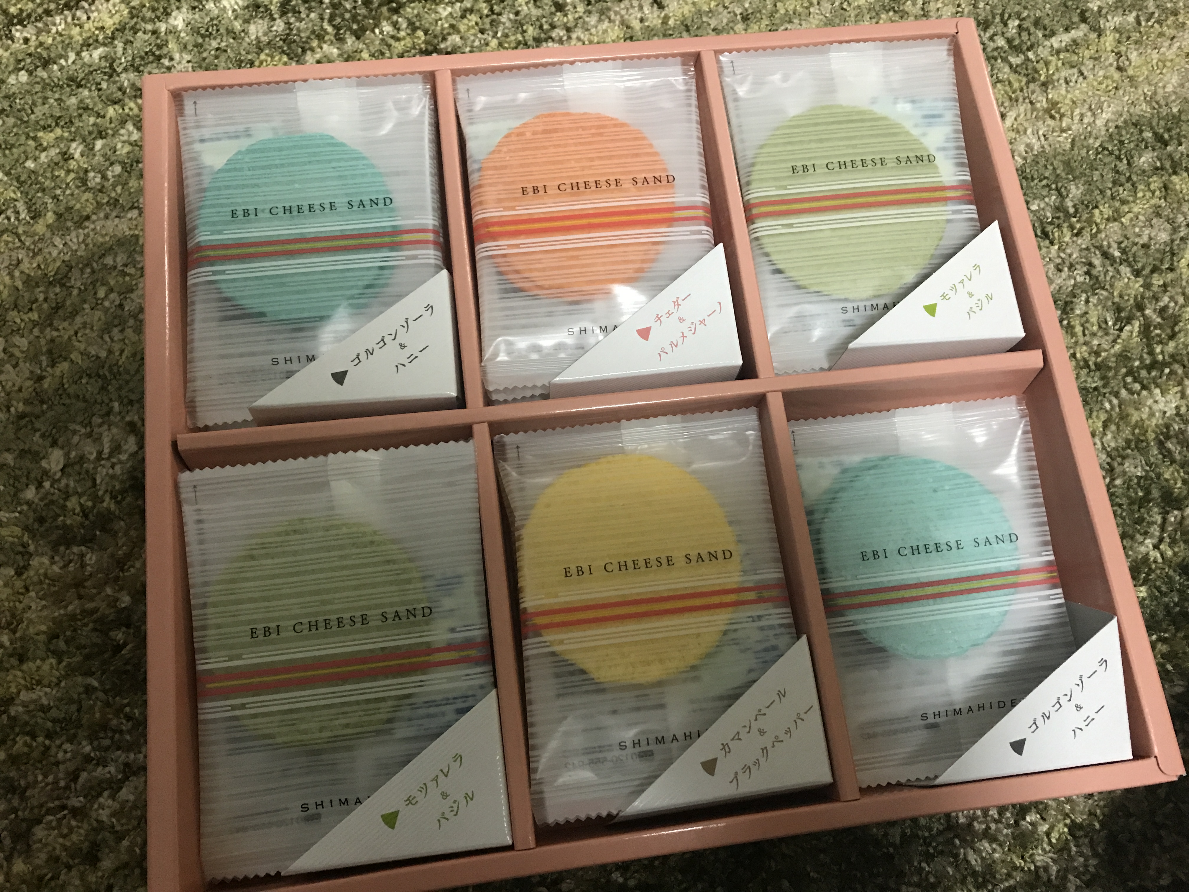 こだわりのチーズをサクサクの海老煎餅でサンド。まるでマカロンのような和スイーツです。ゴルゴンゾーラ&ハニー、カマンベール&ブラックペッパー、モツァレラ&バジル、チェダー&パルメジャーノの4種類が入っており、どれも個性的で濃厚な味わいです。観て楽しい、食べて美味しい、新感覚なえび菓子を楽しめます。