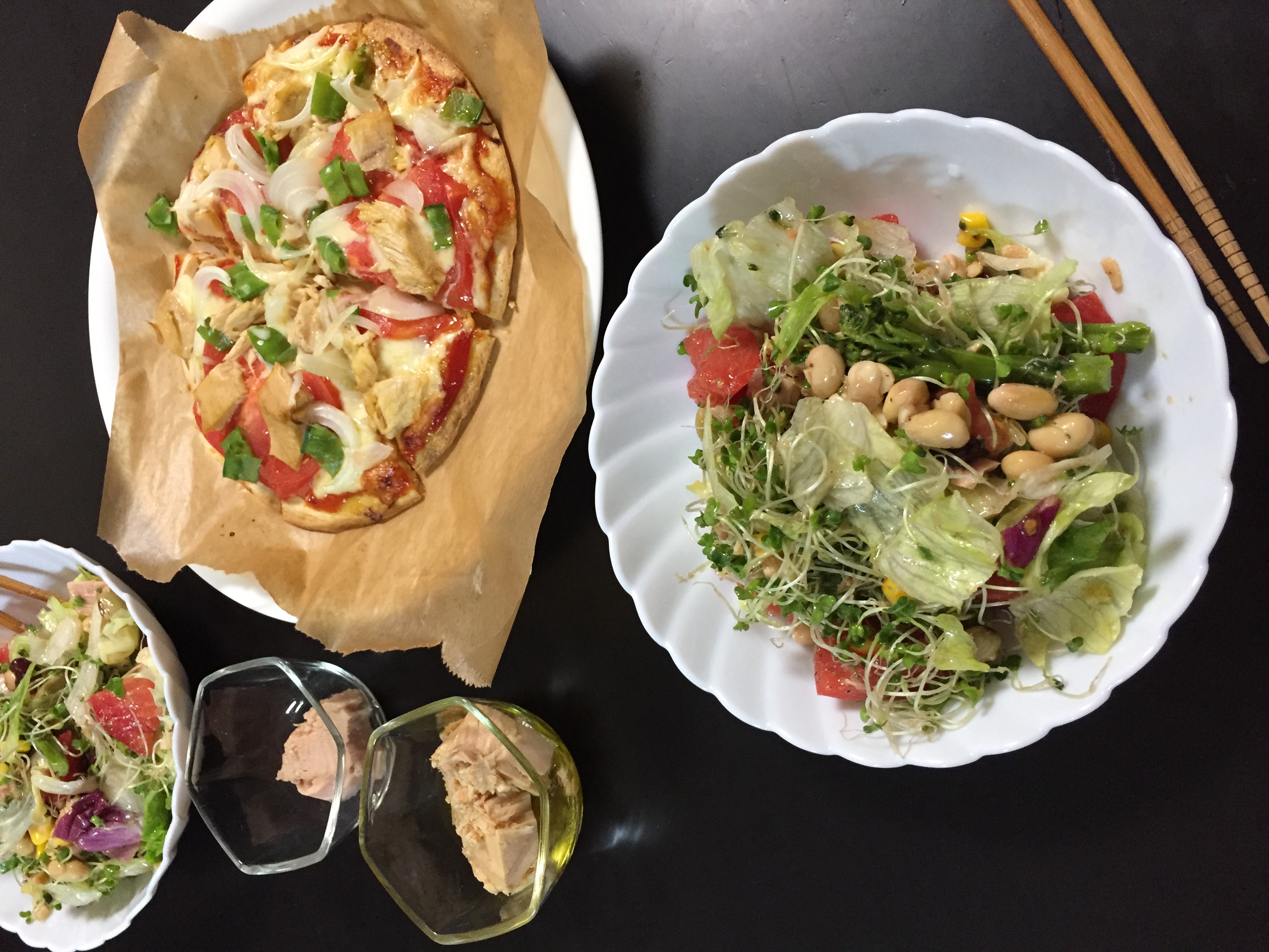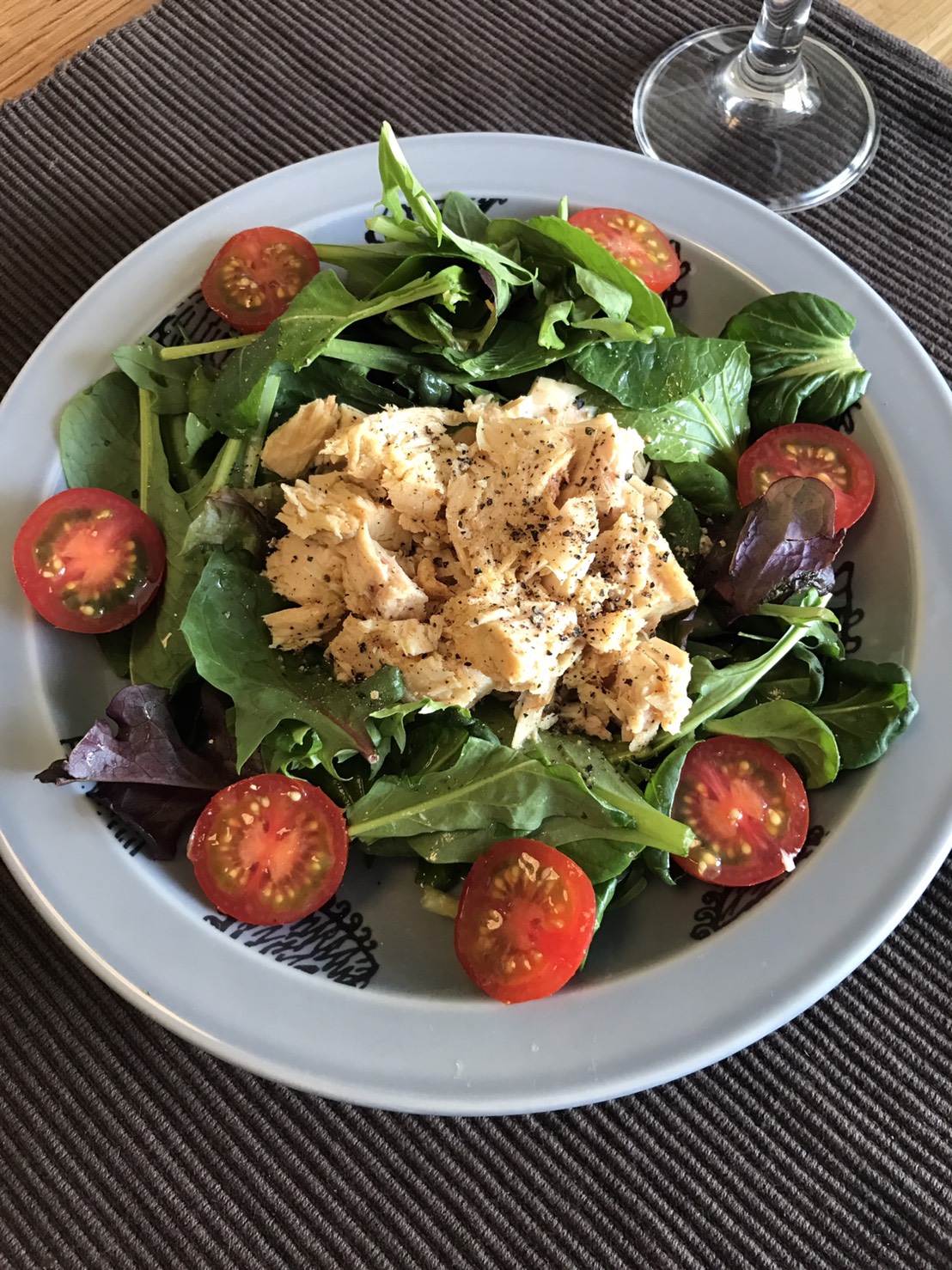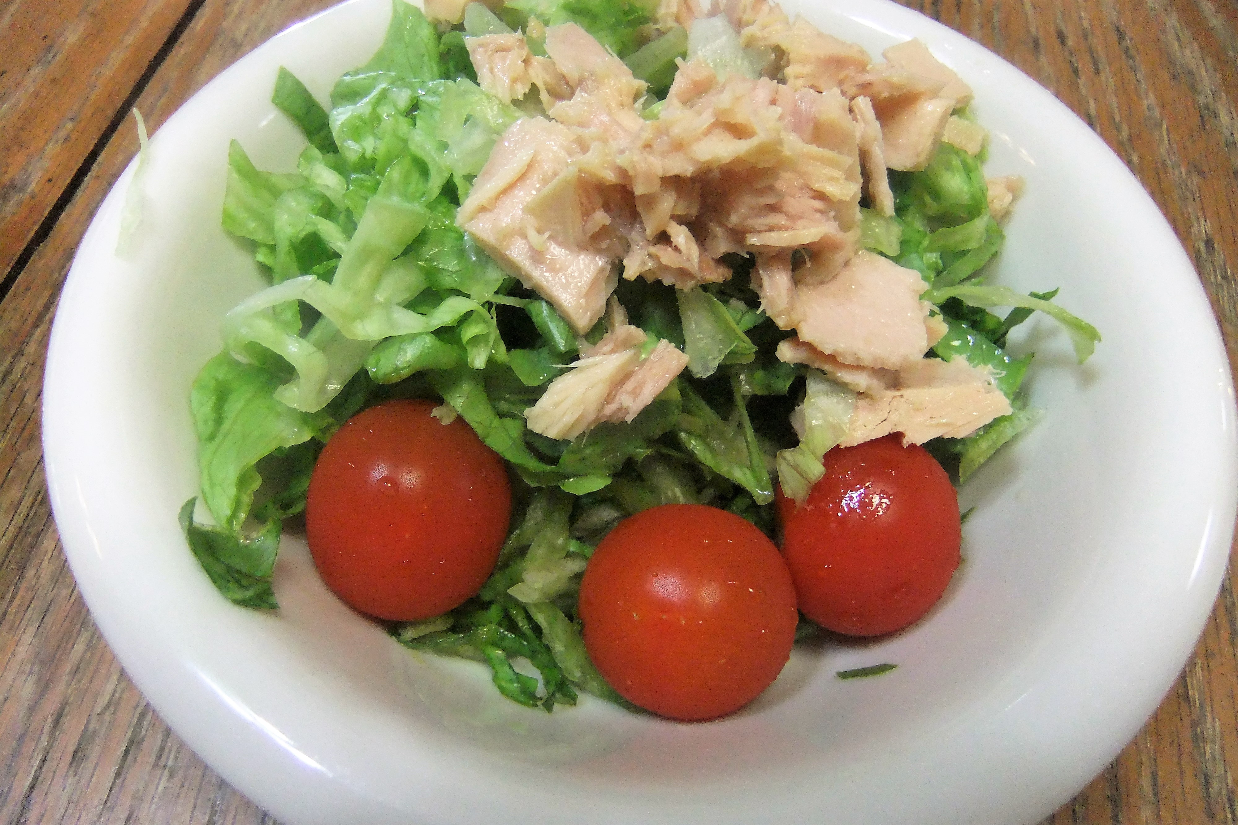 ・サラダにツナ1缶まるごと乗せて贅沢サラダ!オリーブオイルツナはオイルまで美味しく食べることができます。