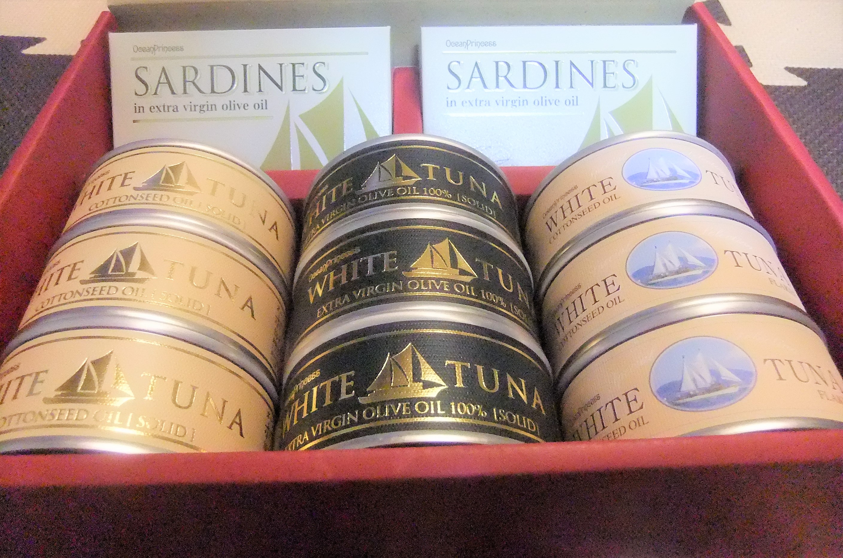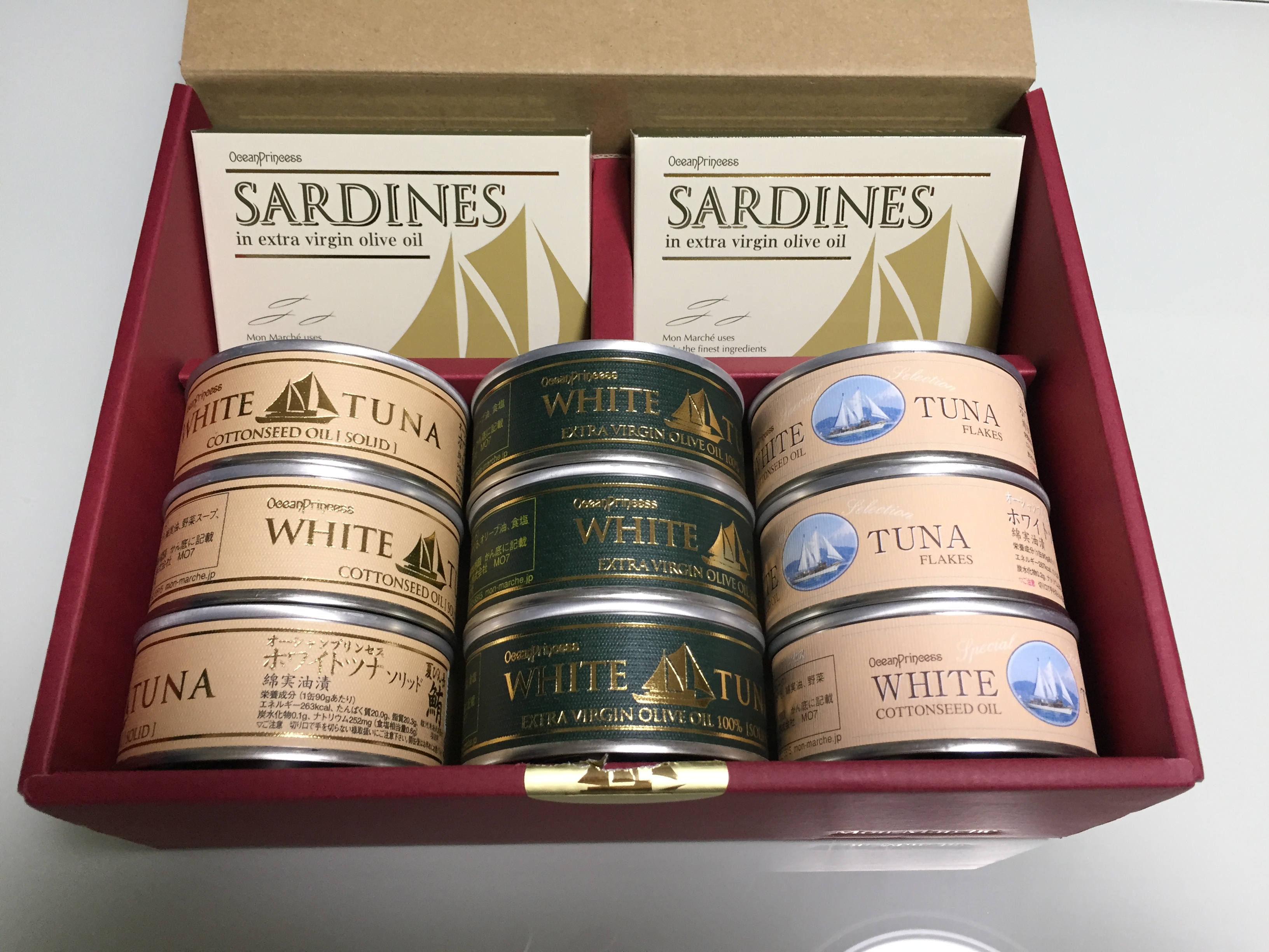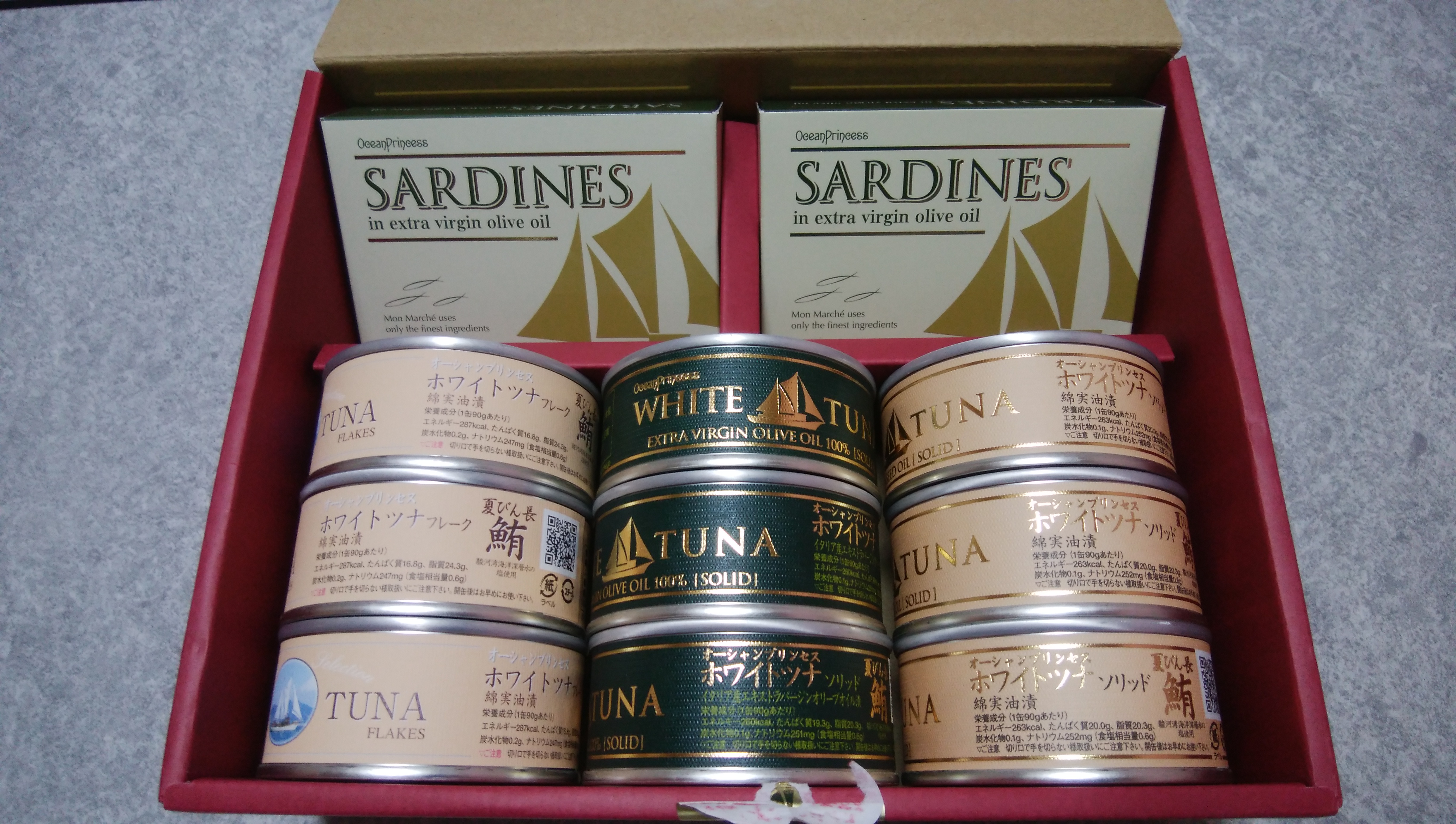 こだわりの高級素材「一本釣り夏びん長マグロ」のみを原料としたツナ缶「オーシャンプリンセス ホワイトツナ」3種と、国内水揚げの近海いわしをイタリア産エキストラバージンオリーブオイルで漬け込んだ「オイルサーディン」のギフトセット。