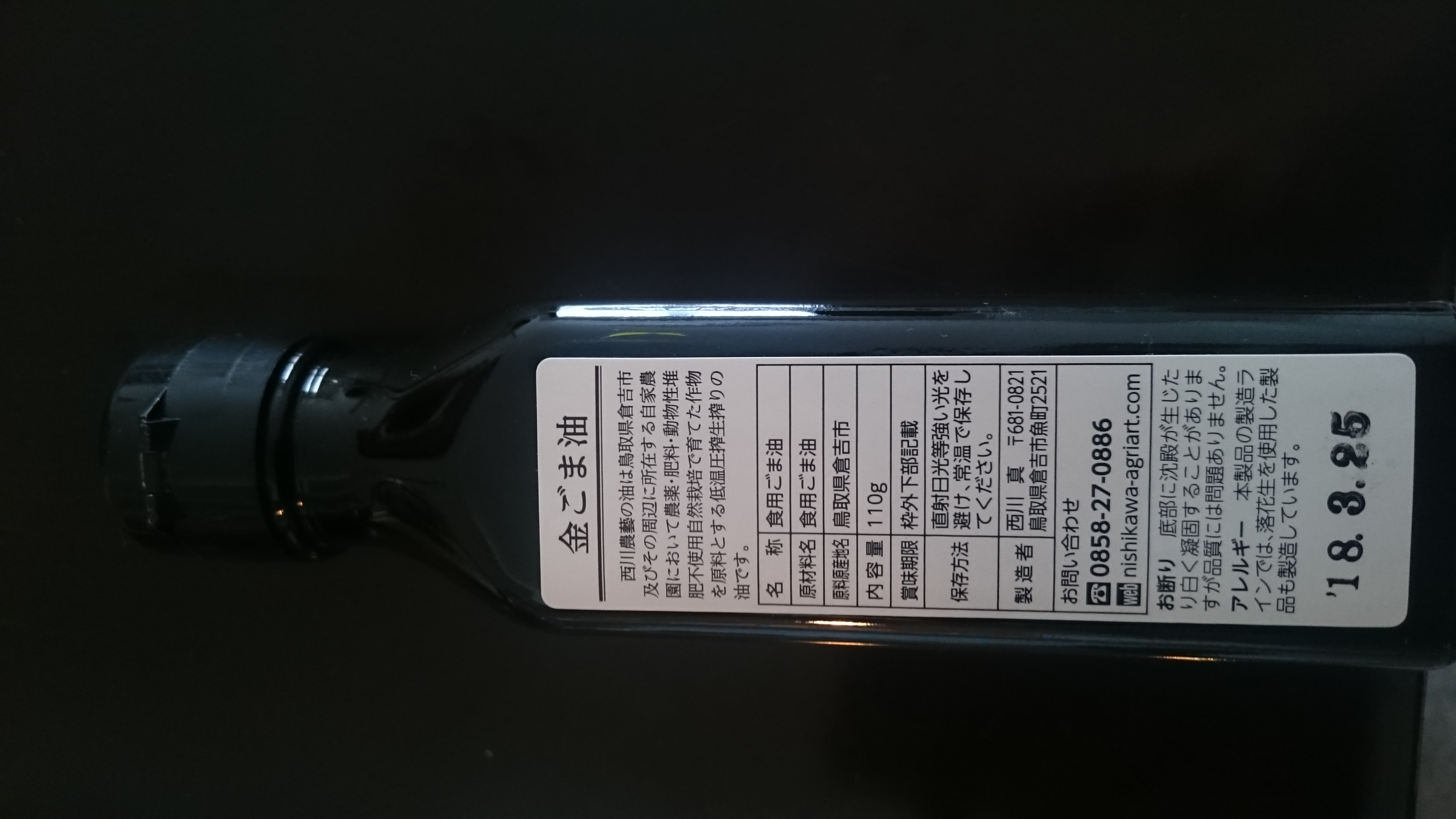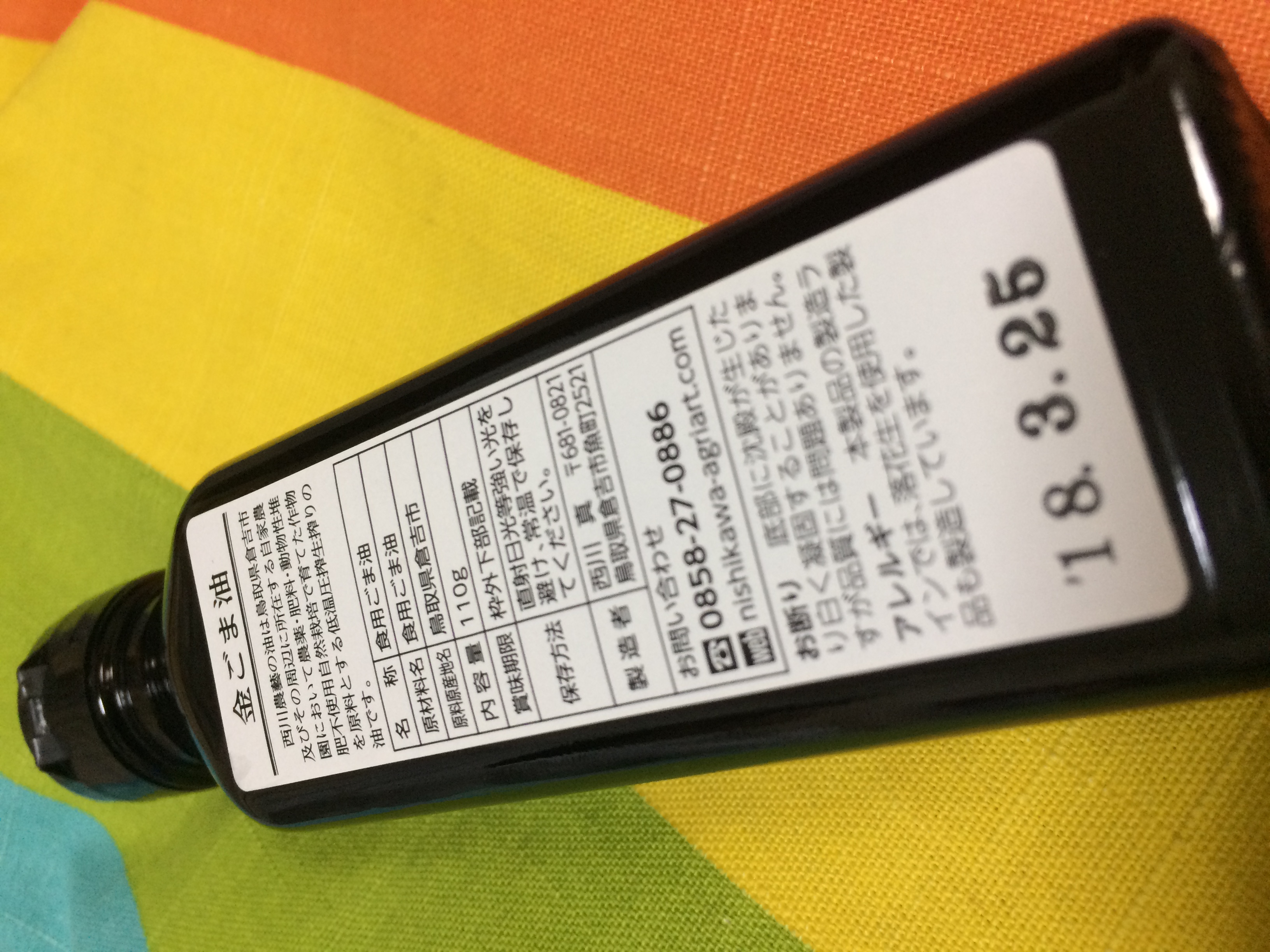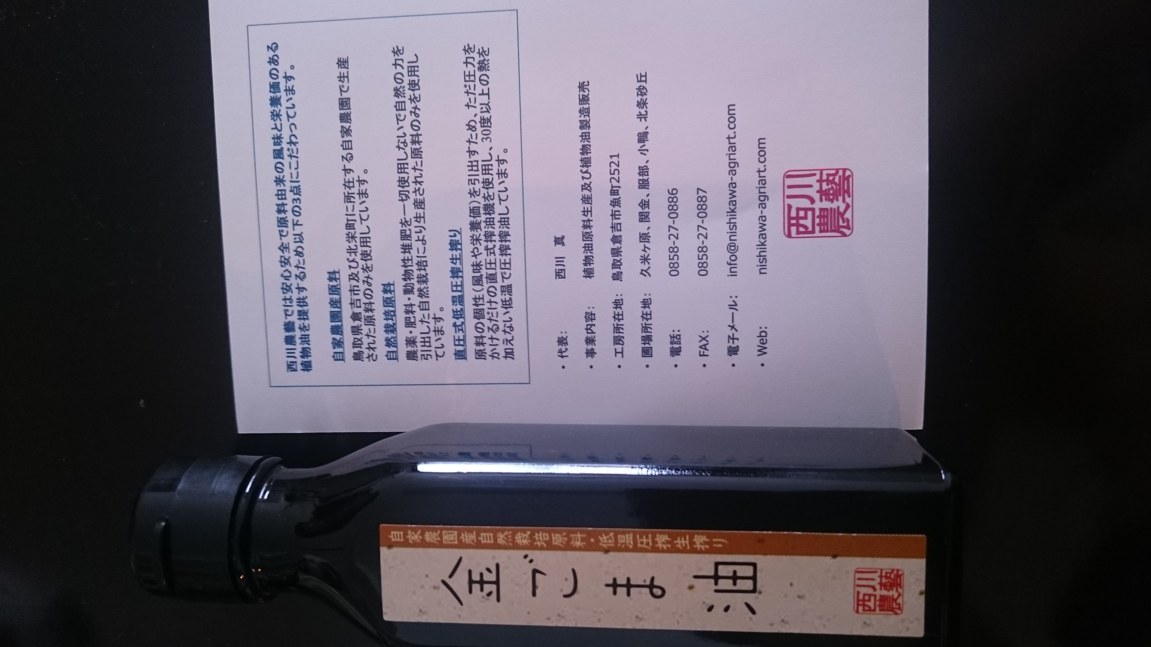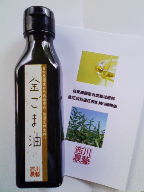 低温で丁寧に圧搾した無添加・無着色・無調整の完全生搾り金ごま油。原料となる金ごまは鳥取県倉吉市内に所在する豊かな黒ボク土譲の自家農園で農薬(栽培期間中不使用)・肥料・動物性堆肥を一切使用しない自然栽培で育てました。