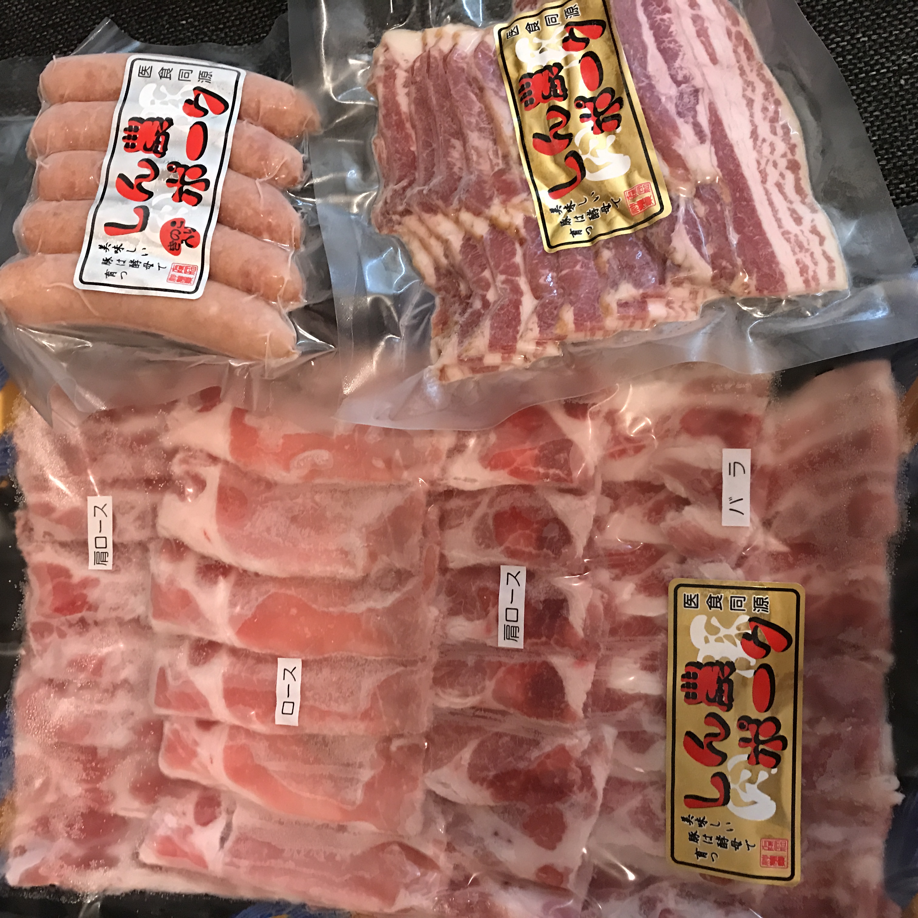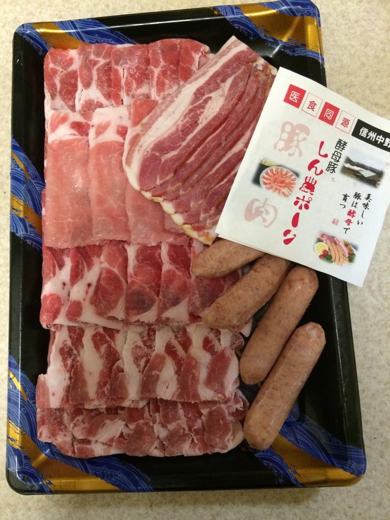 信州中野の大自然でゆったり育った酵母豚「しん農ポーク」の3点セット。スライス盛合せ、えのきウインナー、ベーコンが楽しめます。