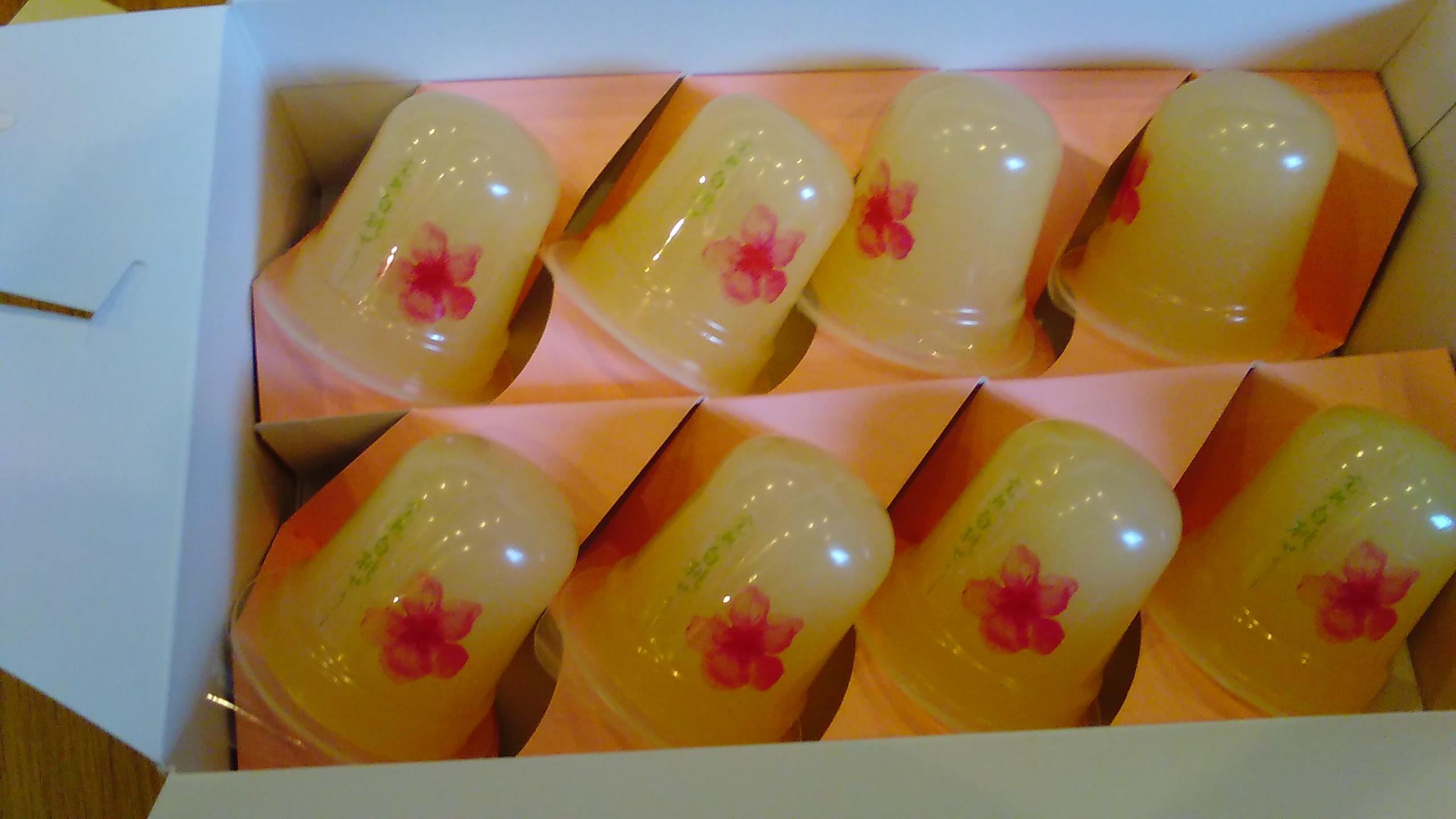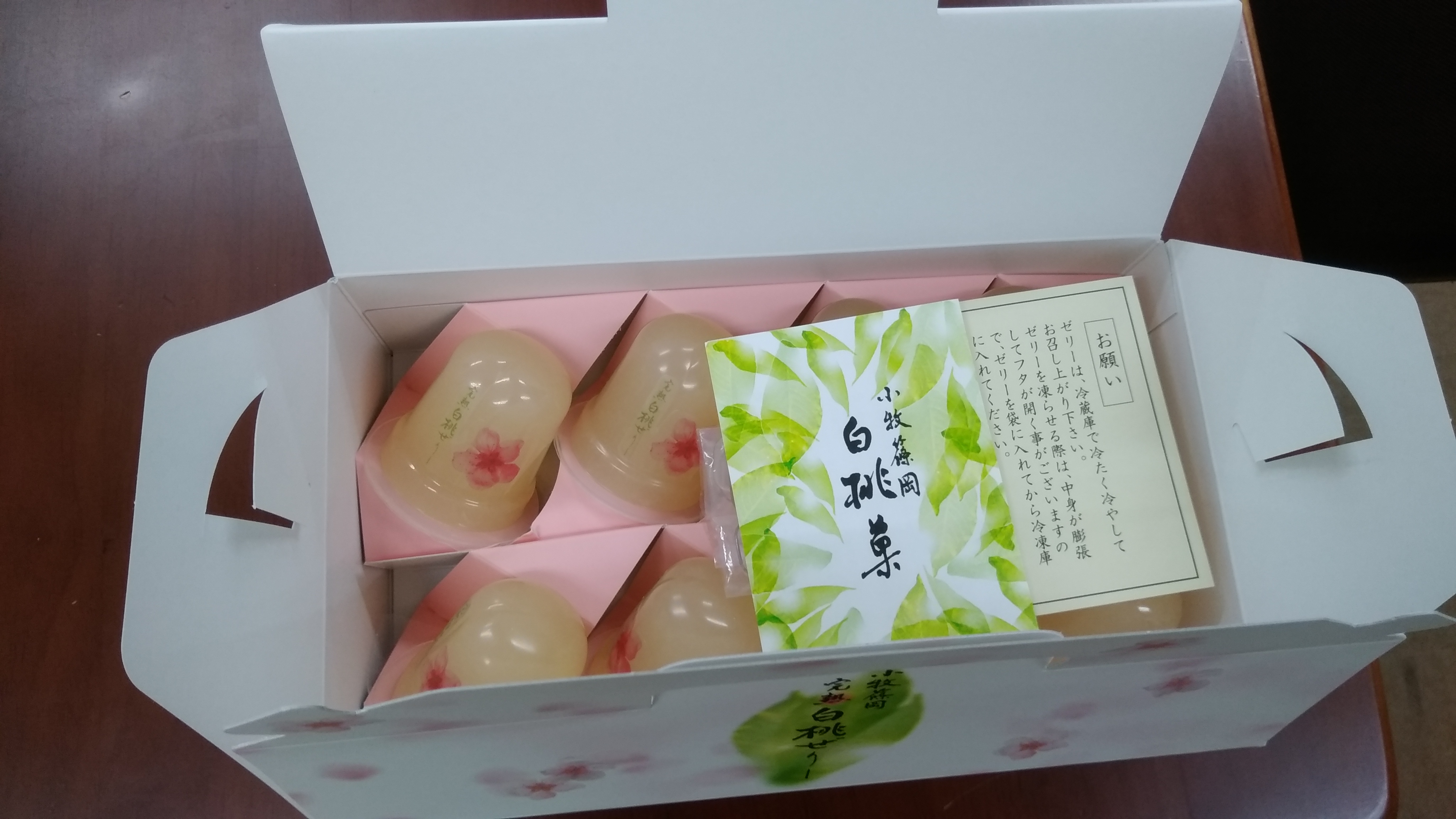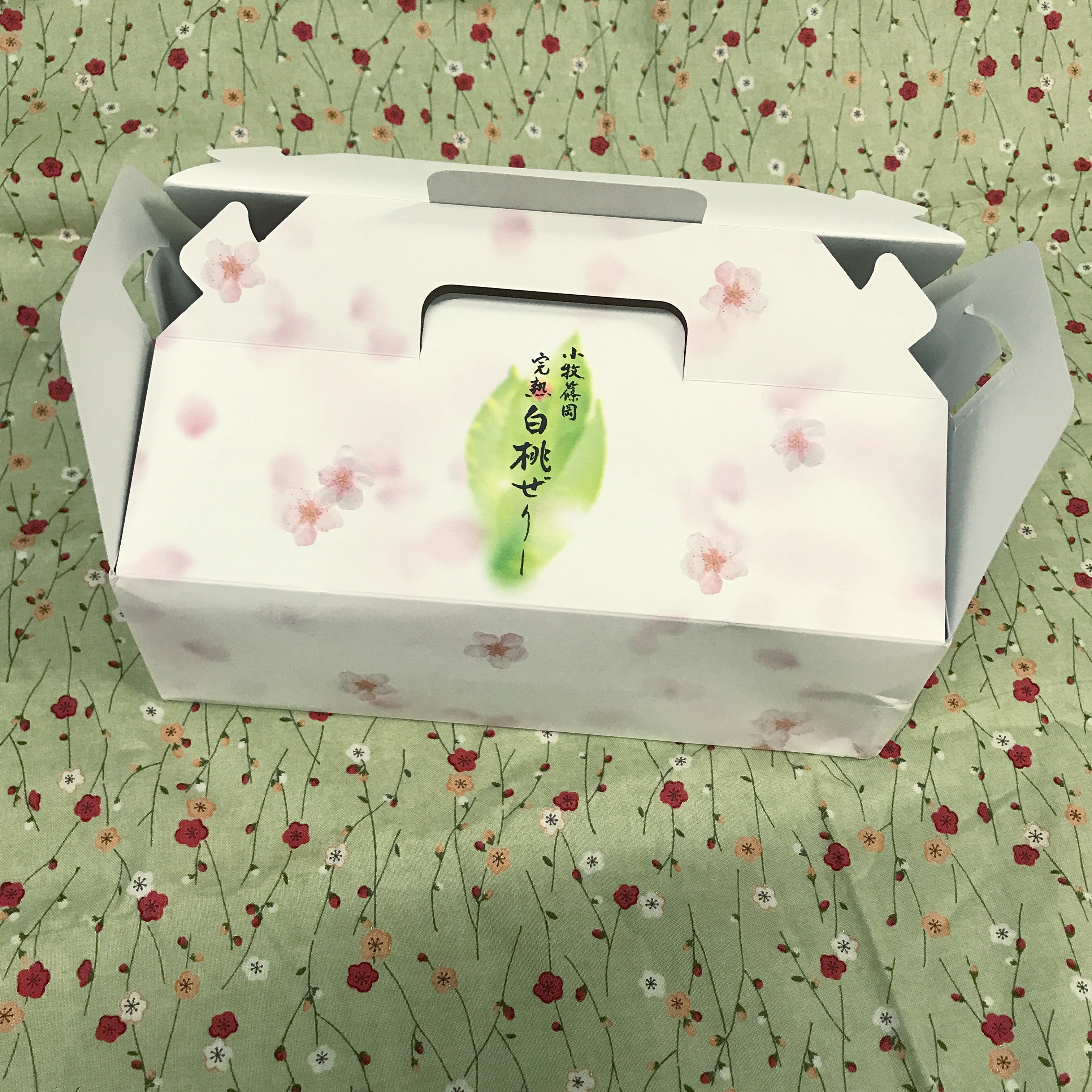 白桃ゼリーが入っている箱は、まるでケーキを入れるような形でした。箱だけを見ると中にゼリーが入っているとは想像しないかも!!