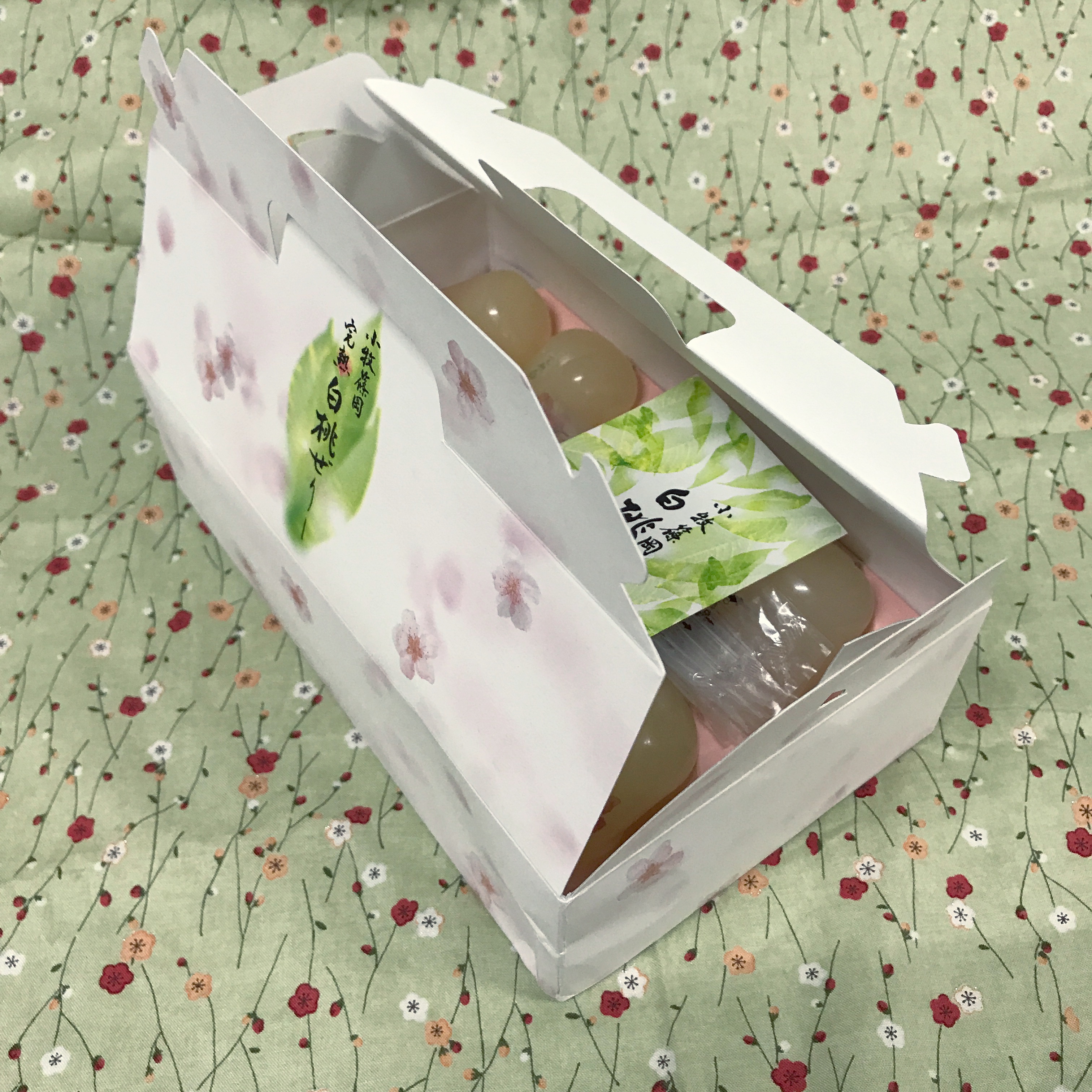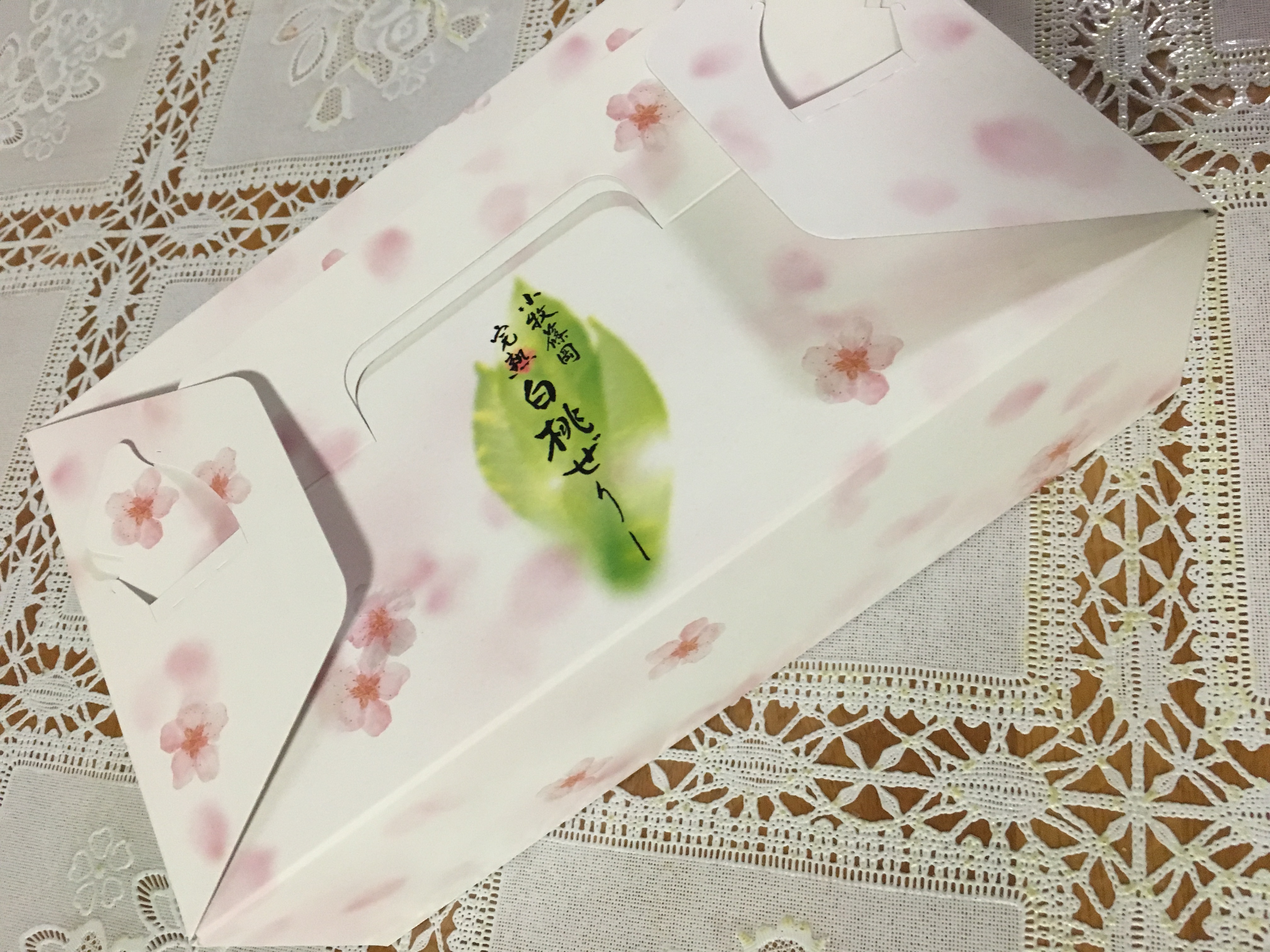 ケーキが入っているような、手提げの箱に入って届きます。桃の花の柄入り。