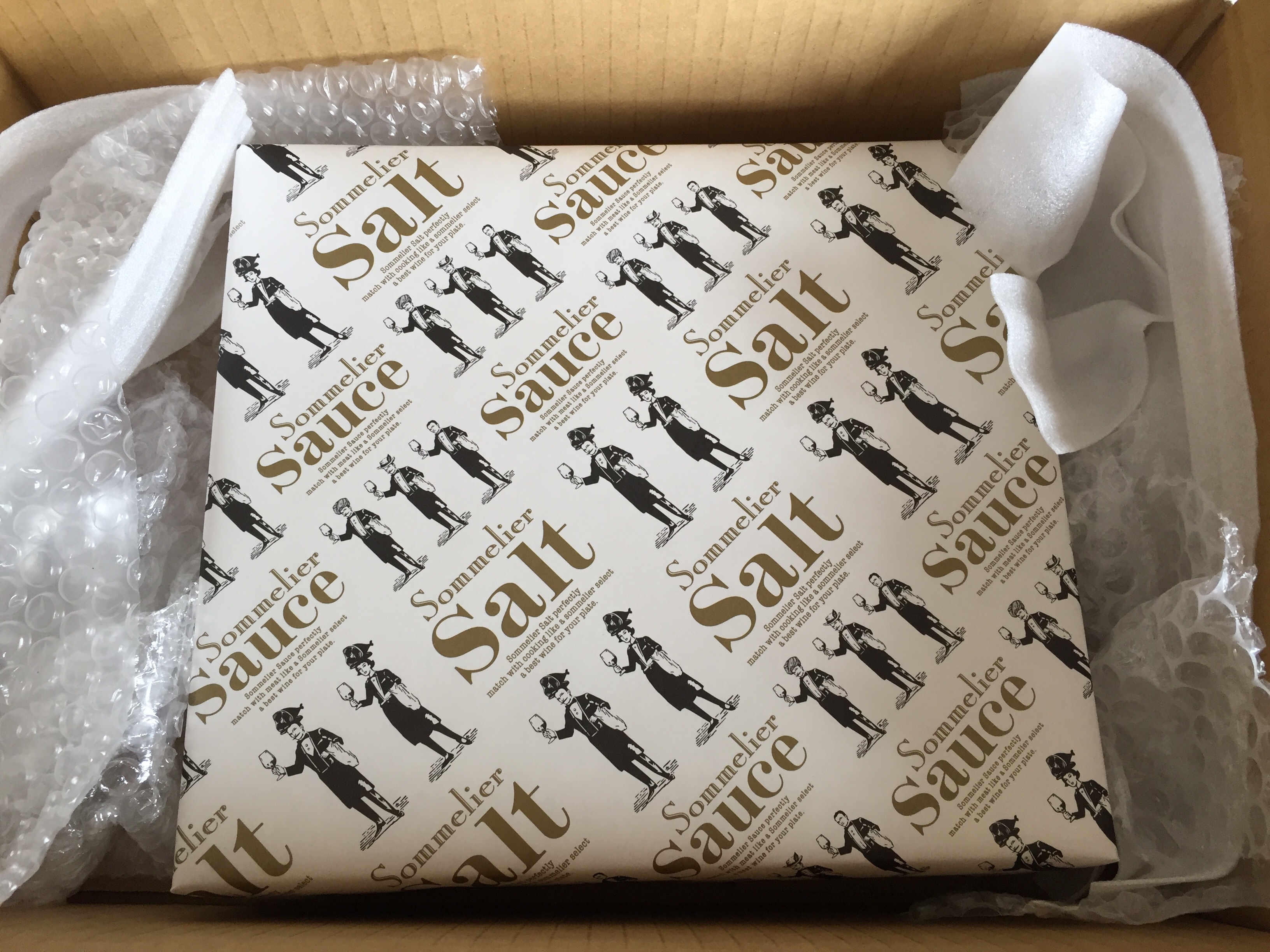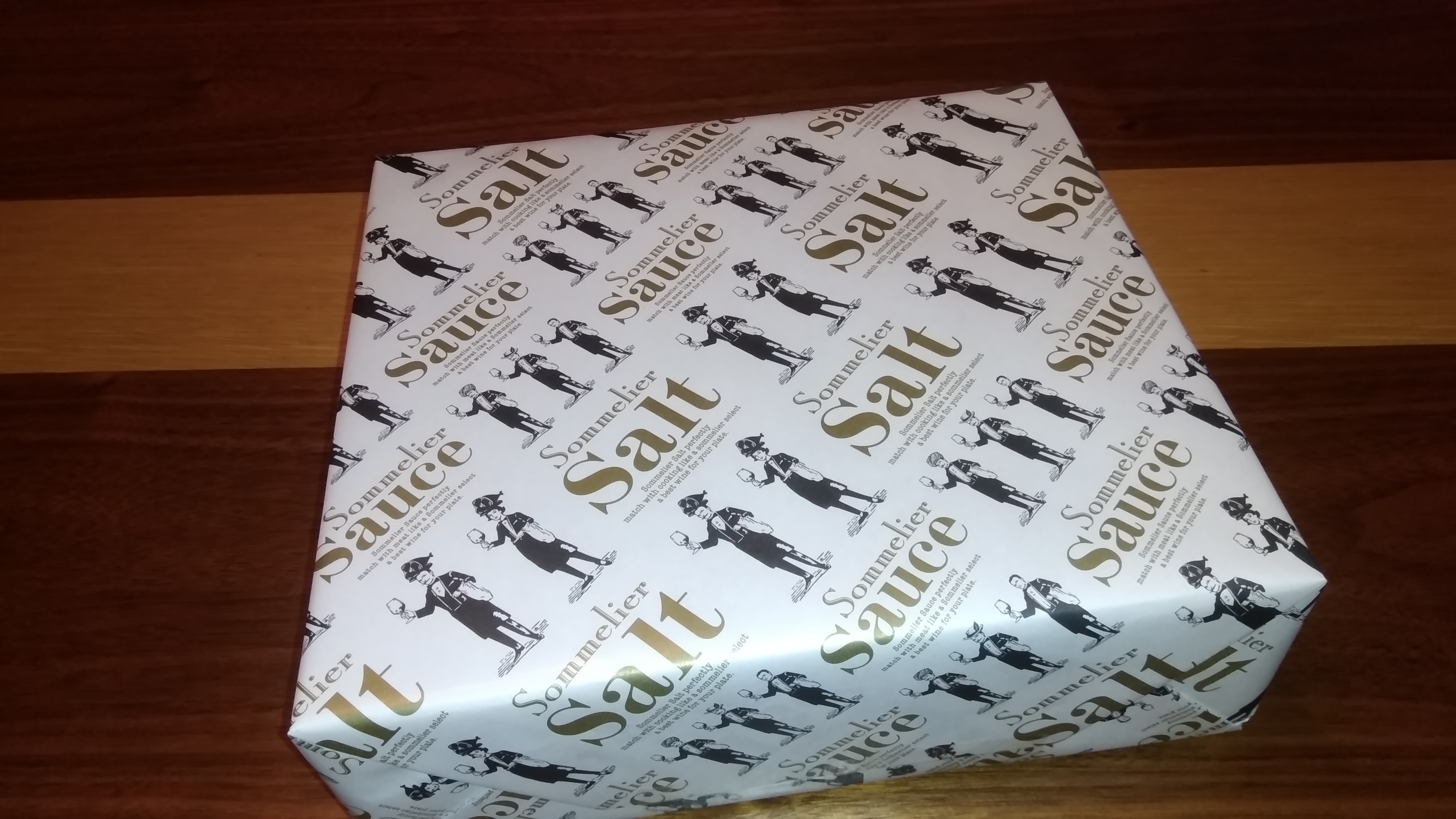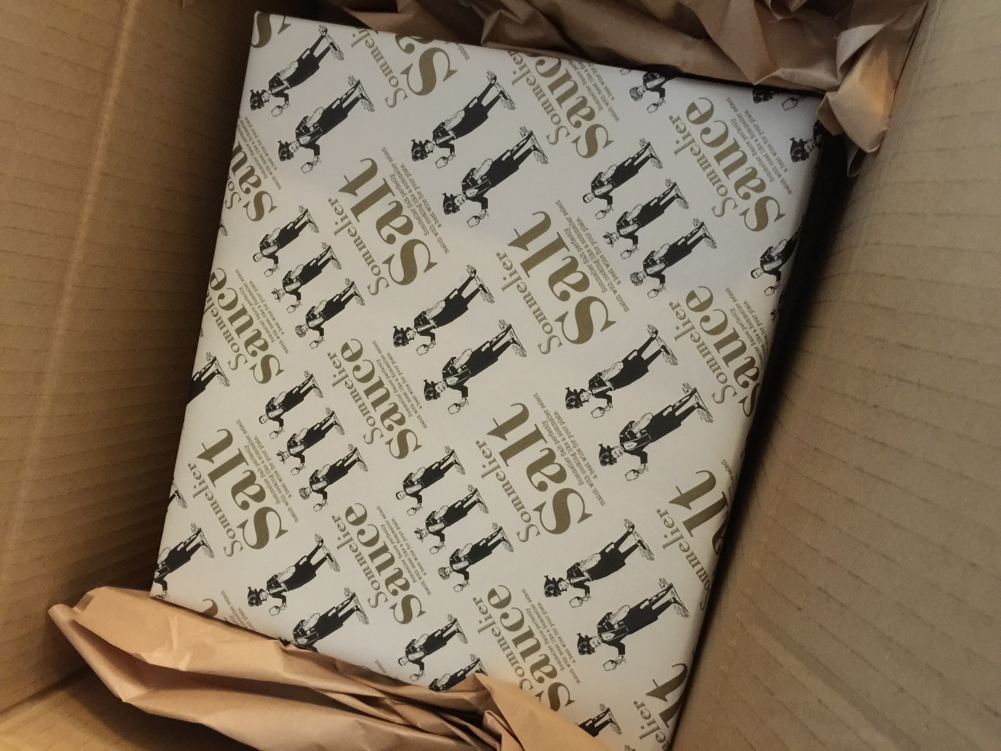 段ボールの中には、ソムリエが描かれたおしゃれな包装紙に包まれた箱が入っていました。破いてしまうのがもったいないと感じるほどセンスの良い包装紙は目を惹きました。