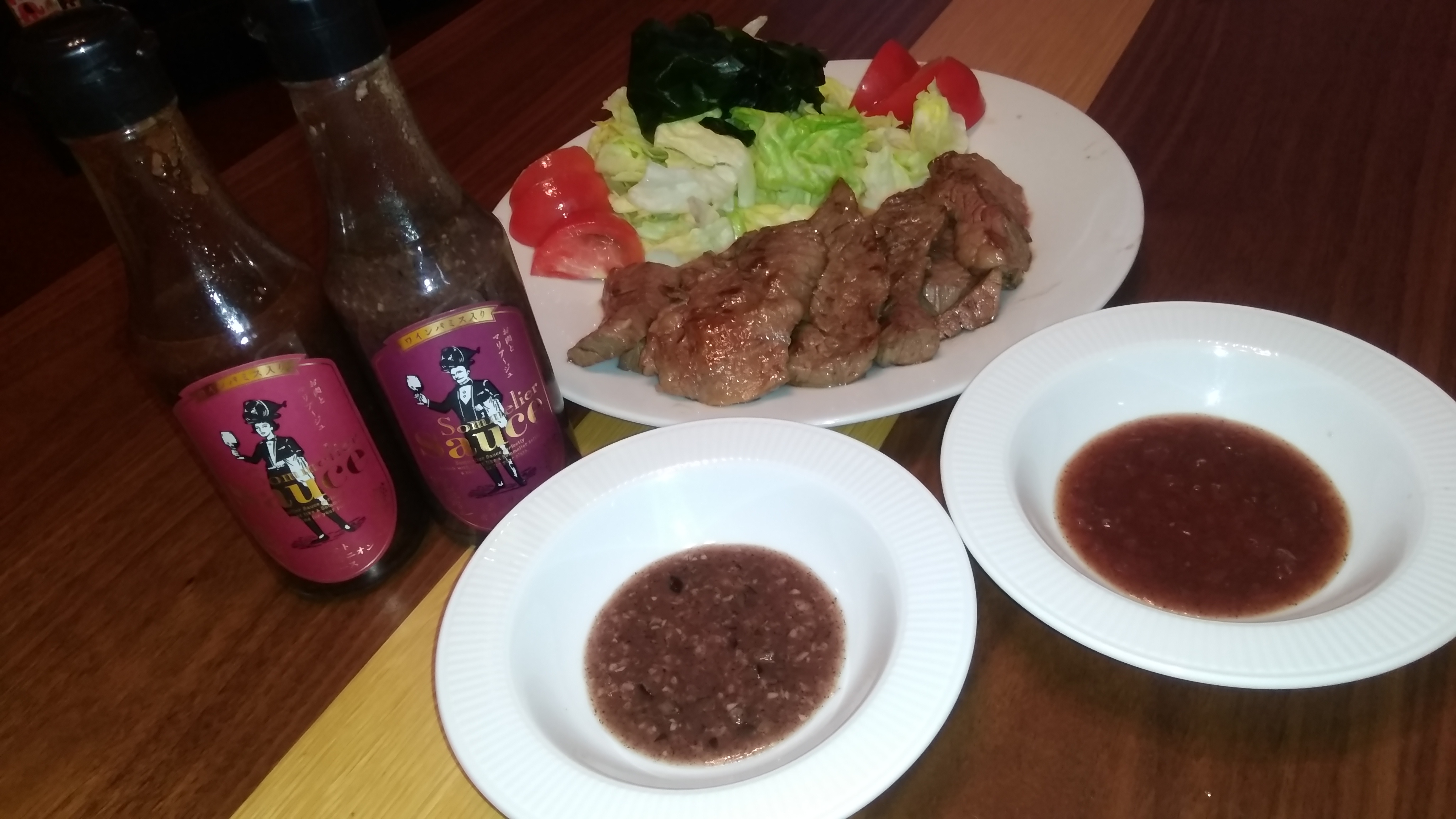 まずは夕食にお肉を焼き、サラダを添えて、2種類のソースを使ってみました。お肉には「ガーリックオリーブソース」、サラダには「トマトレモンオニオンソース」を。
