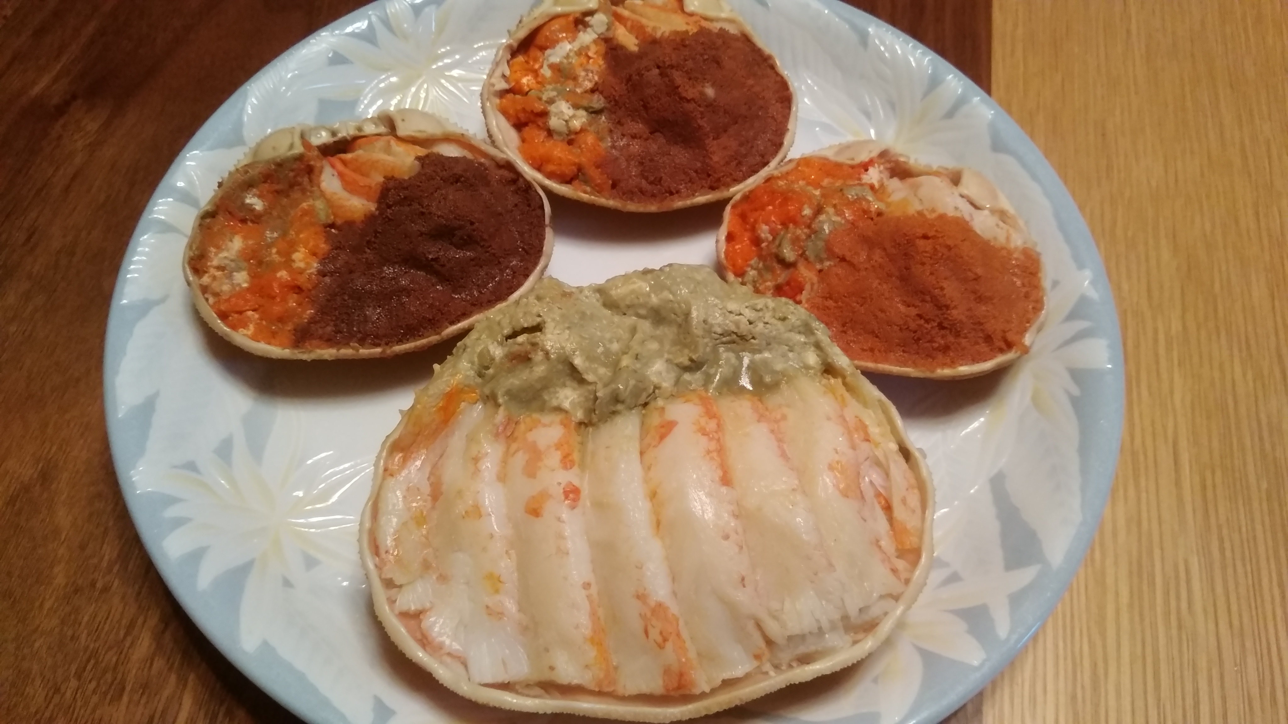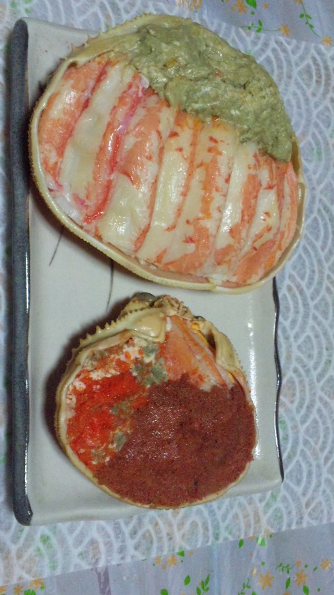 ズワイガニの甲羅盛りは、脚身の下には、腹身、カニ味噌がタップリと入っています。セコ蟹・蟹の宝船は、脚身、外子の下には、朱色の内子、腹身が入っています。